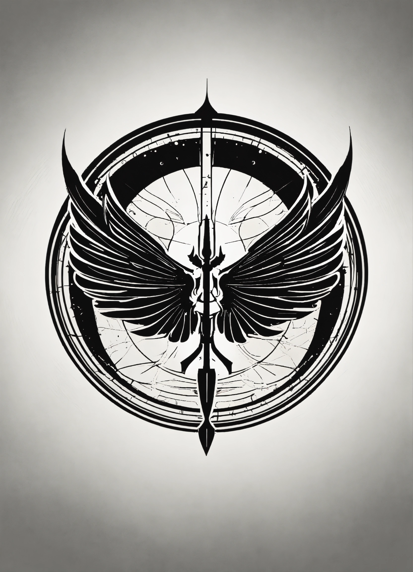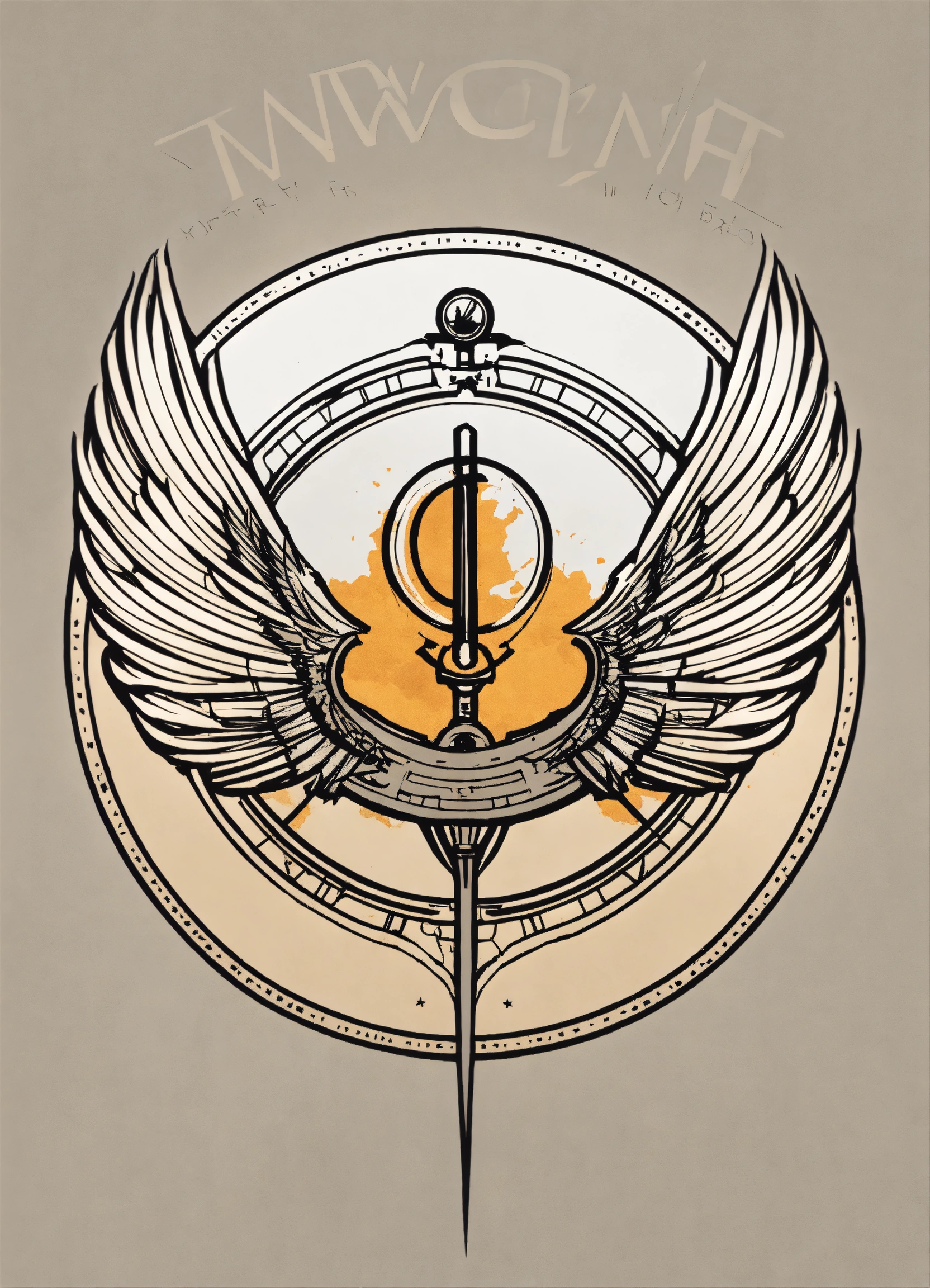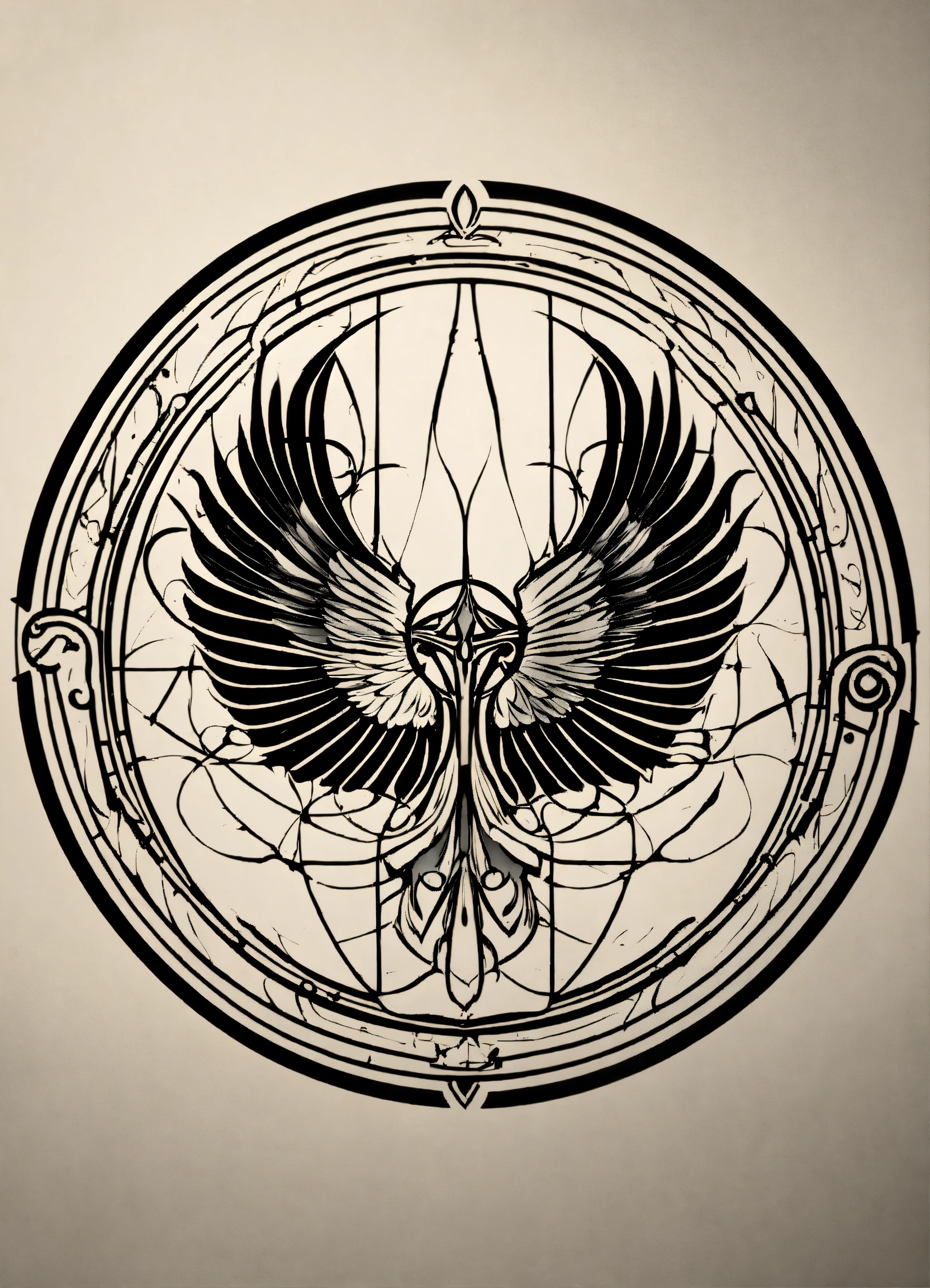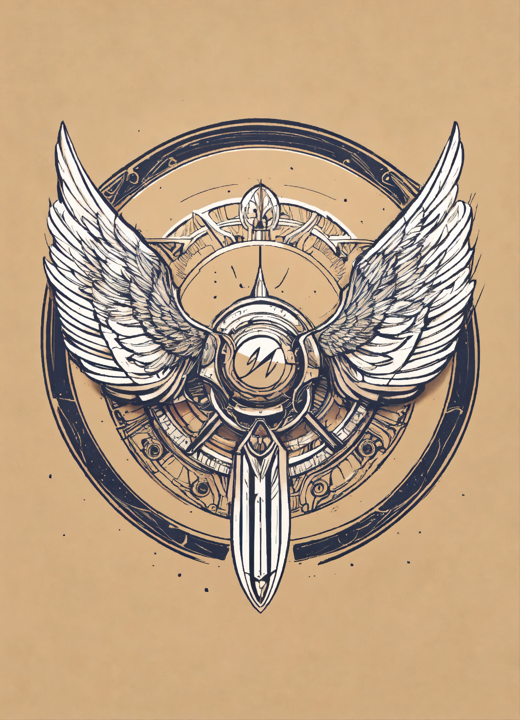 Abstract line art wing logo, in a round, stamped design. like air force, gothic, mechanical, feather, metal, large elvish
