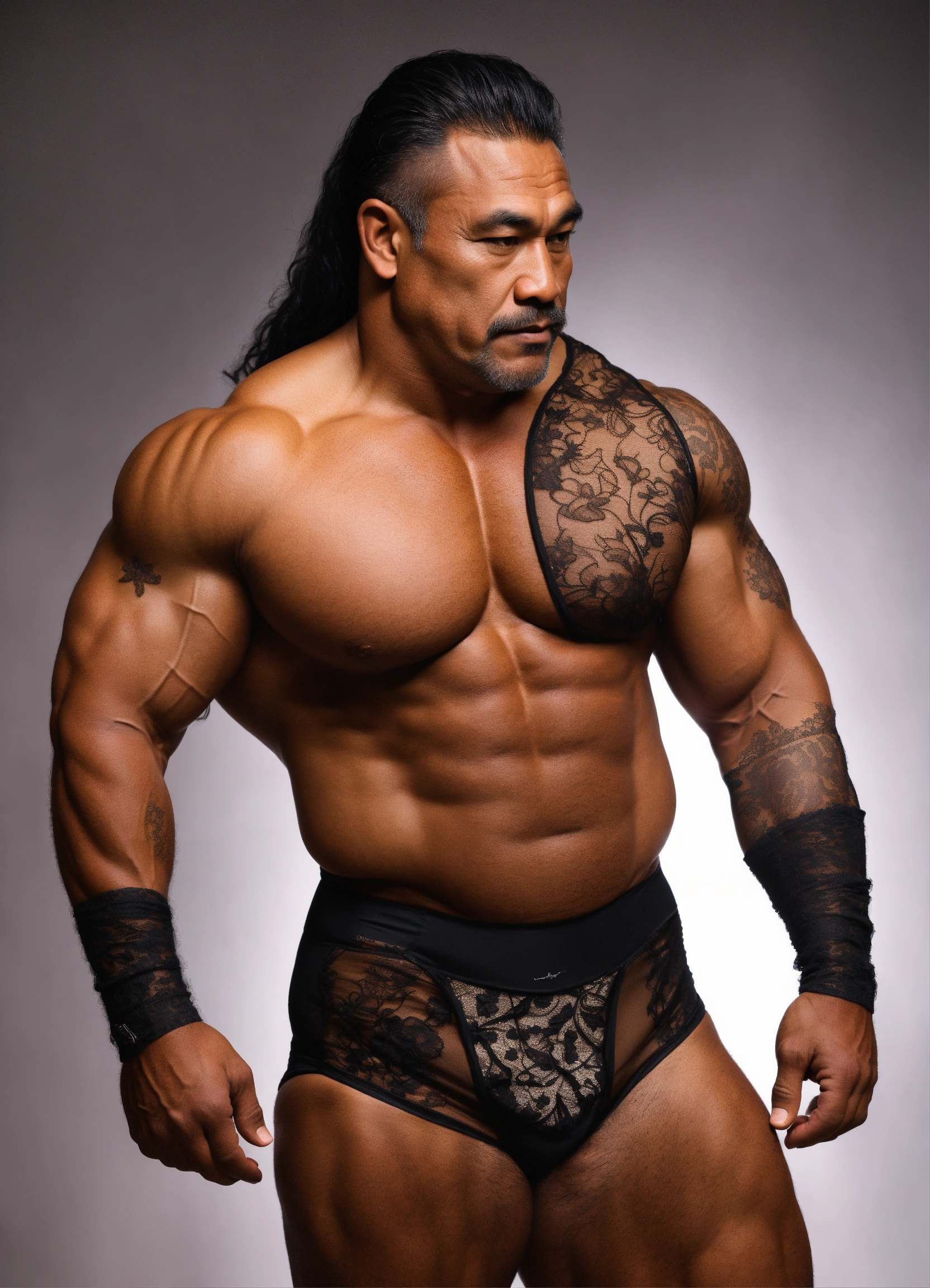 A full picture of a handsome middle age samoan bodybuilder warrior wearing a sheer lace leotard and stockings on legs, detailed.