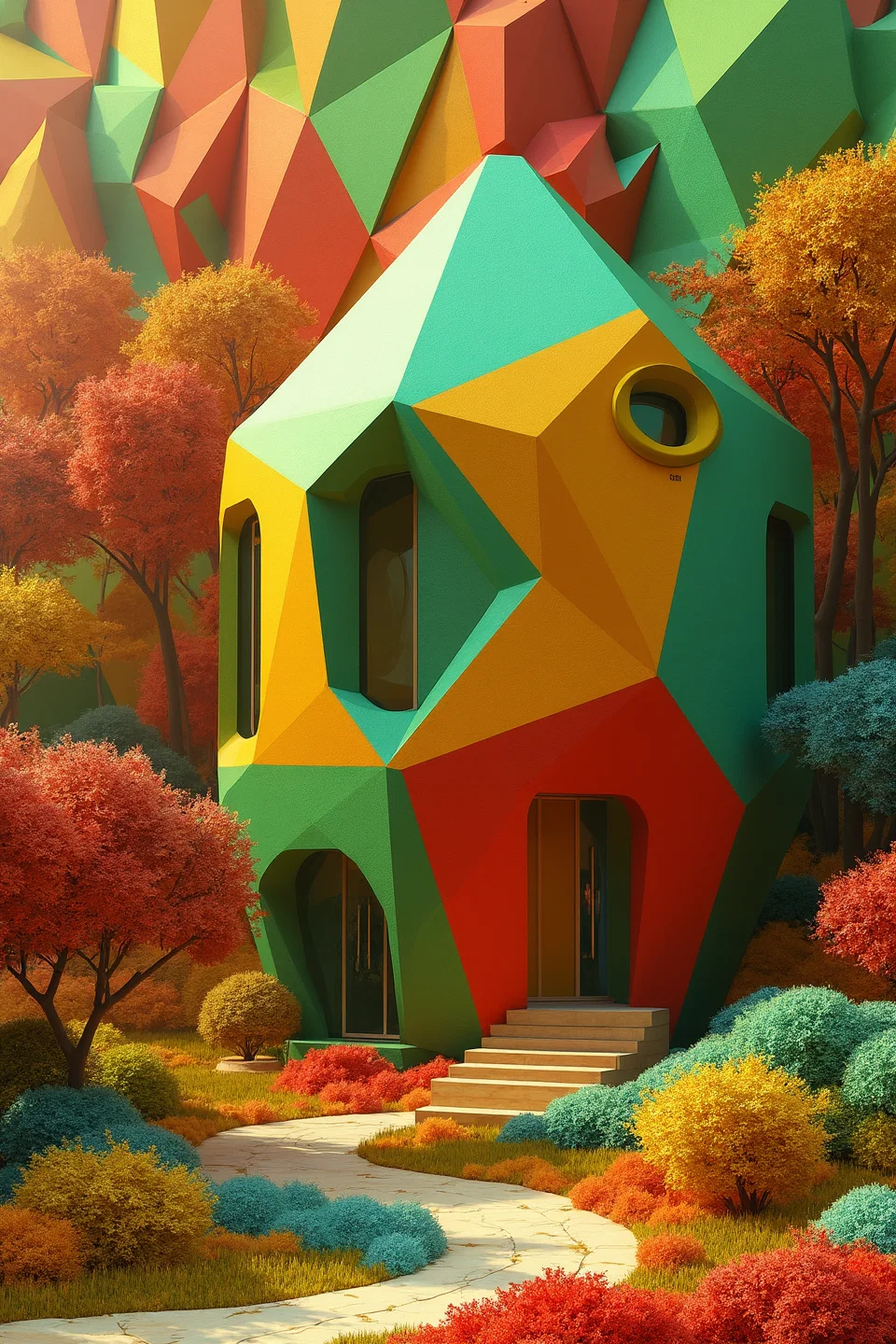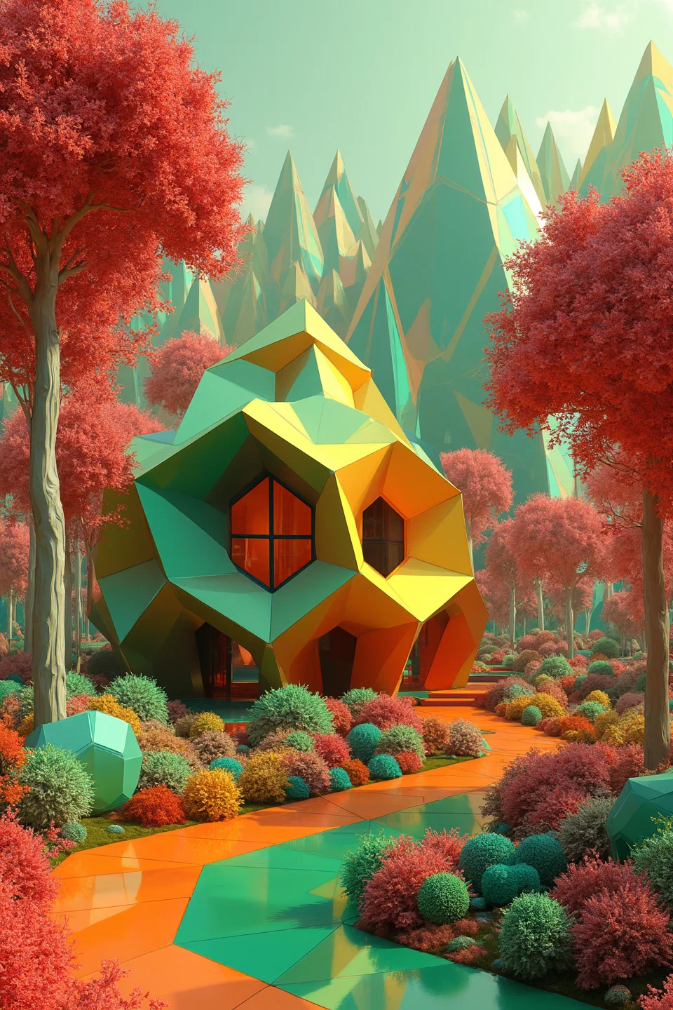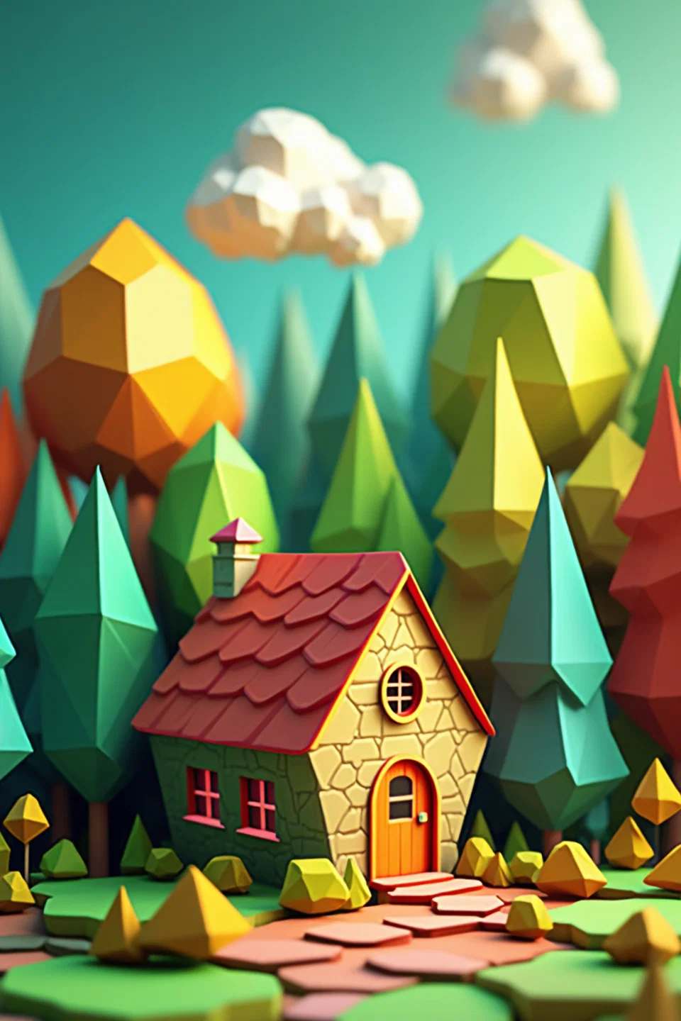 A 3d house made with pentagons and hexagons, next to a forest made with triangles. red, green, yellow, blue and orange colors that make the figures stand out.