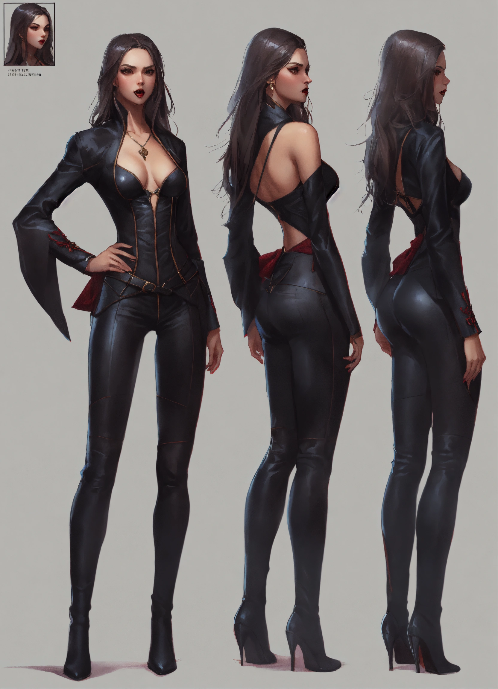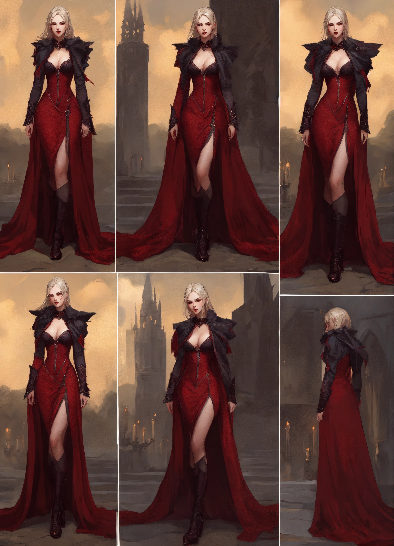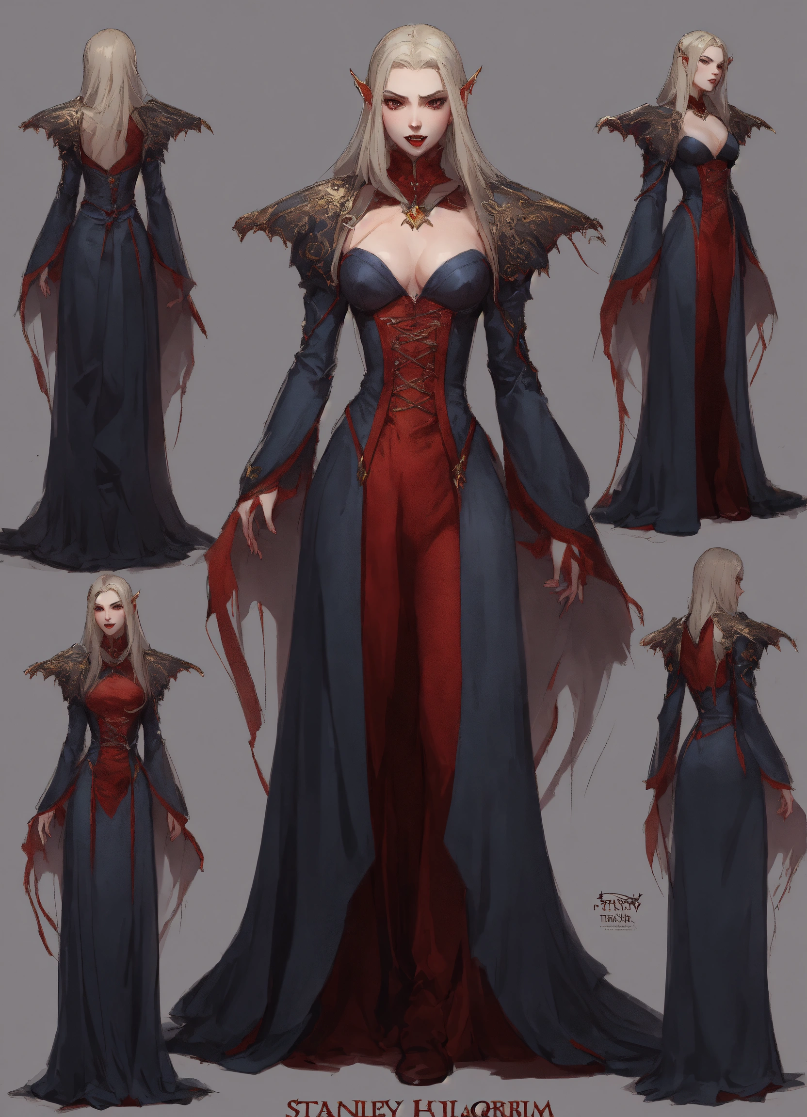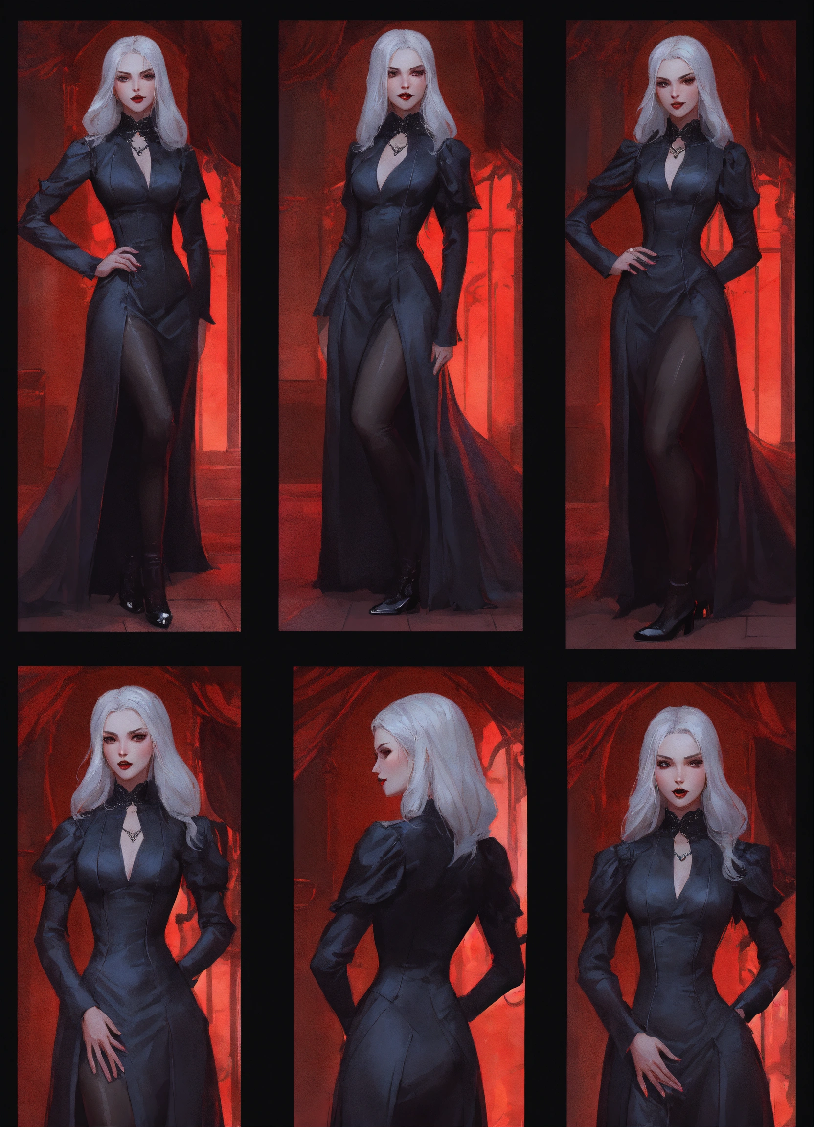 Vampire queen evil upset wearing a dress with straight hair, skinny, thin frame, pettitte, flat chested, character sheet, character design, multiple views, high detail, fine details, stanley artgerm lau, wlop