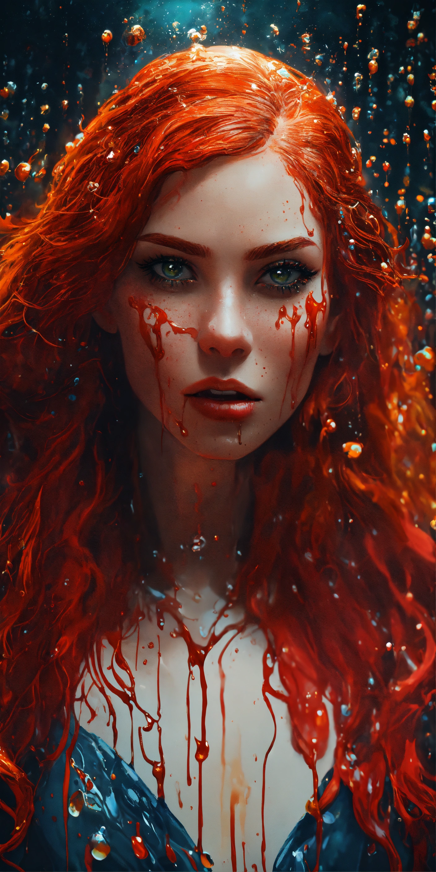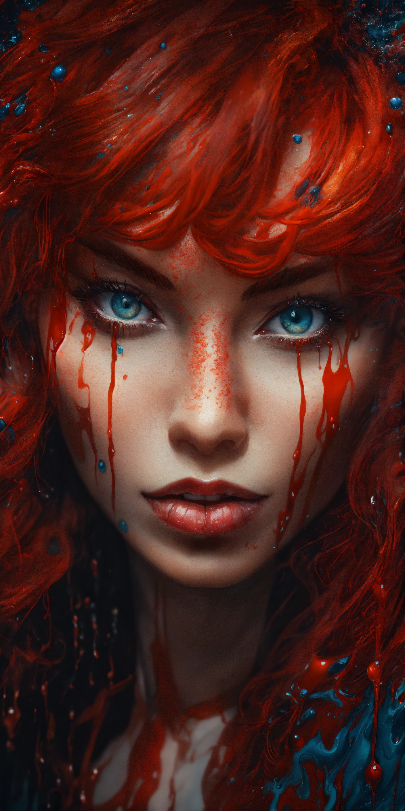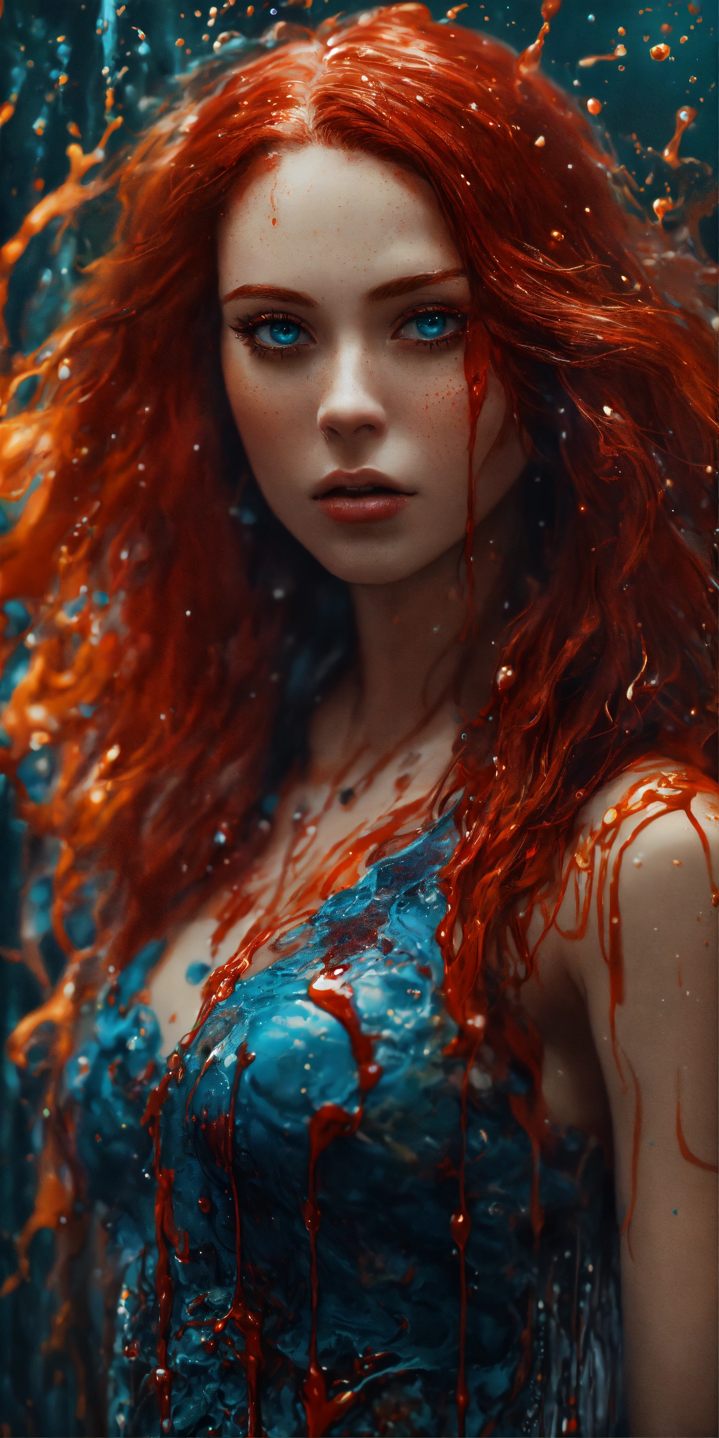 Unsplash art, a quirky liquid portrait of a hauntingly beautiful vampire woman with red hair, splash style of paint, pixar style, hyper detailed intricately detailed, fantastical, intricate detail, splash screen, liquid, gooey, slime, splashy, fantasy, concept art, 8k resolution, masterpiece, melting, complex background, intricate detailed, dark colors, fantasy, concept art, digital art, intricate, oil on canvas, masterpiece, expert, insanely detailed, 4k resolution.