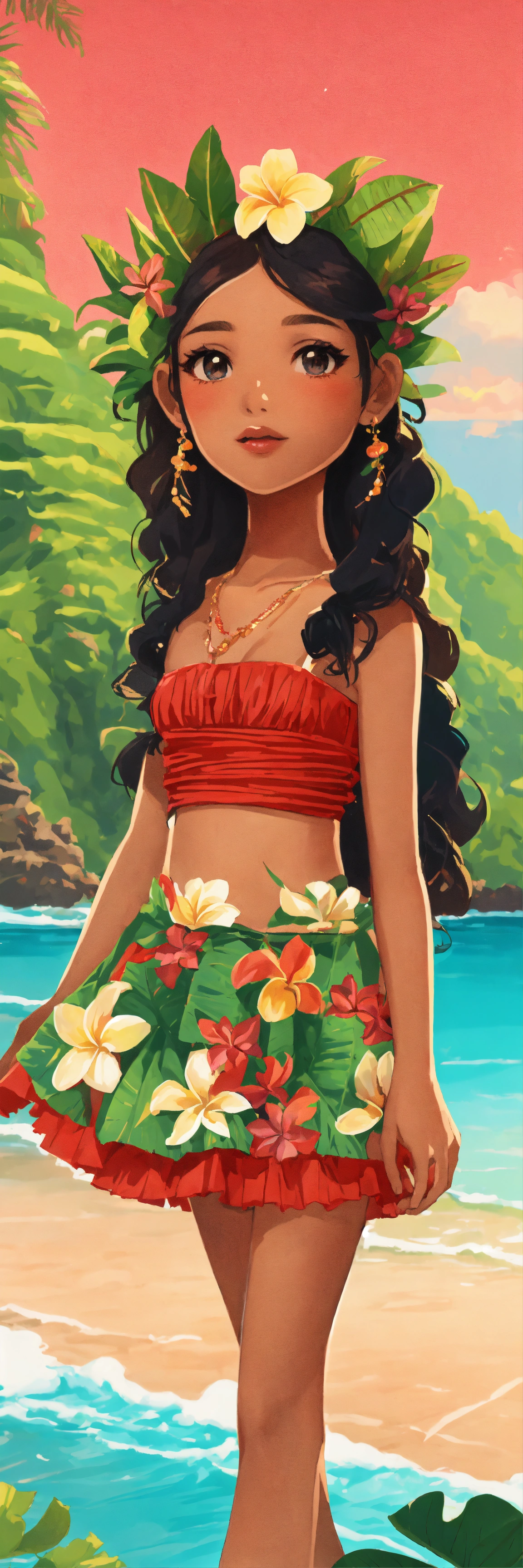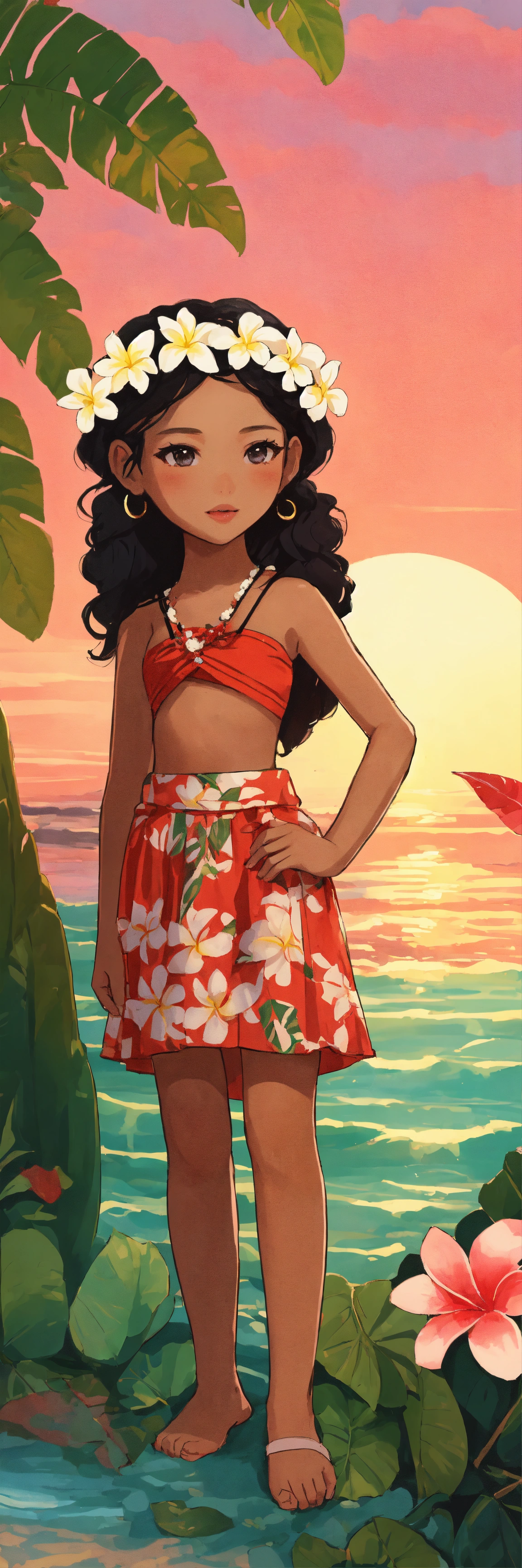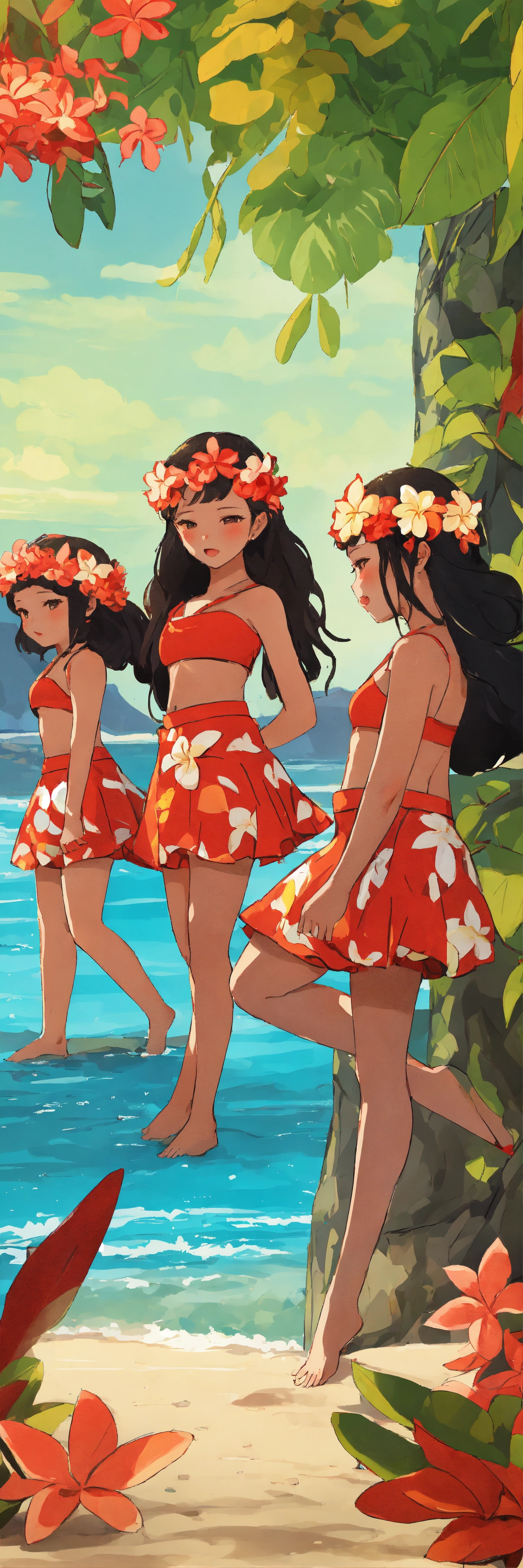 Illustration of three girls, little girls wearing a plumeria headdress on their head, red tube tops and leaf skirts, they are wearing a skirt made of leaves, a dreamy gaze, the background is hawaii sea, black hair, 4k, 8k, asian beauty, moani, die cut sticker