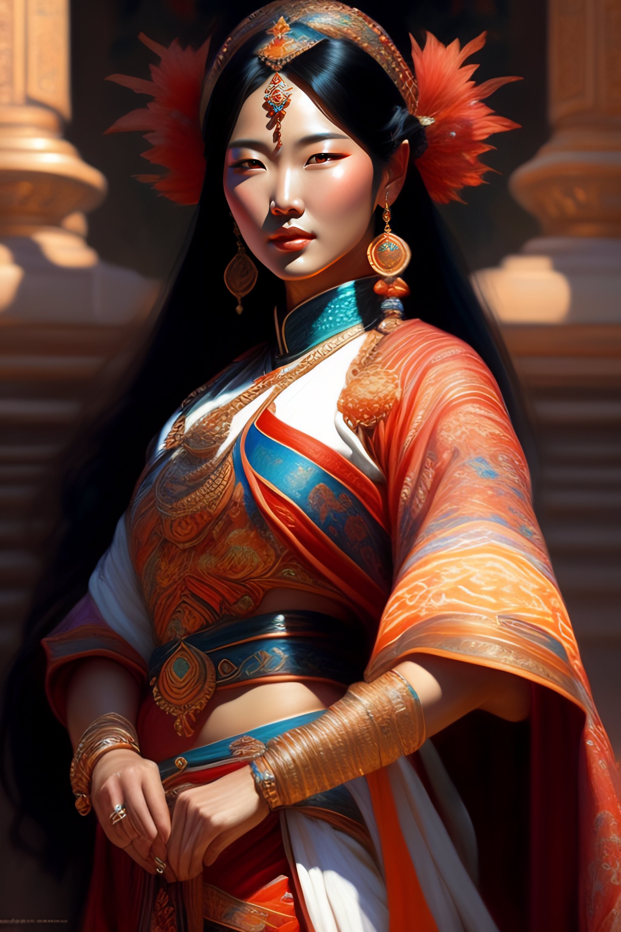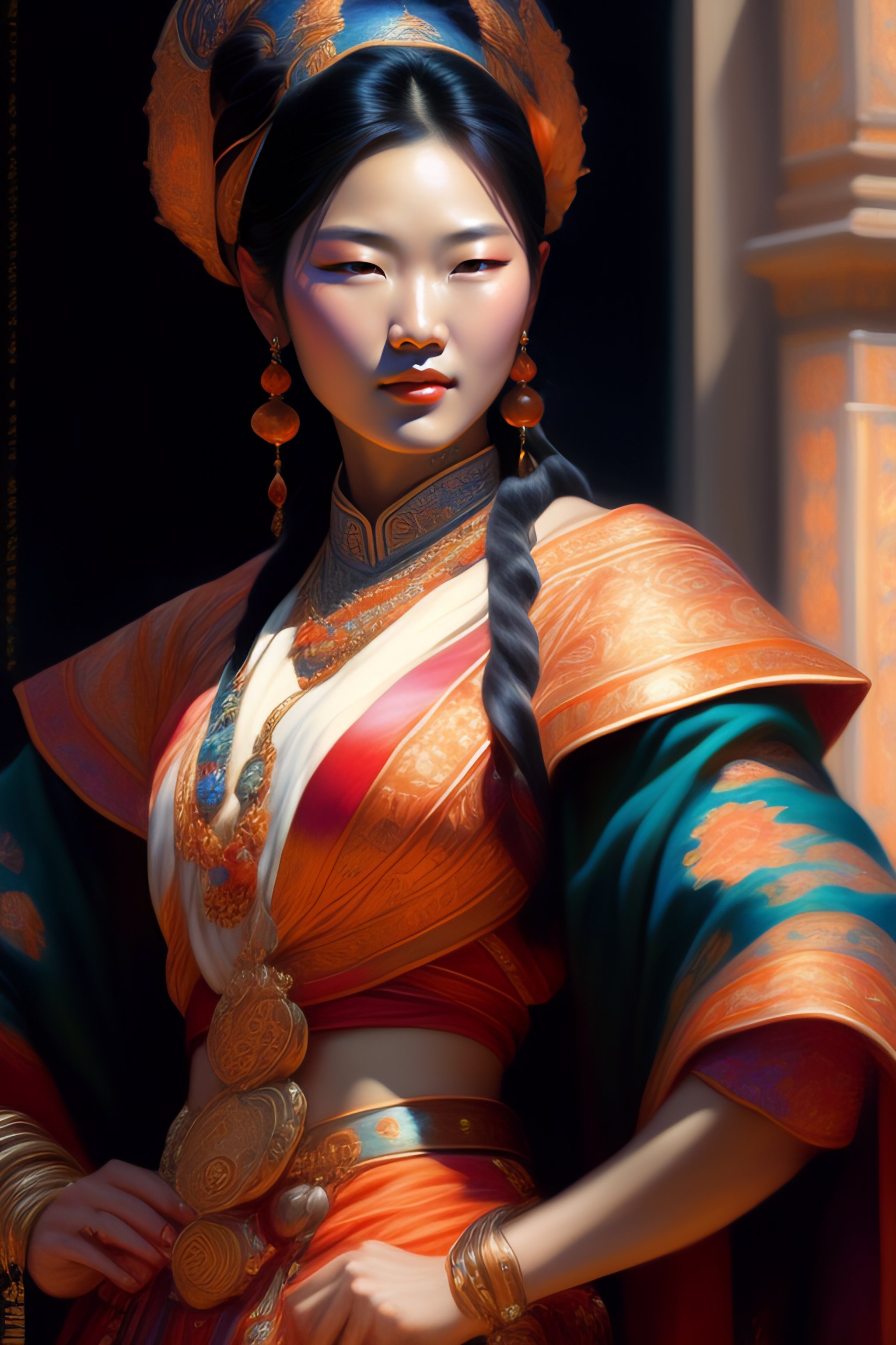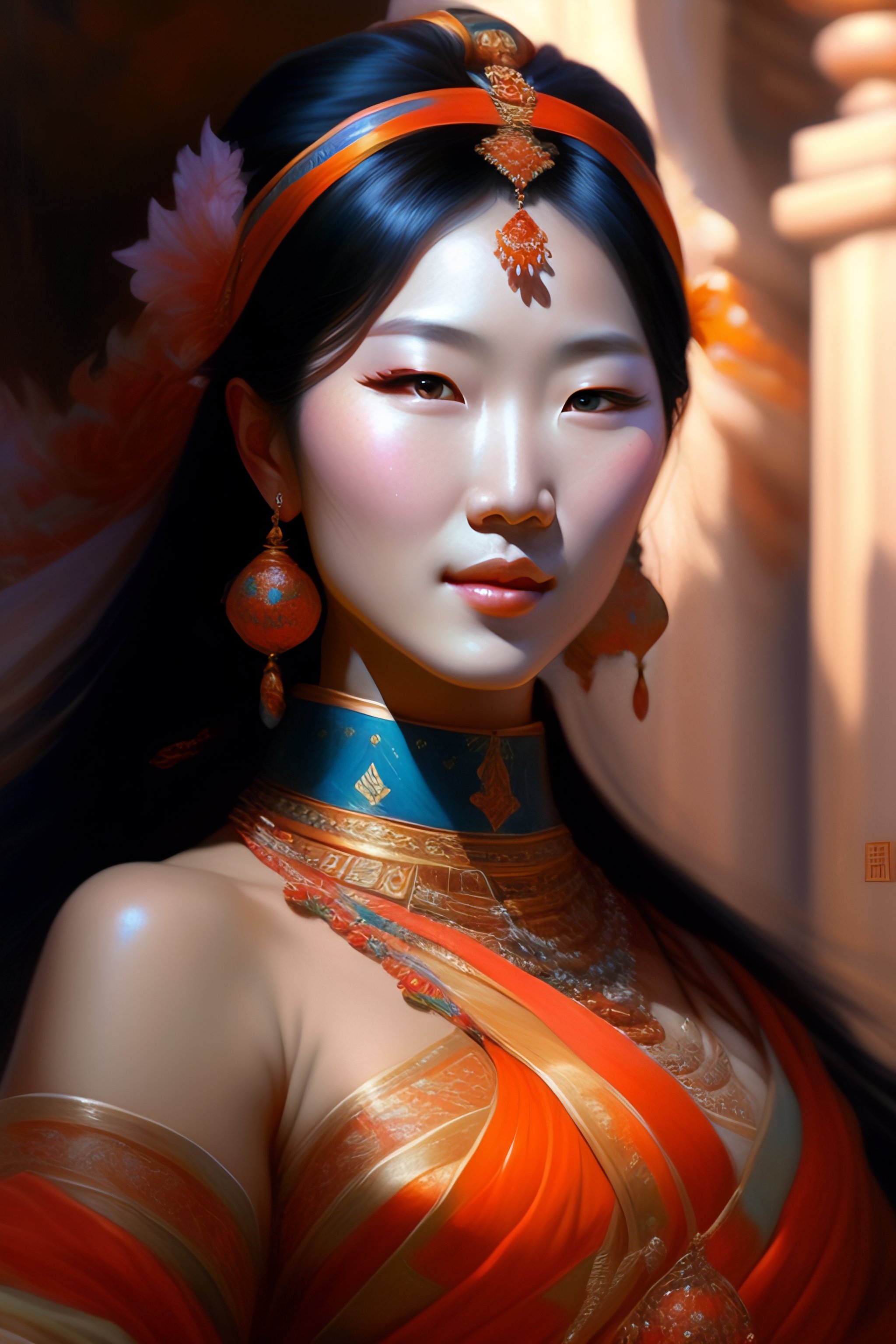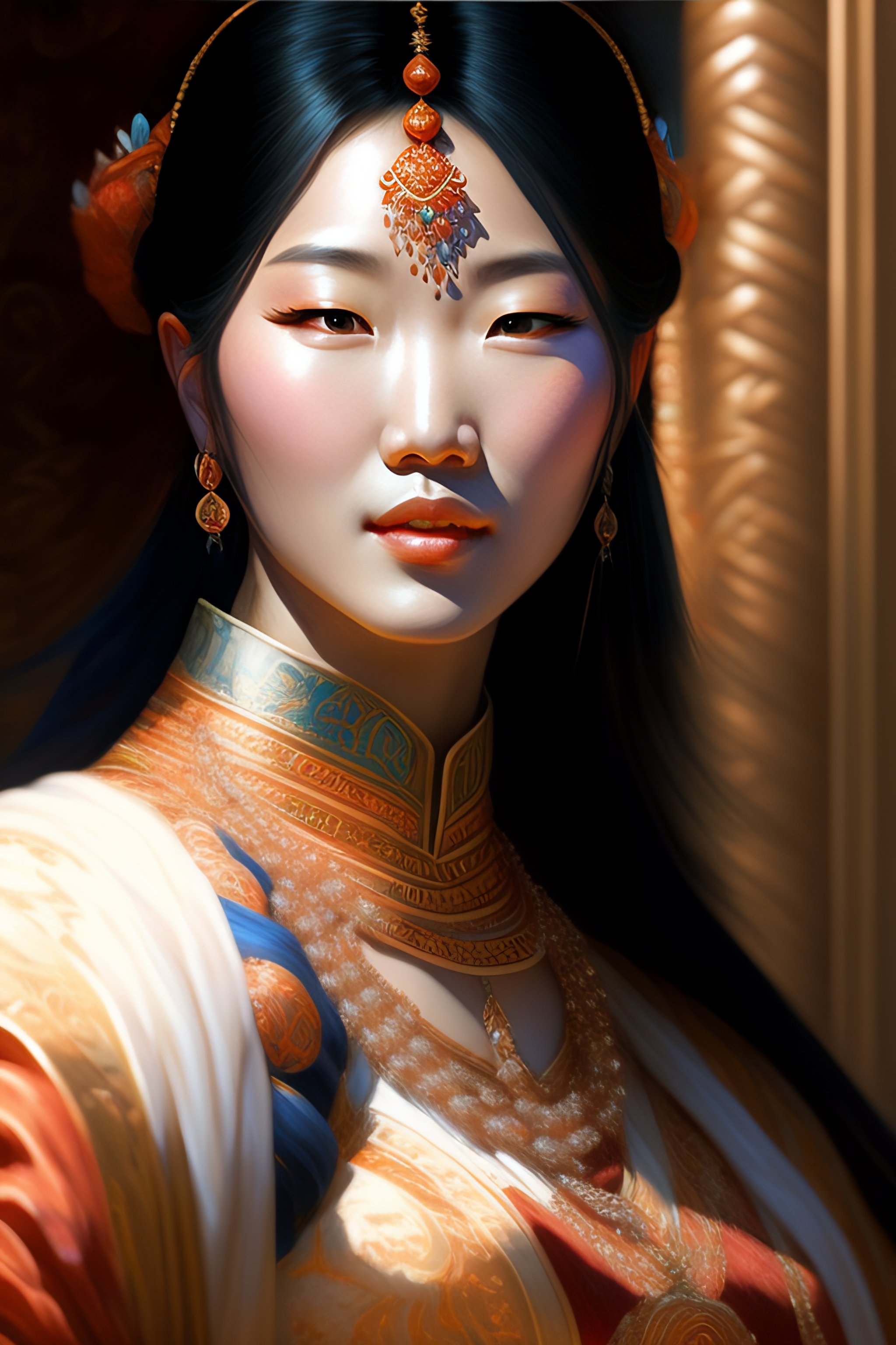 Detailed paint of korean goddess, highly detailed paiting by gaston bussiere, craig mullins, j.c. leyendecker, 8k, royal paiting, dynamic lighting, colorfull lighting