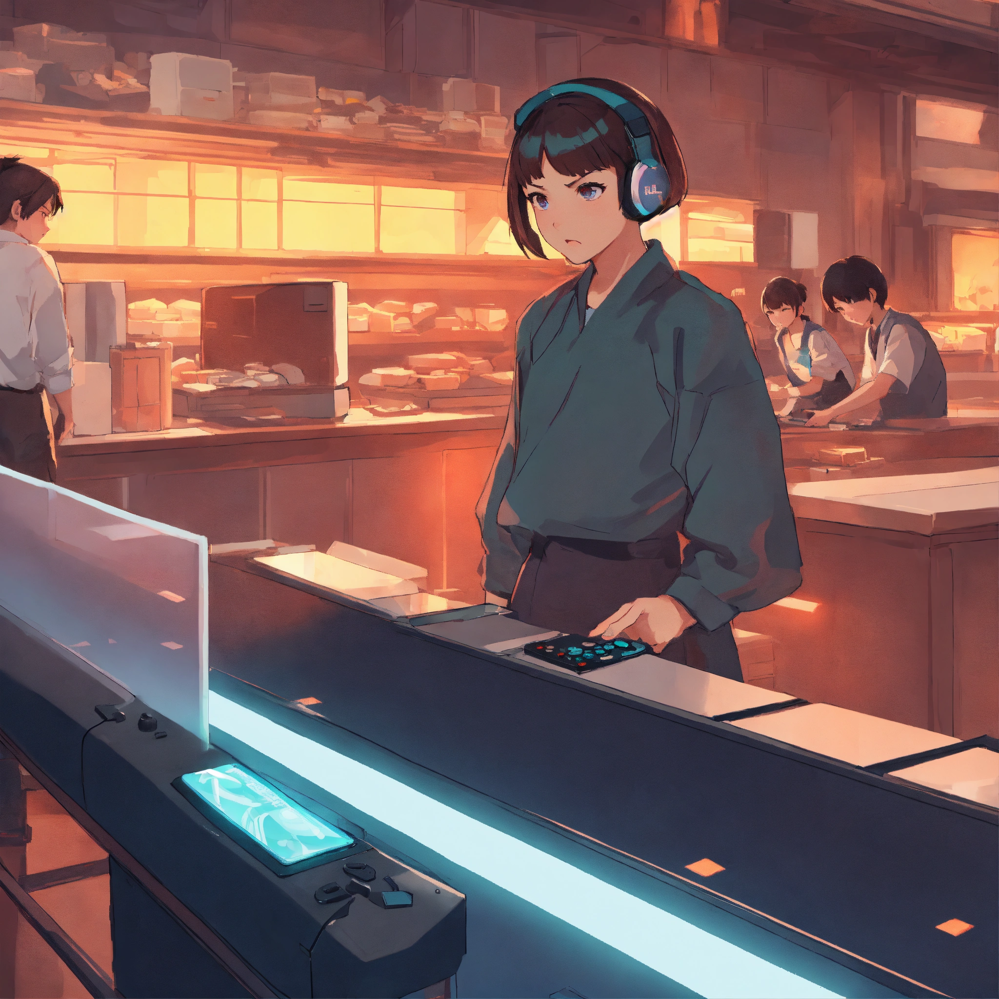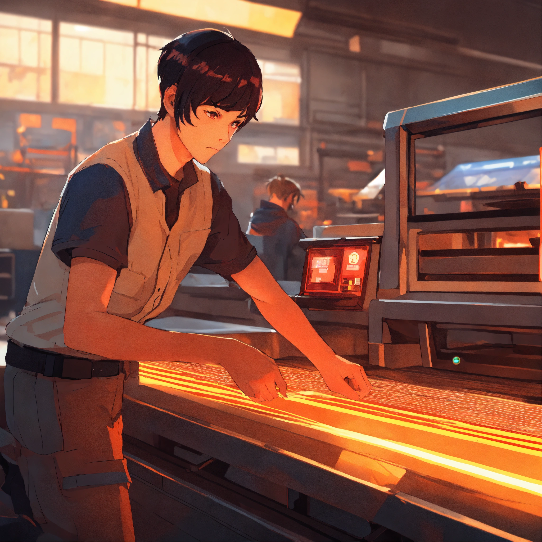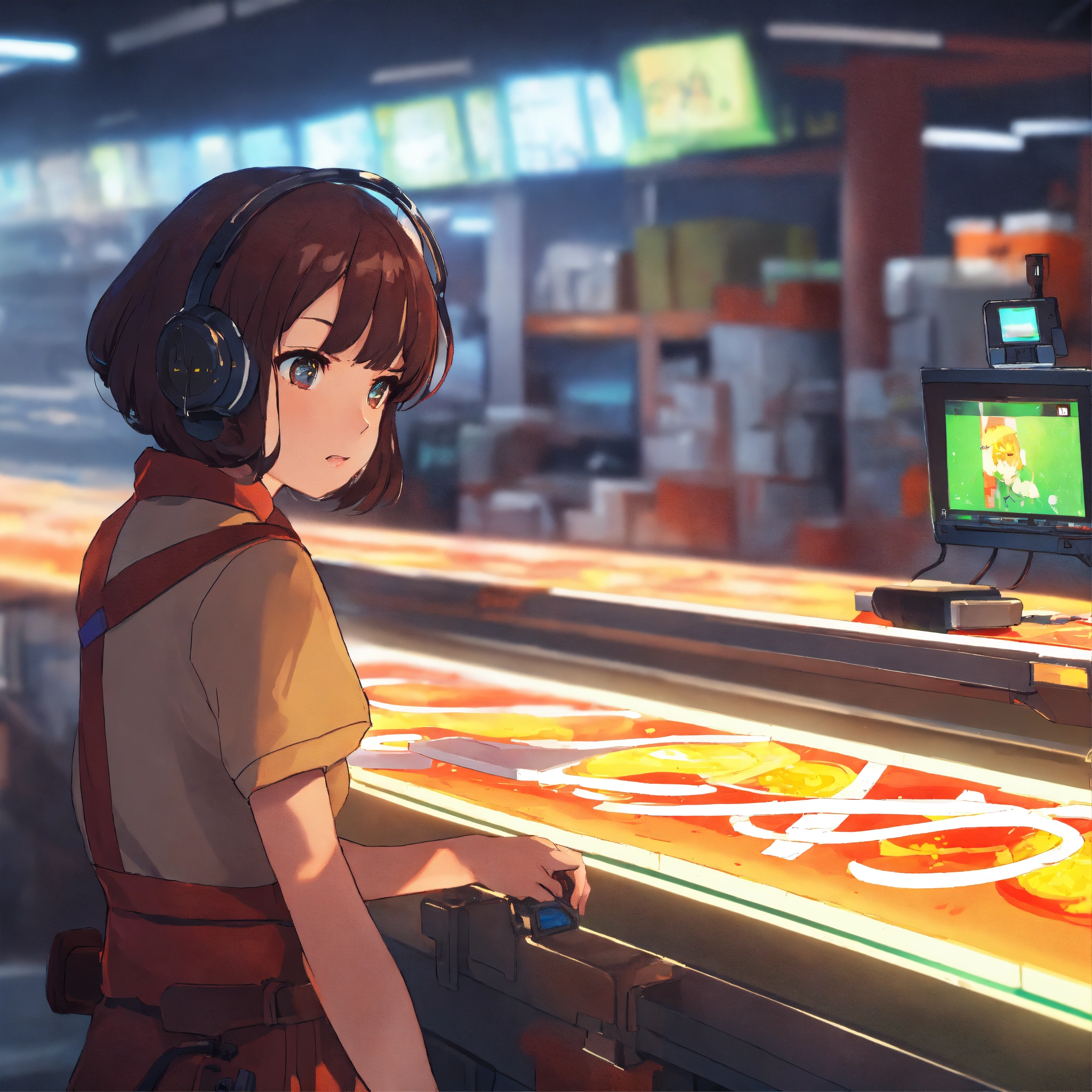 Conveyor tape, there is a glowing product on the tape, the controller looks at the product very angrily and attentively, wlop, kuvshinov