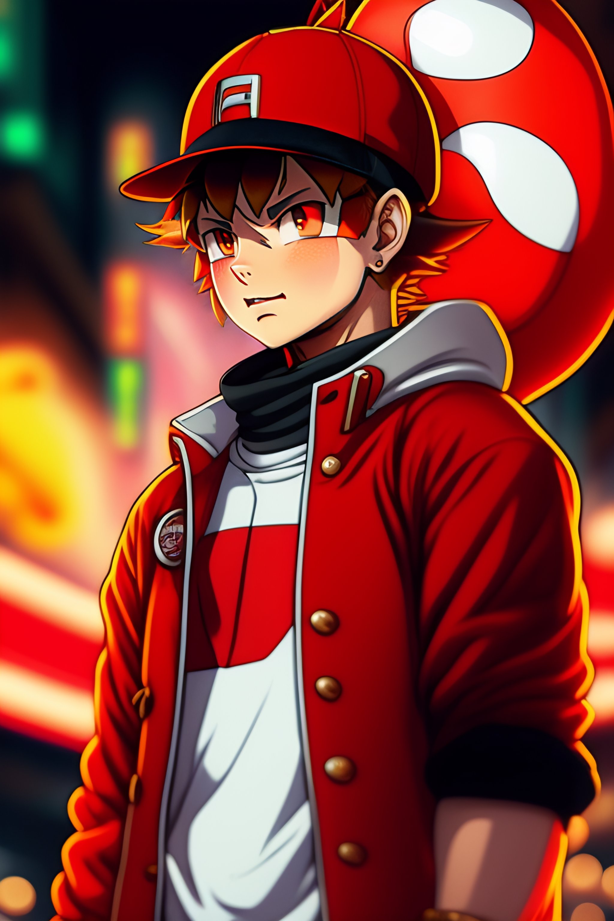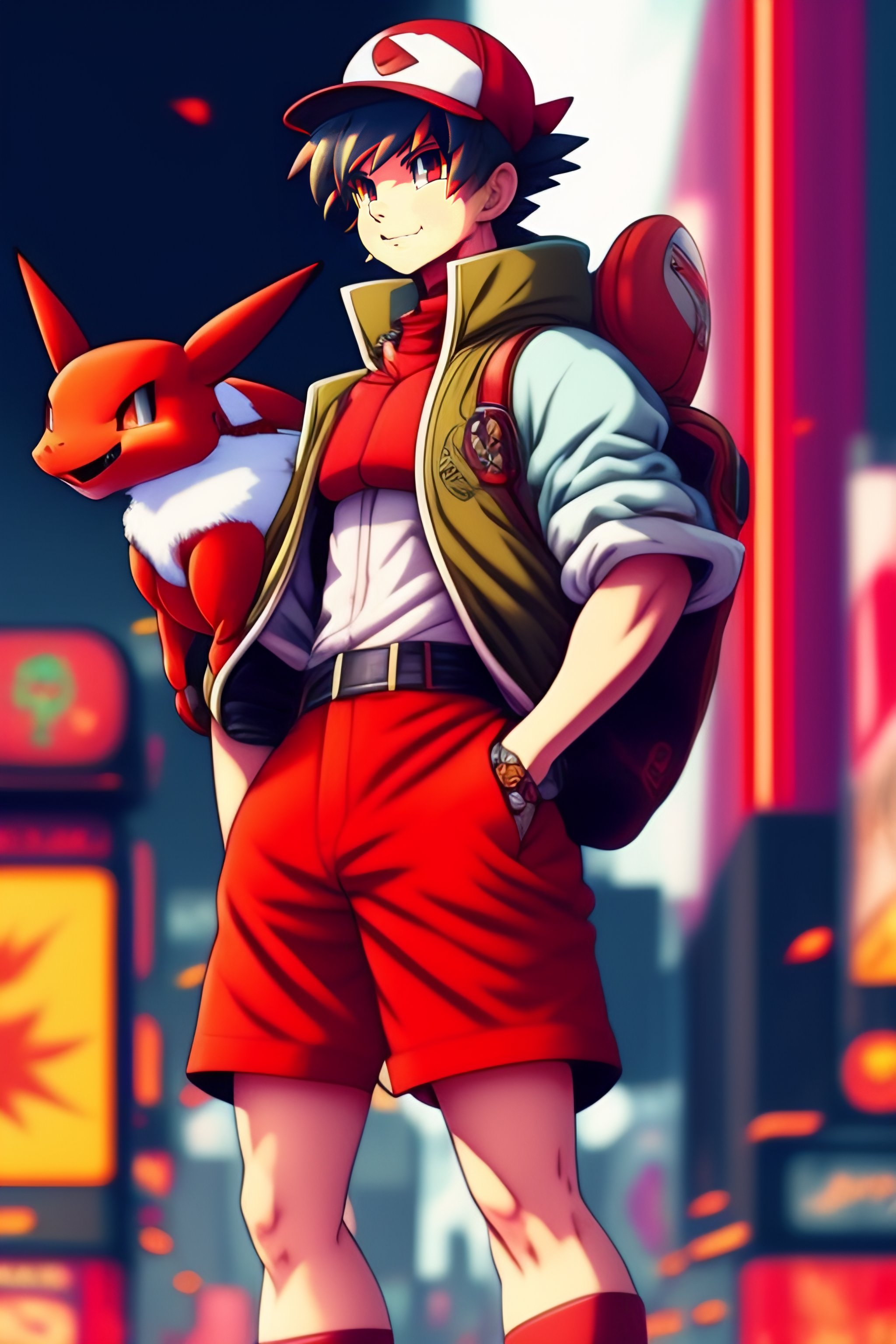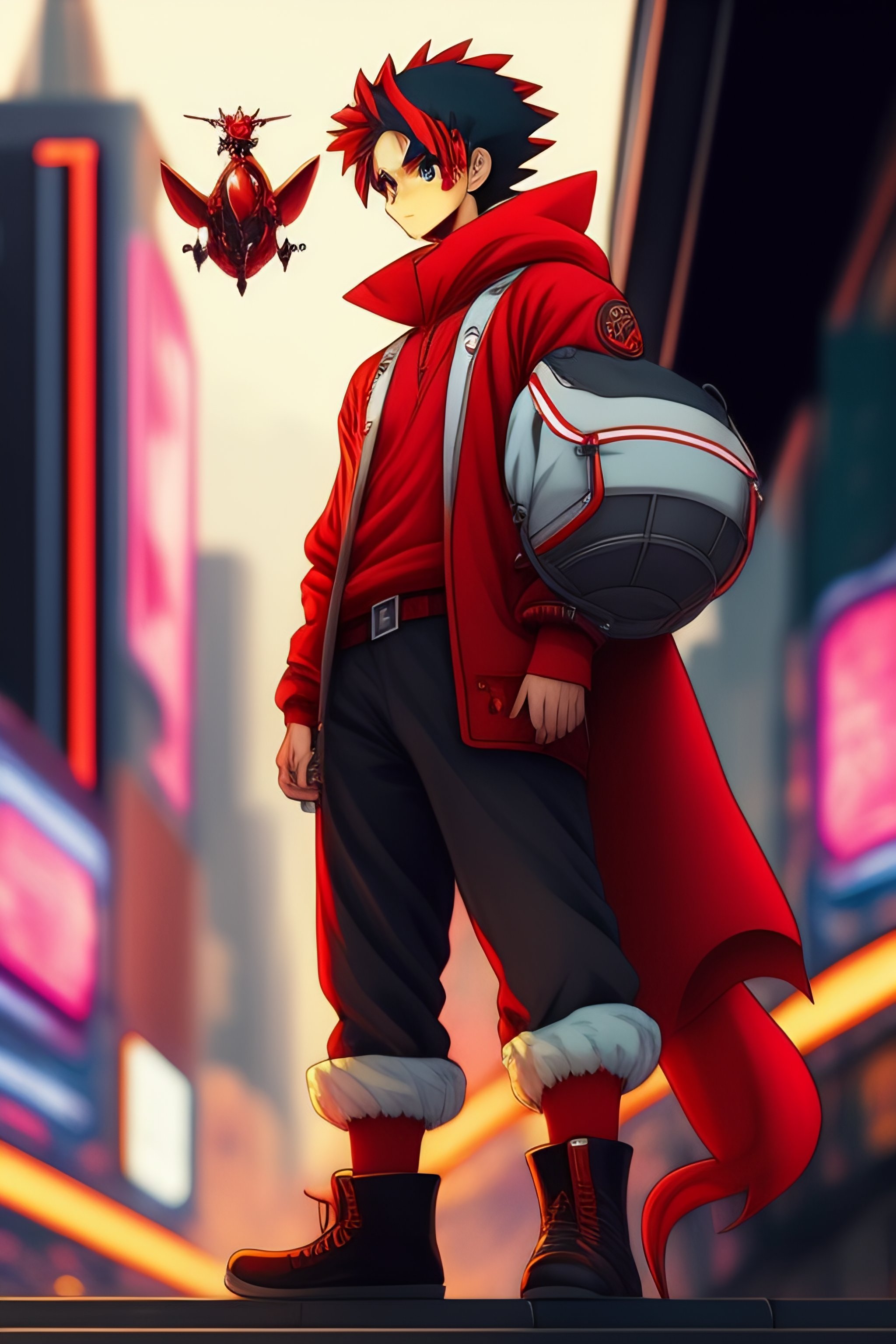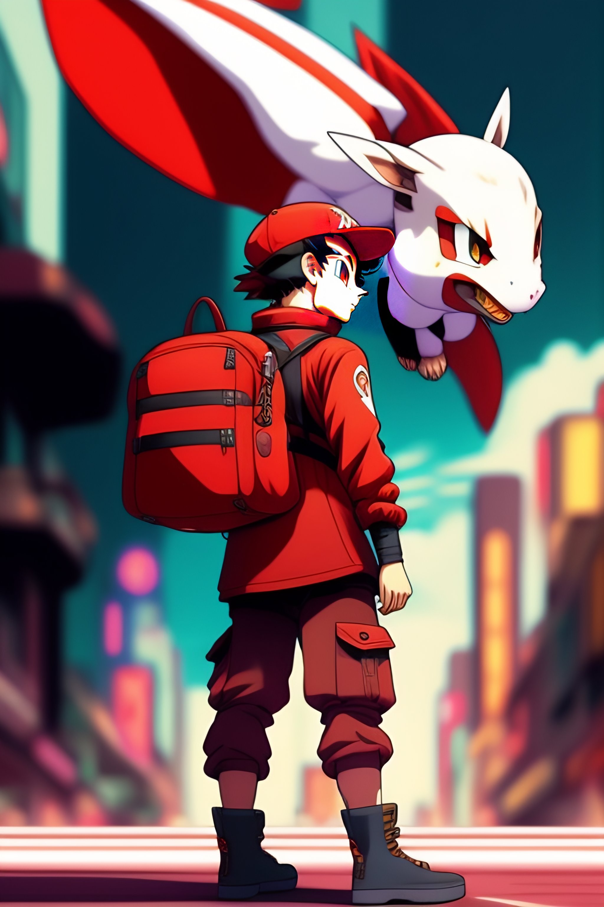 A picture of a full body male pokemon trainer in red and white with a flying charizard in a neo punk city, color full, highly detailed, vintage, sci-fi. line art. environmental arcade art. manga, akira toriyama