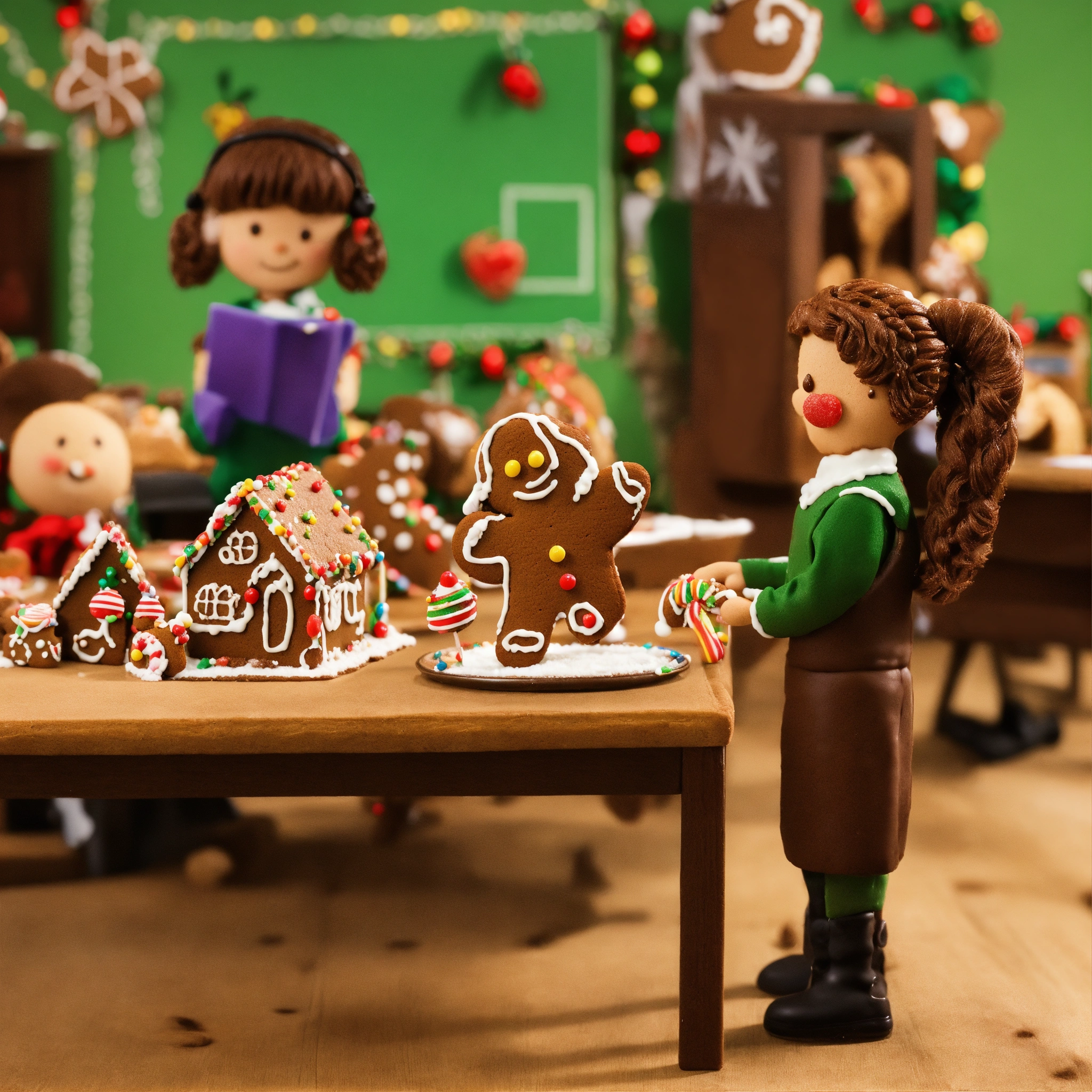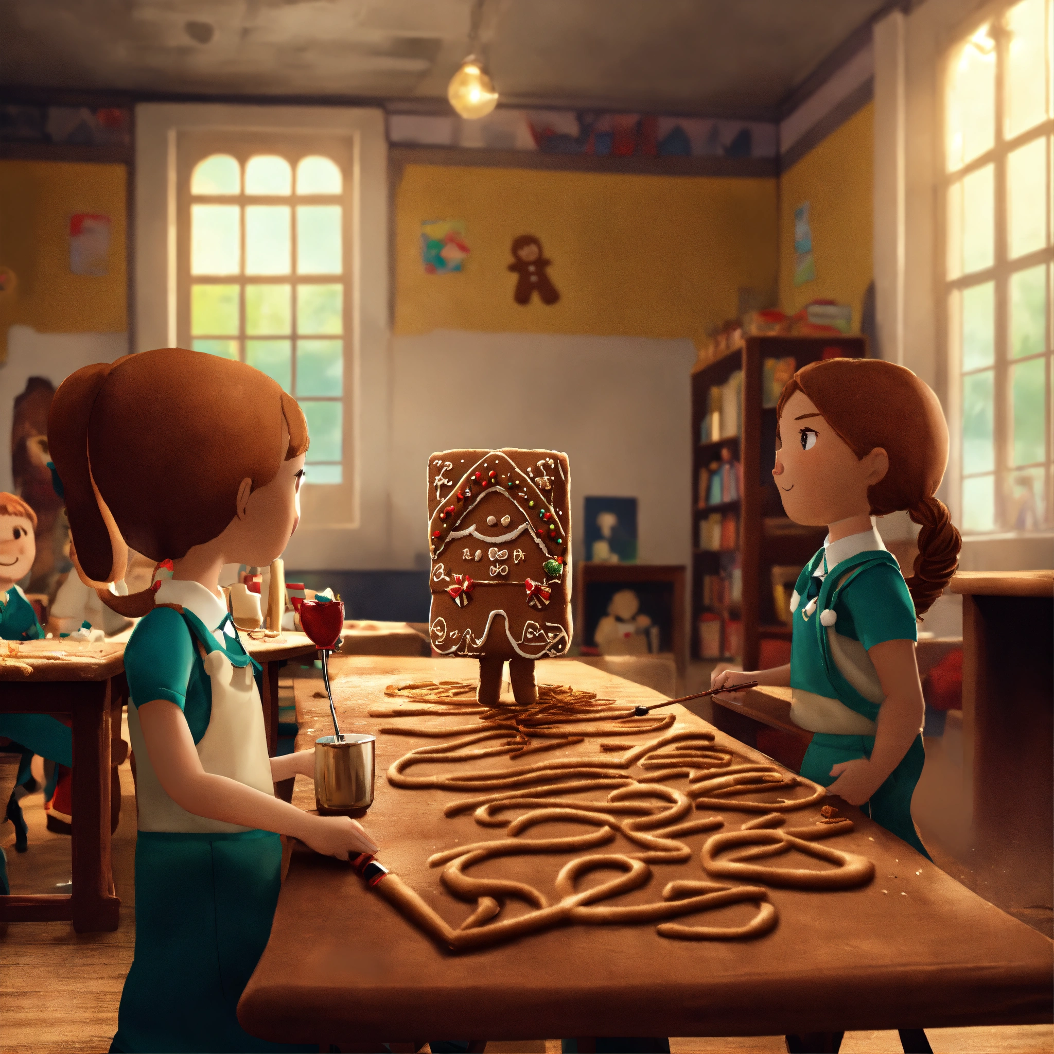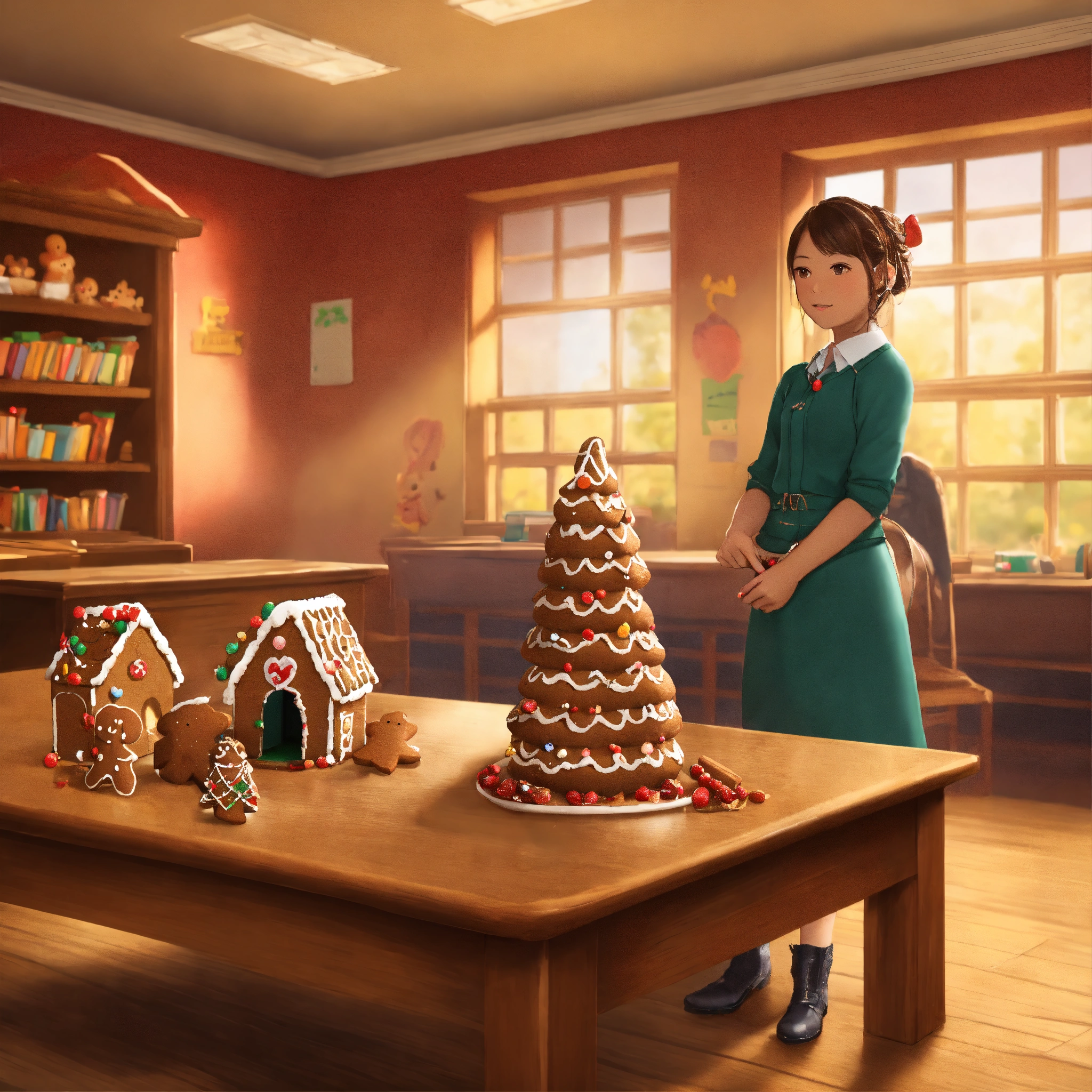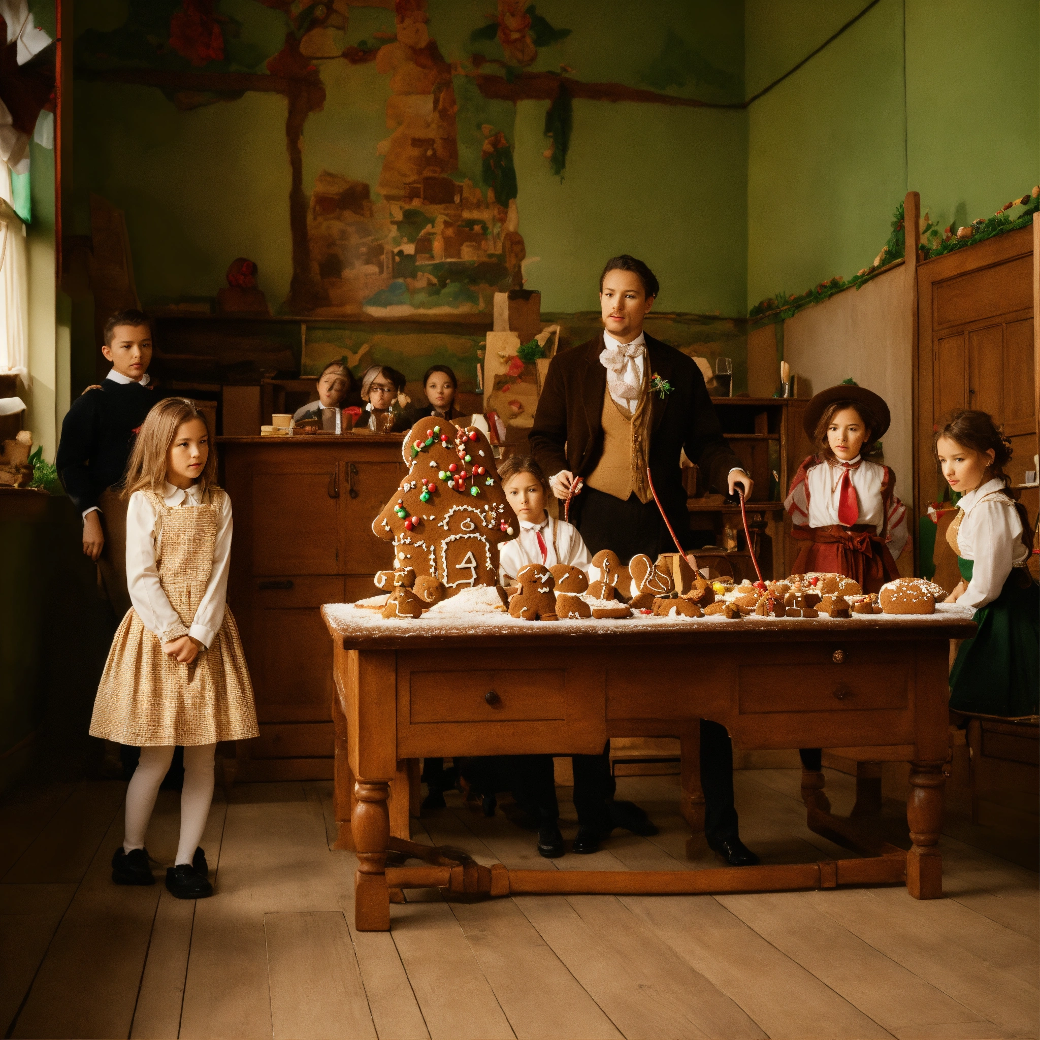 A whip and a gingerbread on the table, the class sitting in front of the desk, the teacher standing behind