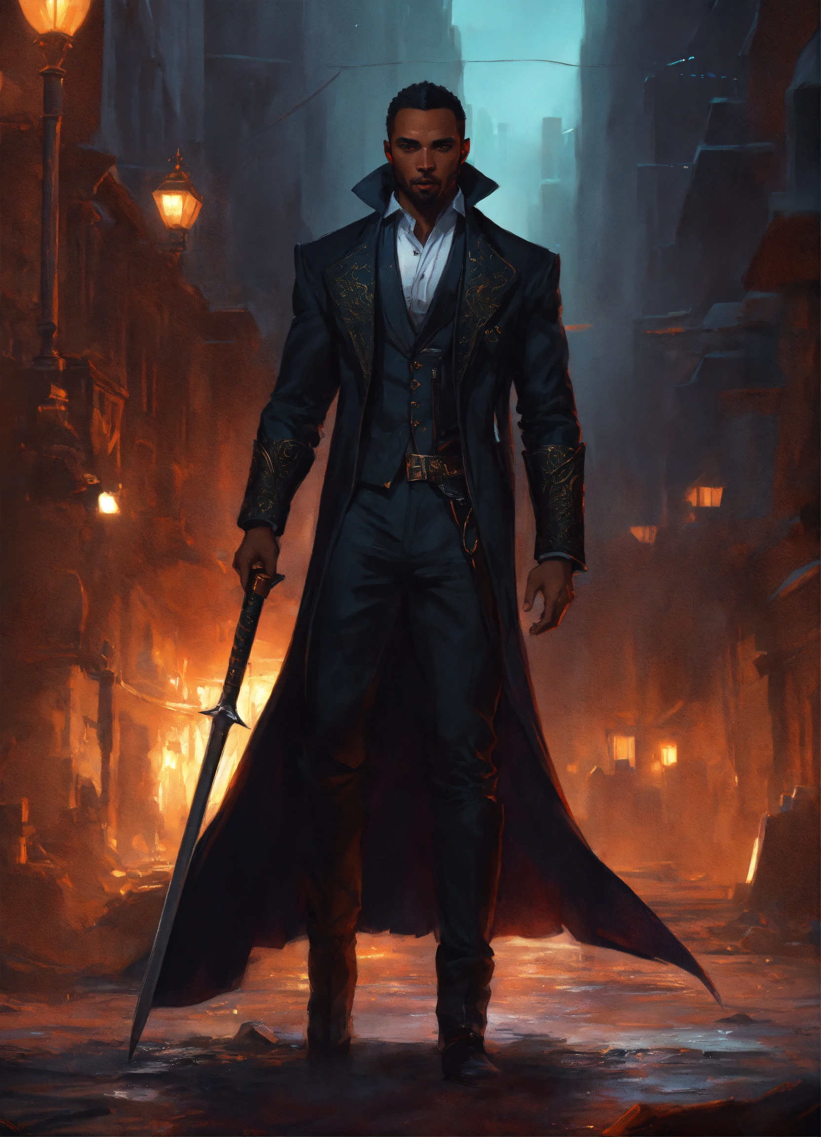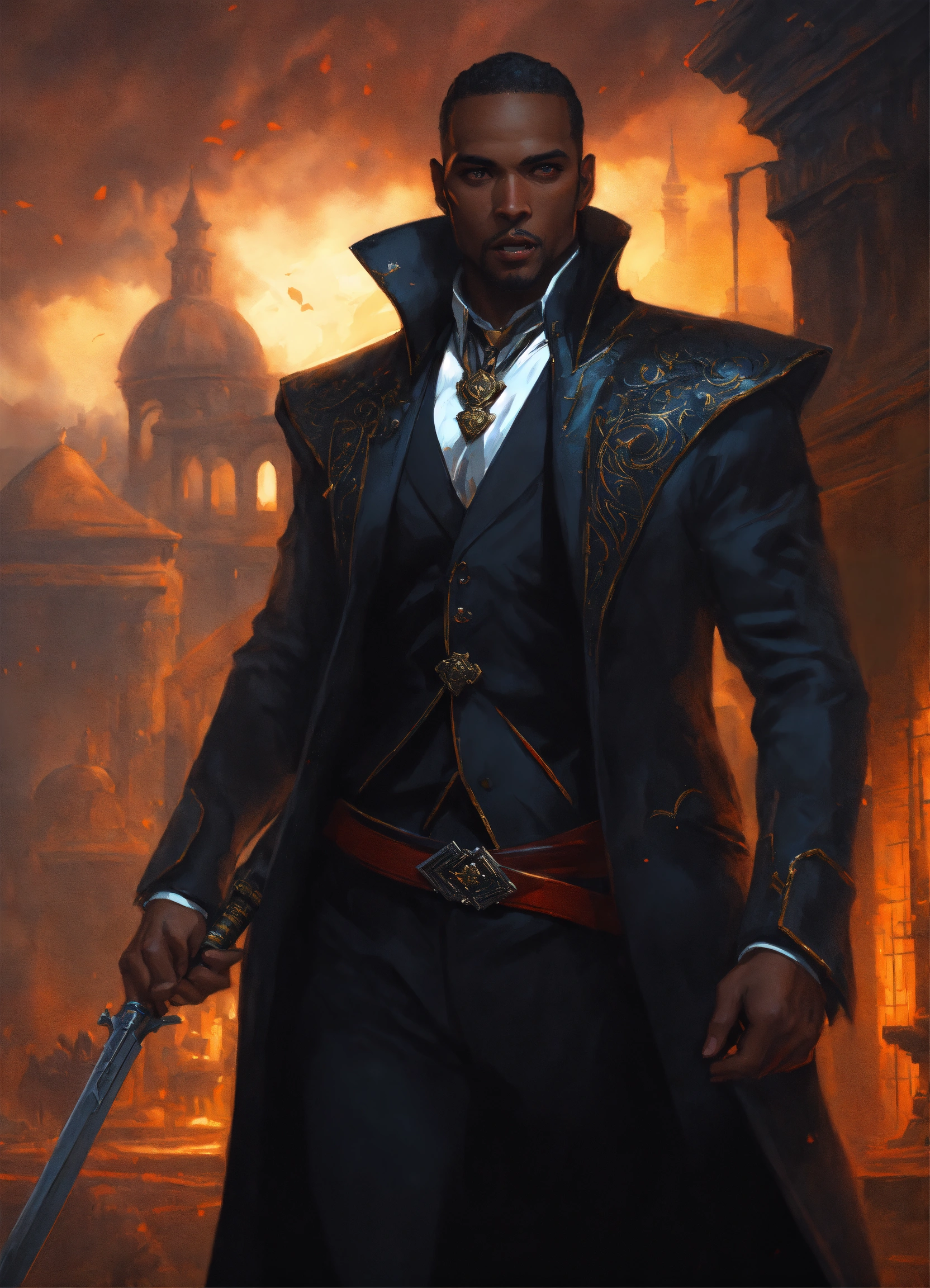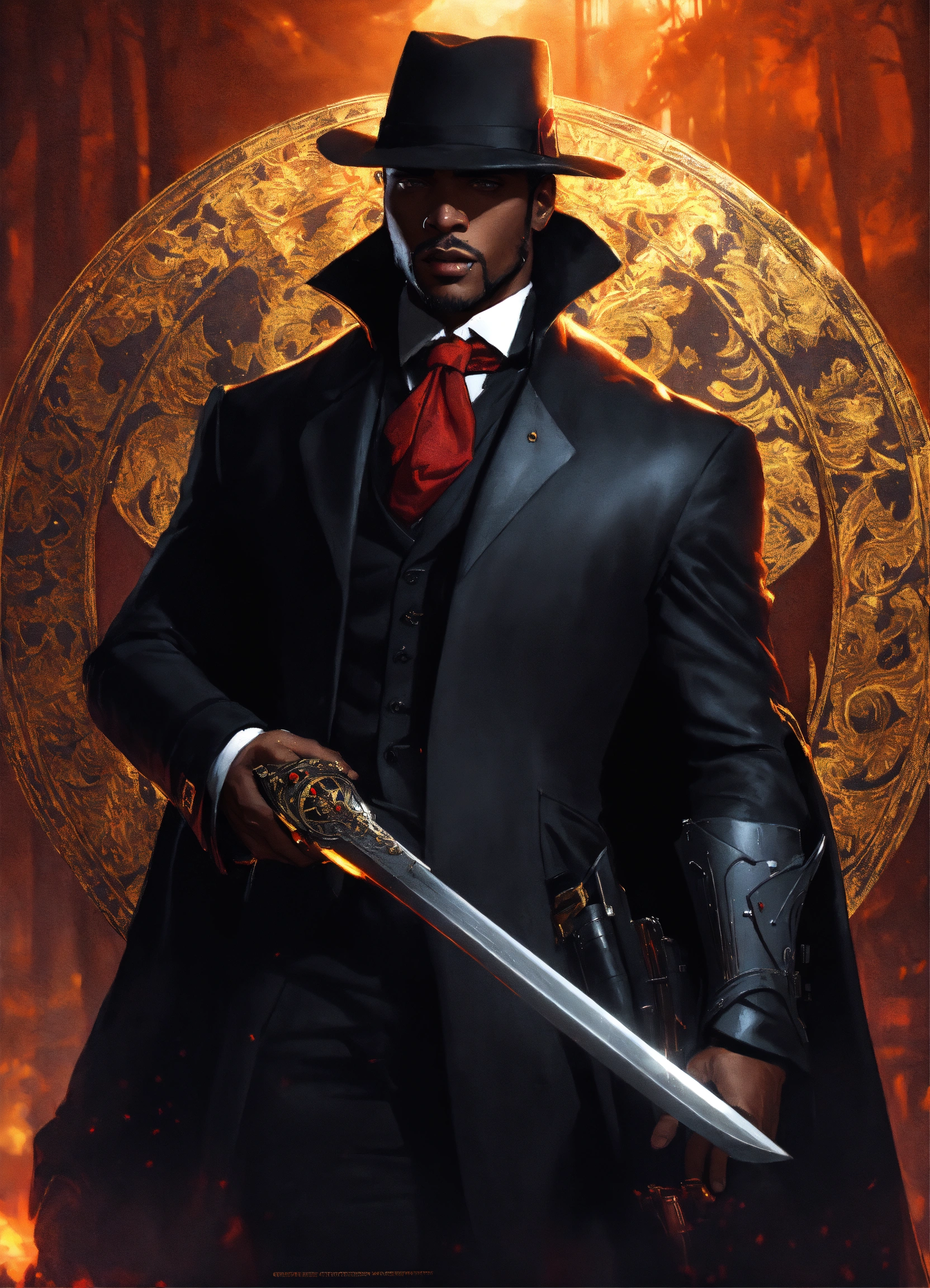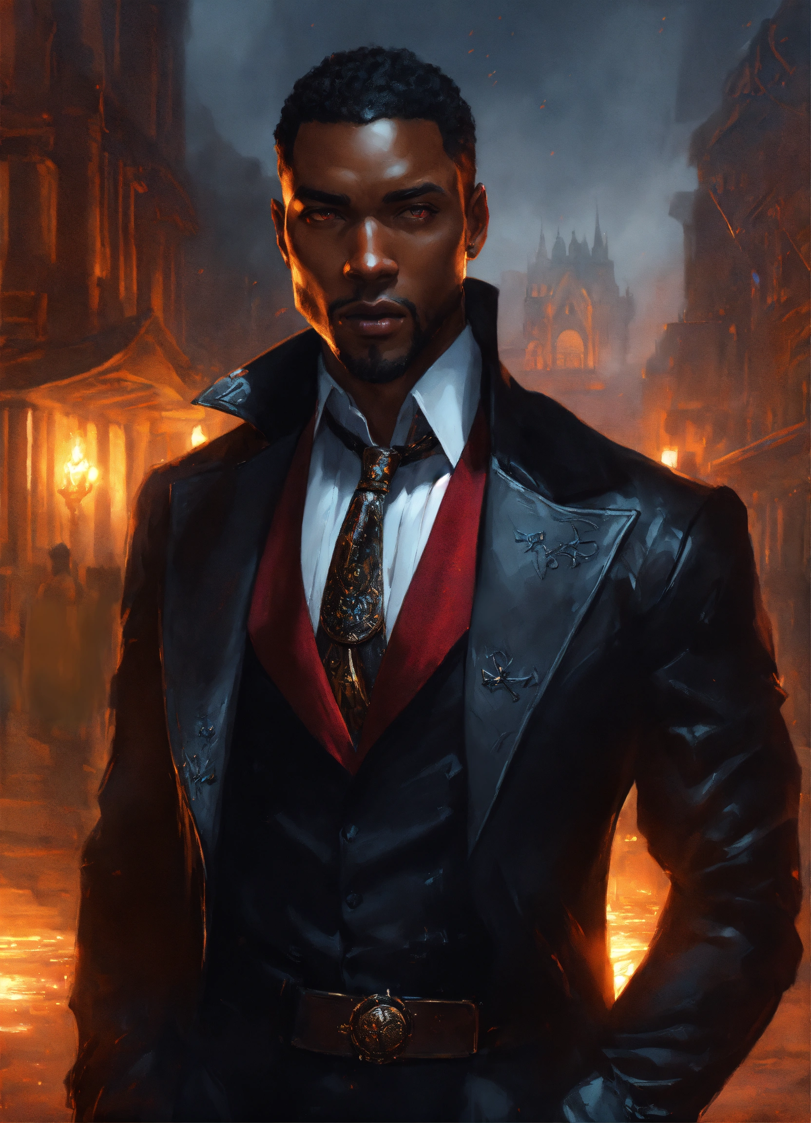 Handsome black man vampire hunter in a black suit, and his face is completely focused highly detailed, illustration, fantasy art, in the style of greg rutkowski, cinematic shot, epic, fantasy, complex, hyperdetailed, art station, concept art, smooth, sharp focus, ray tracing, background auto disaster