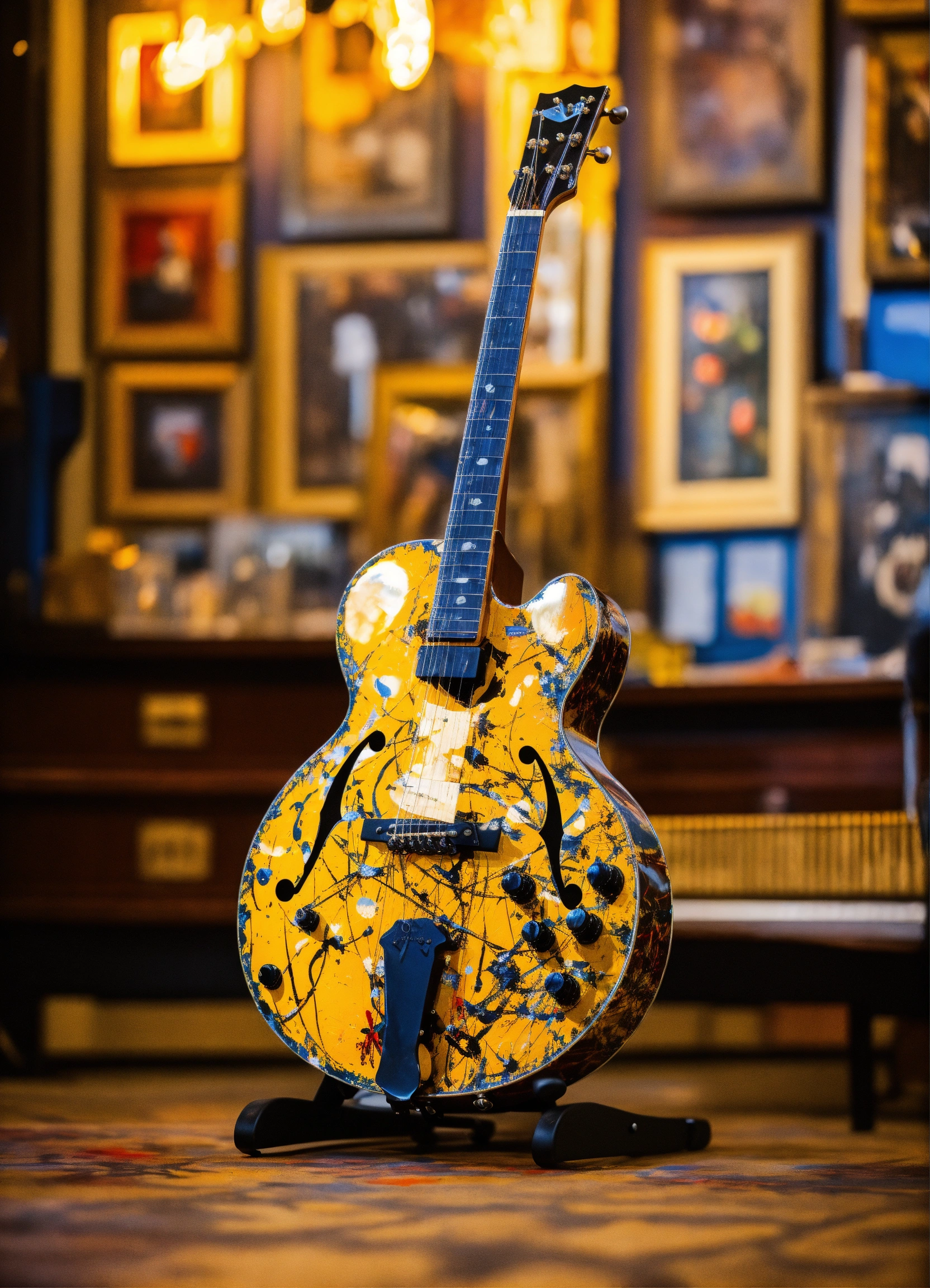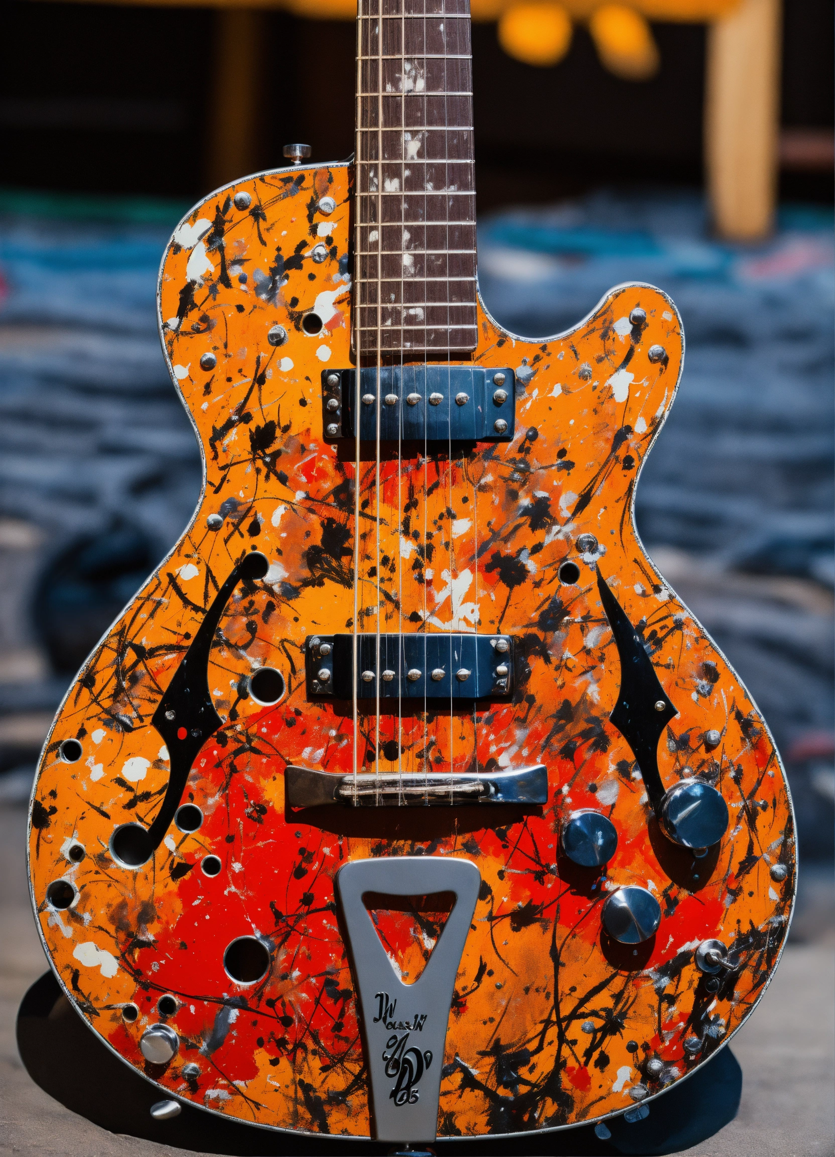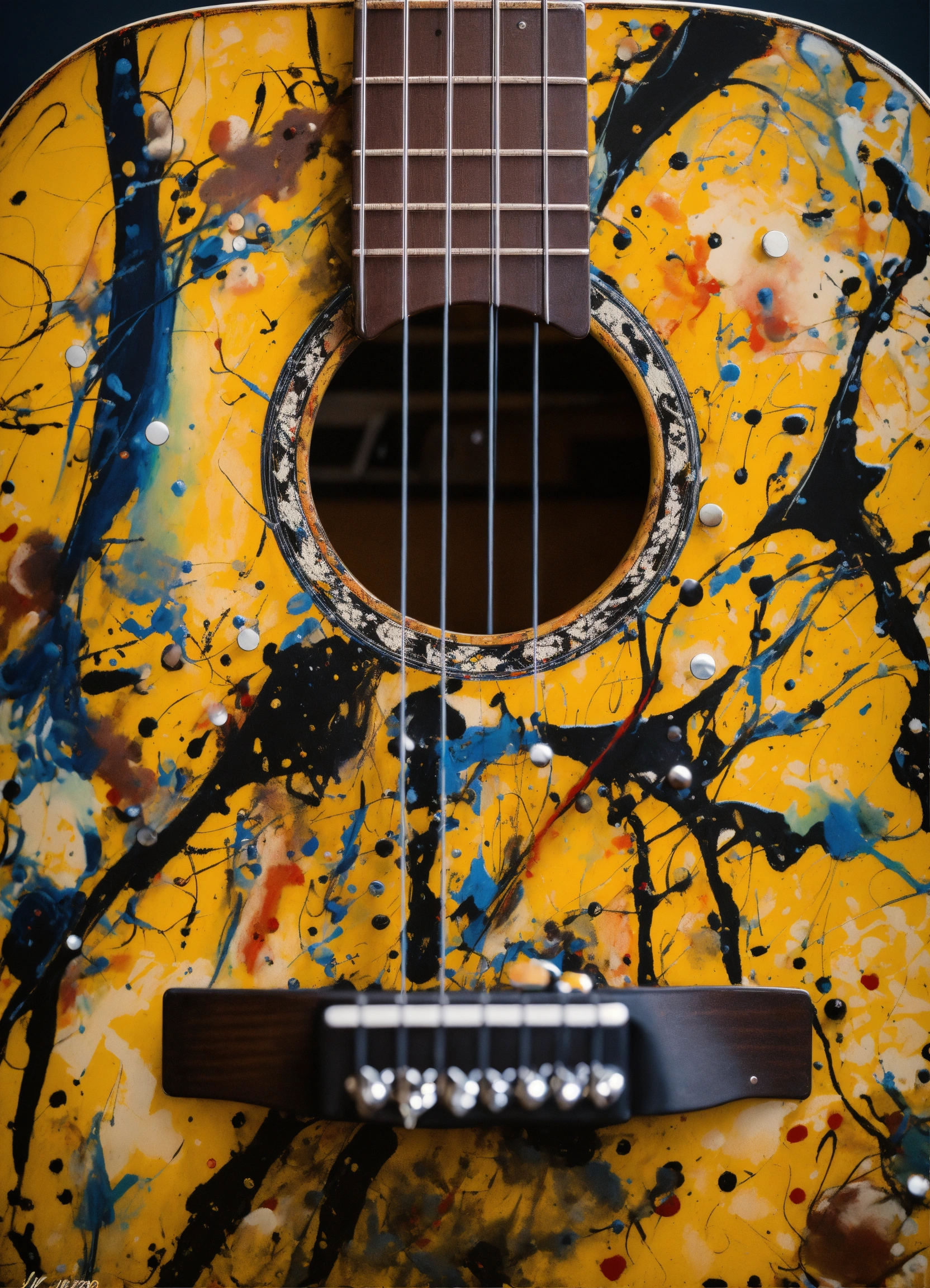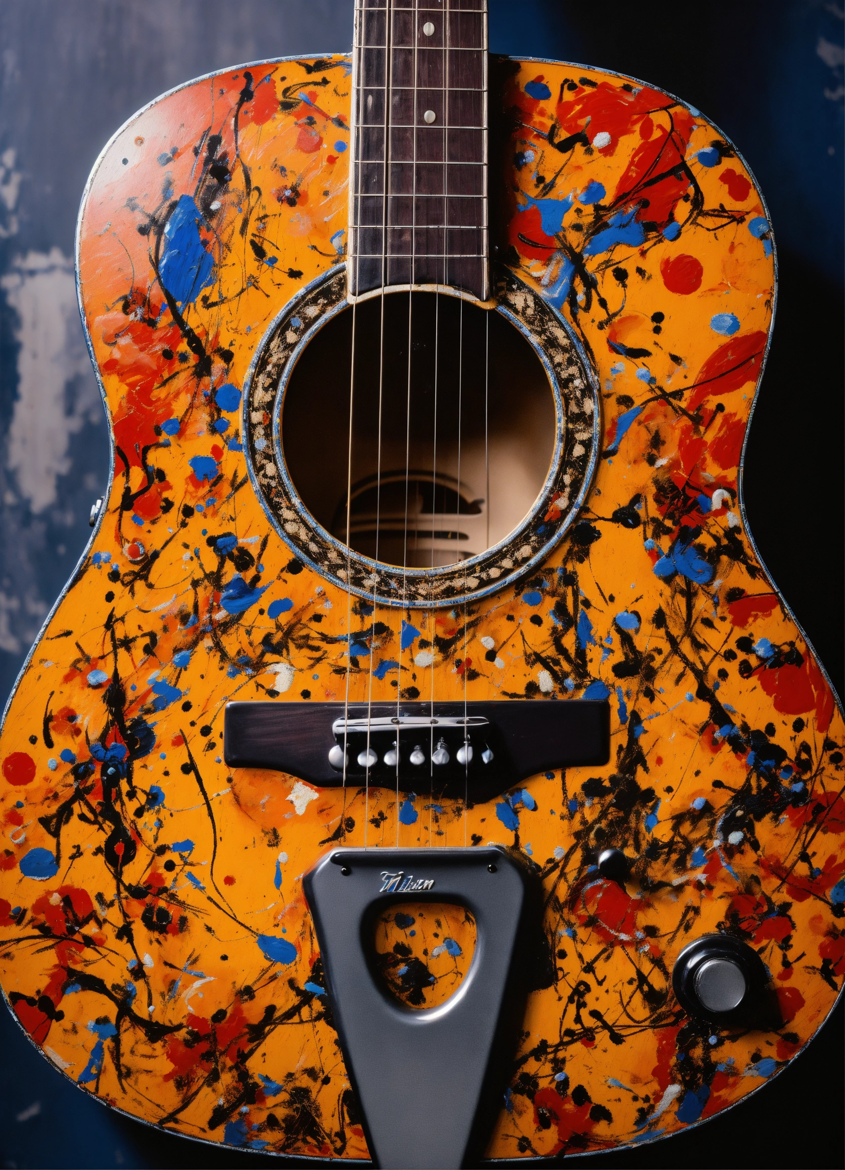 A resonator guitar with a jackson pollock painting design, best quality, real picture, intricate details, nikon d850, raw photo, 8k uhd, film grain