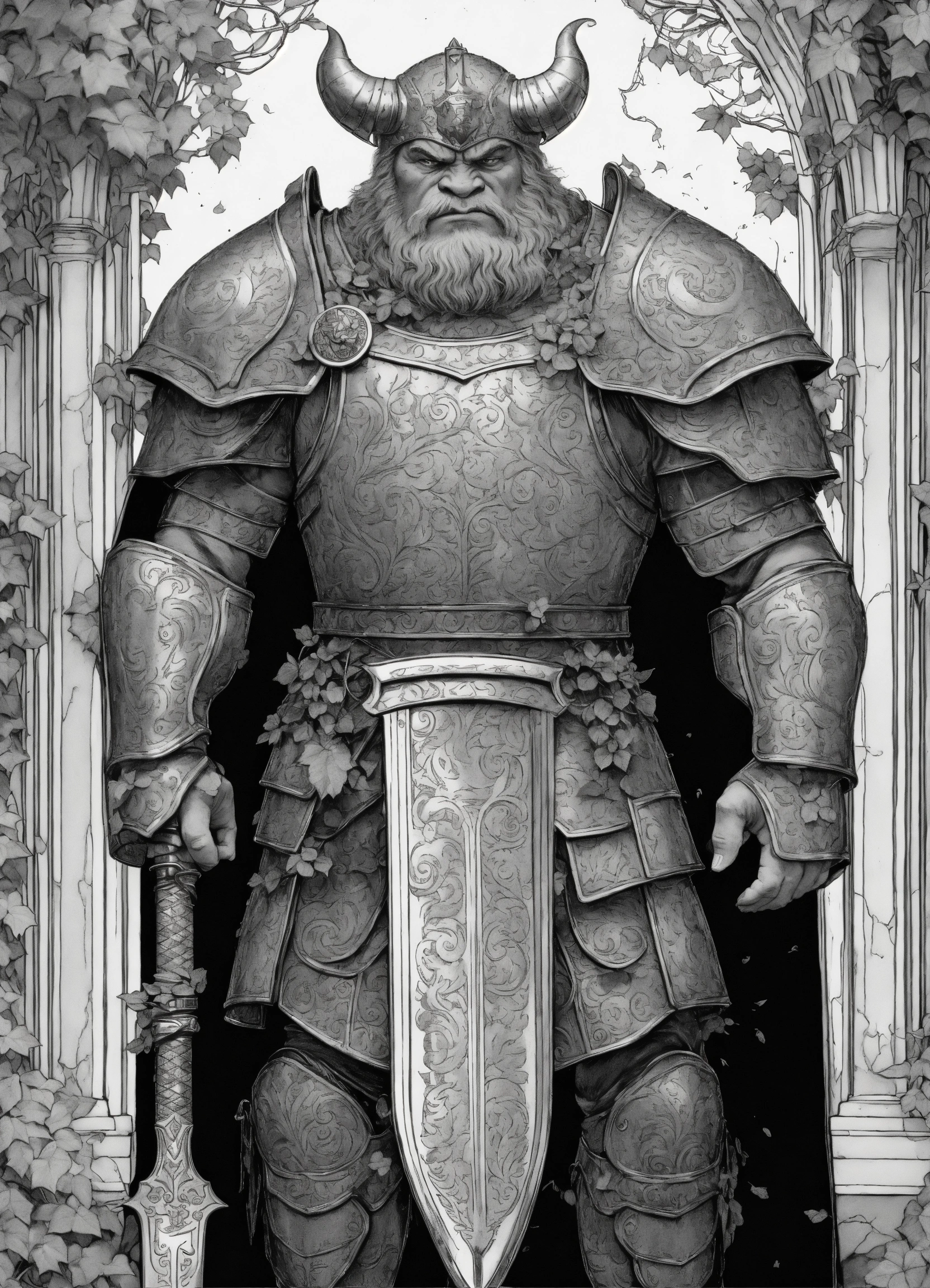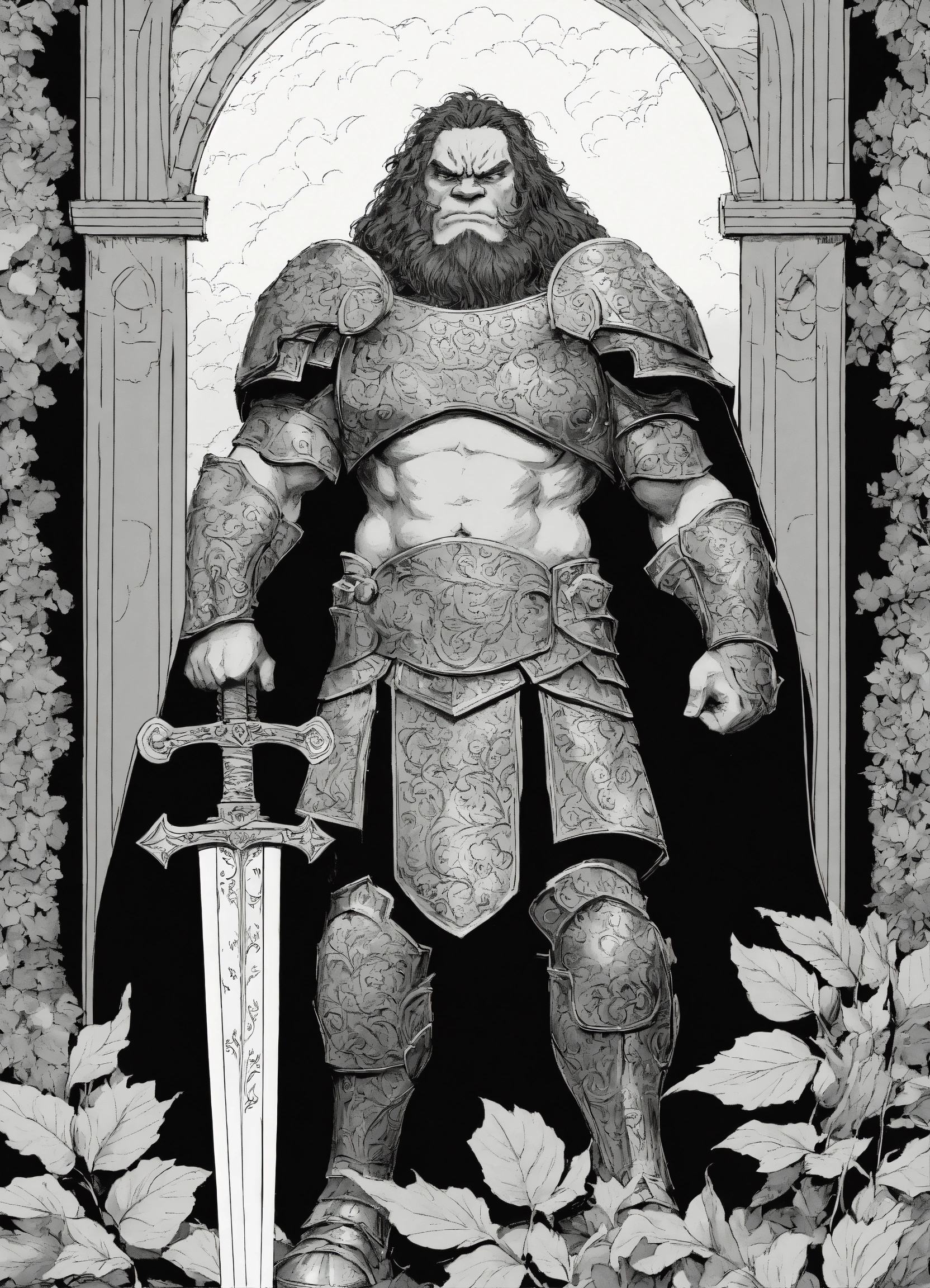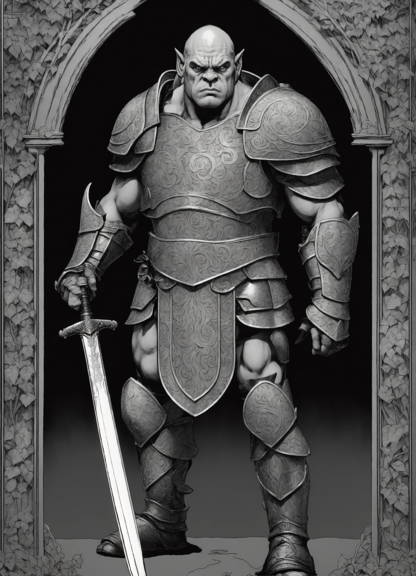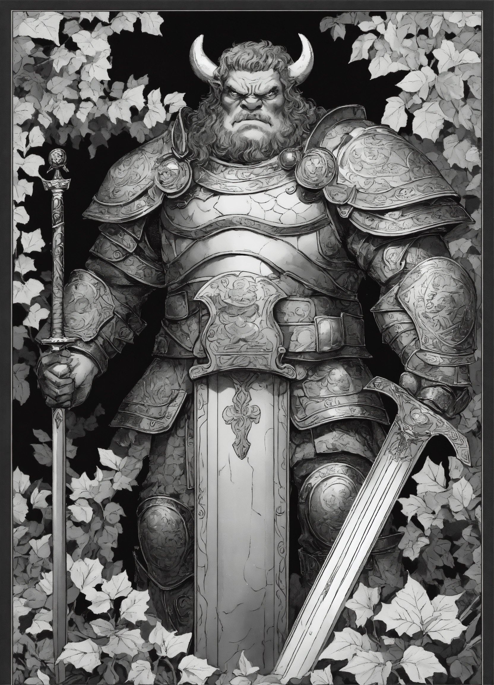 A stoic ogre with plate armor looking angry holding an engraved sword, comic book high contrast greyscale gustav klimt a border of ivy art novo