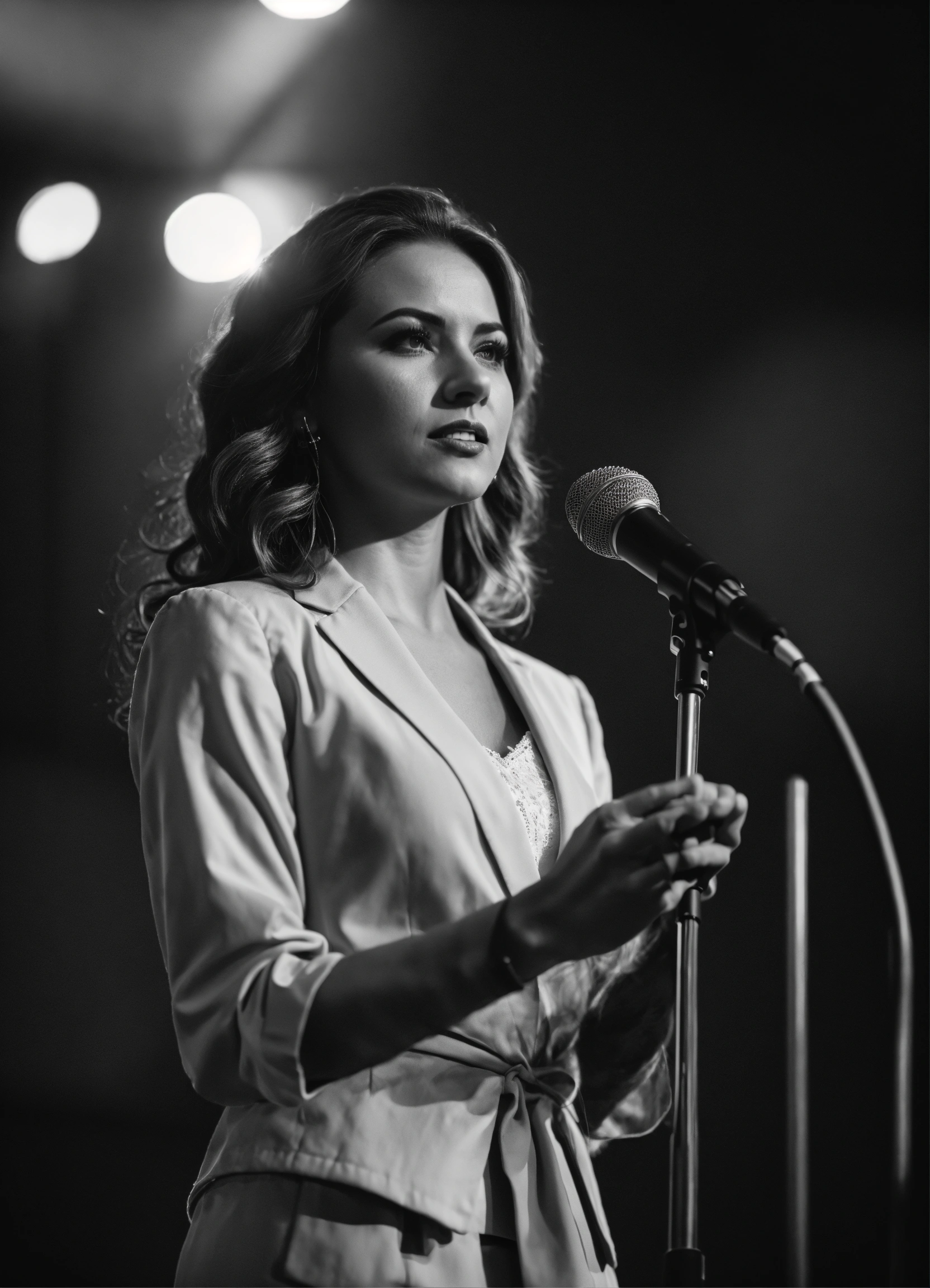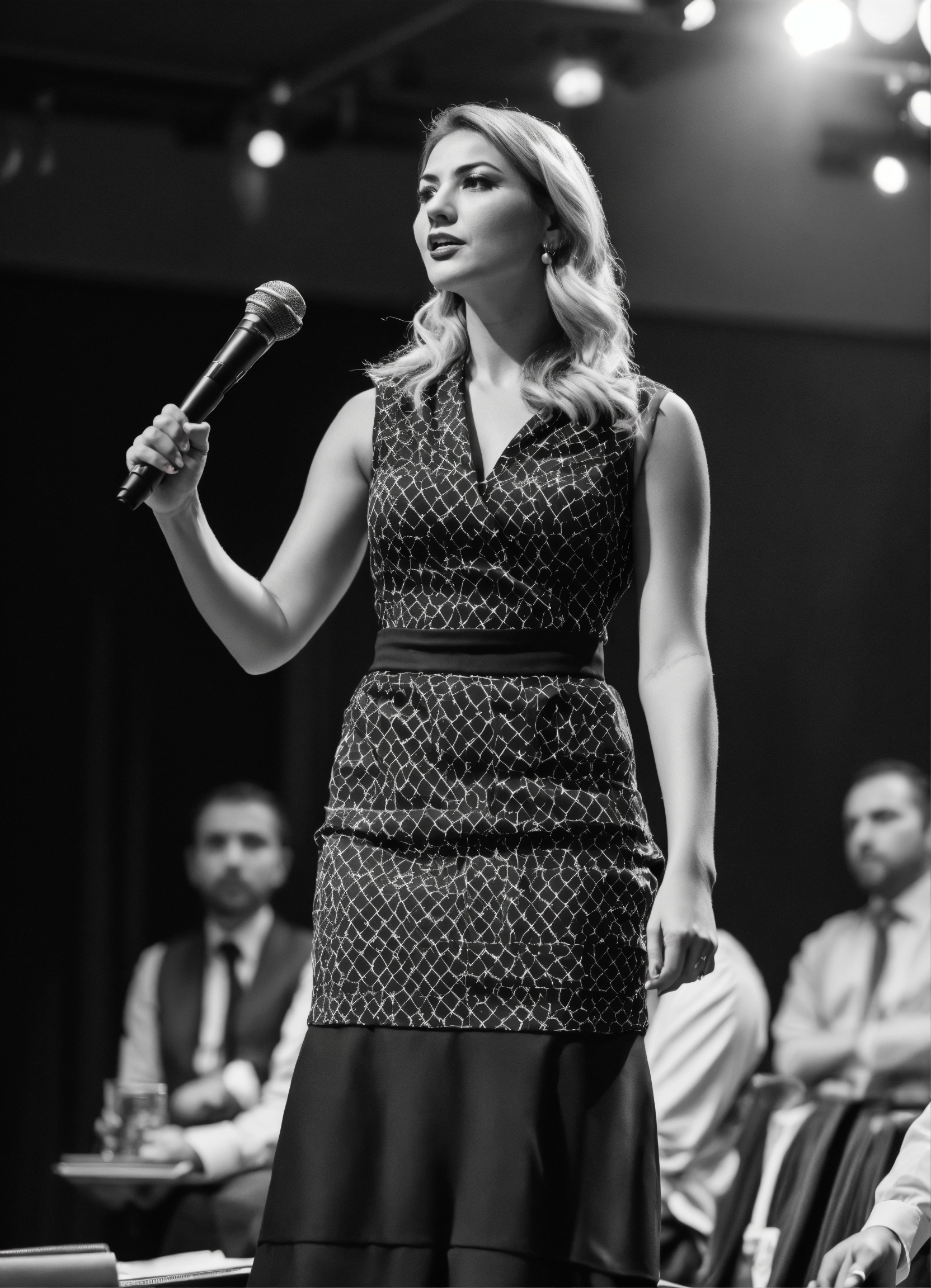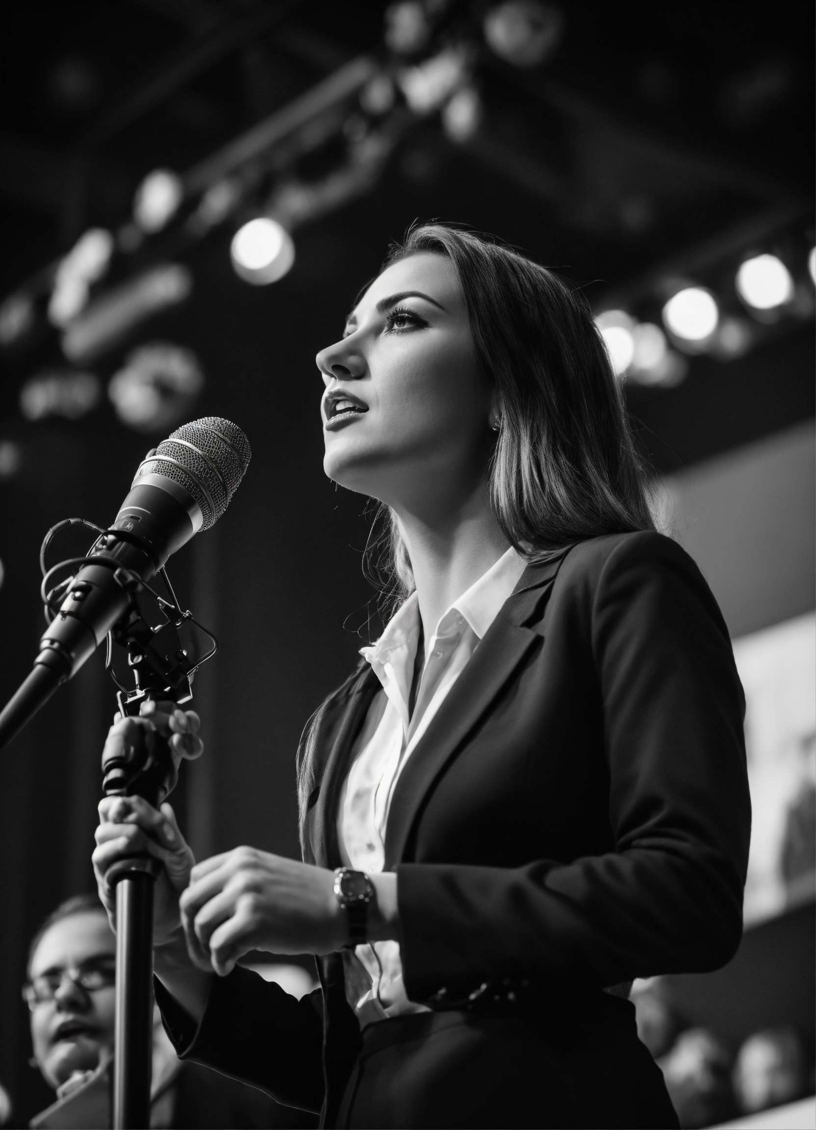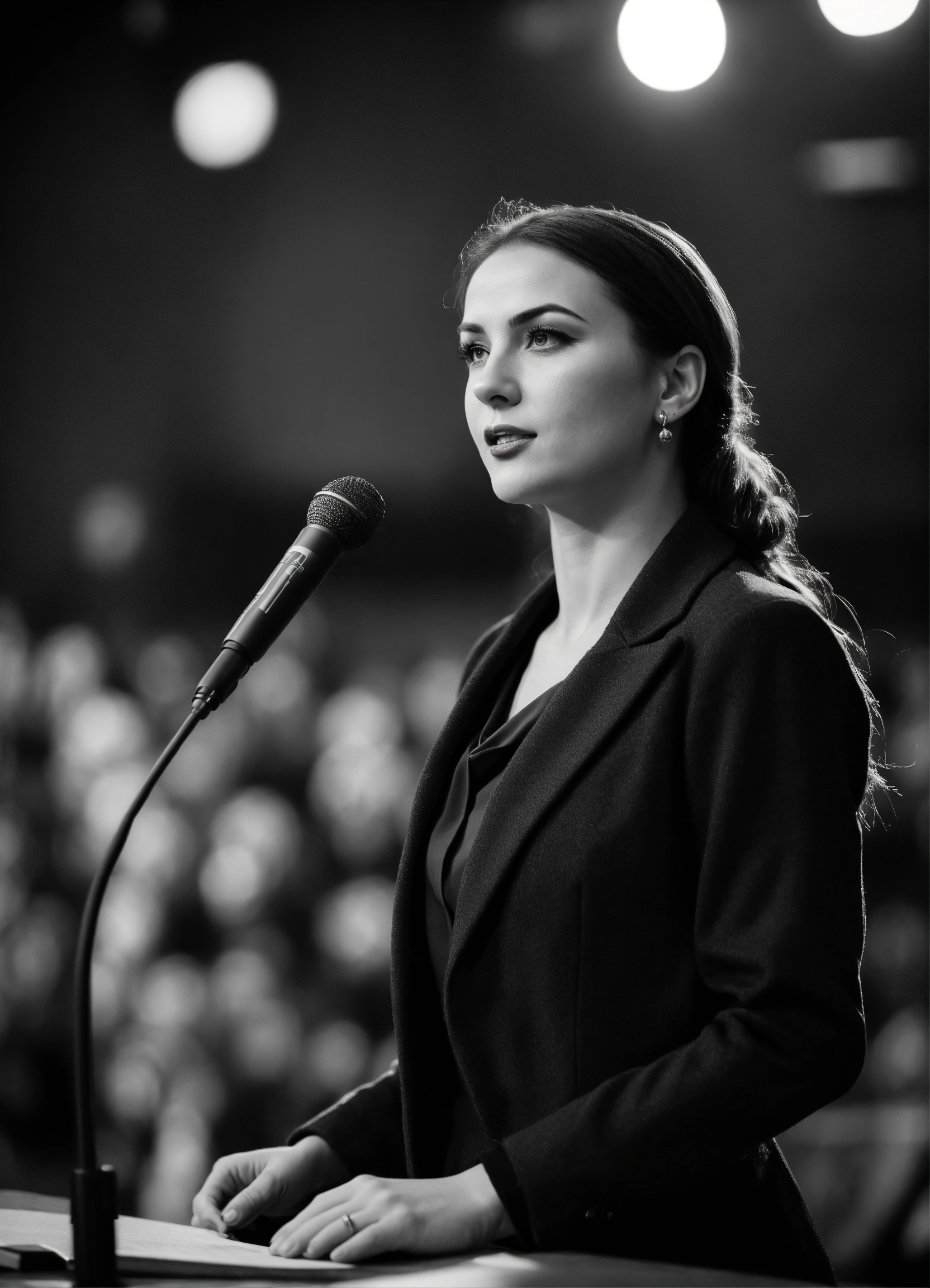 "create a beautiful slavic business woman delivering a compelling speech on a stage. emphasize her exceptional skills as a public speaker, and ensure that the entire scene is portrayed in monochrome colors, using only black and white tones.