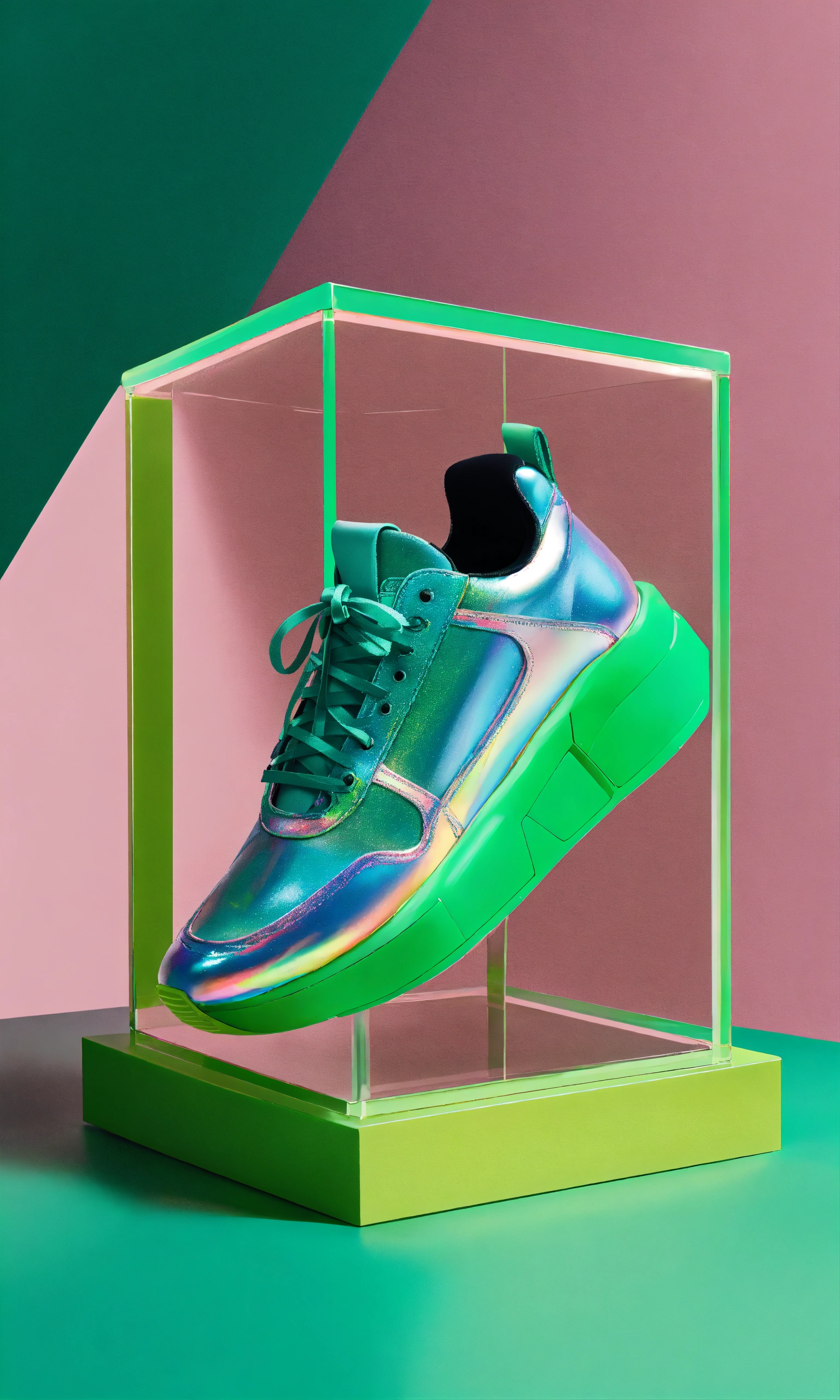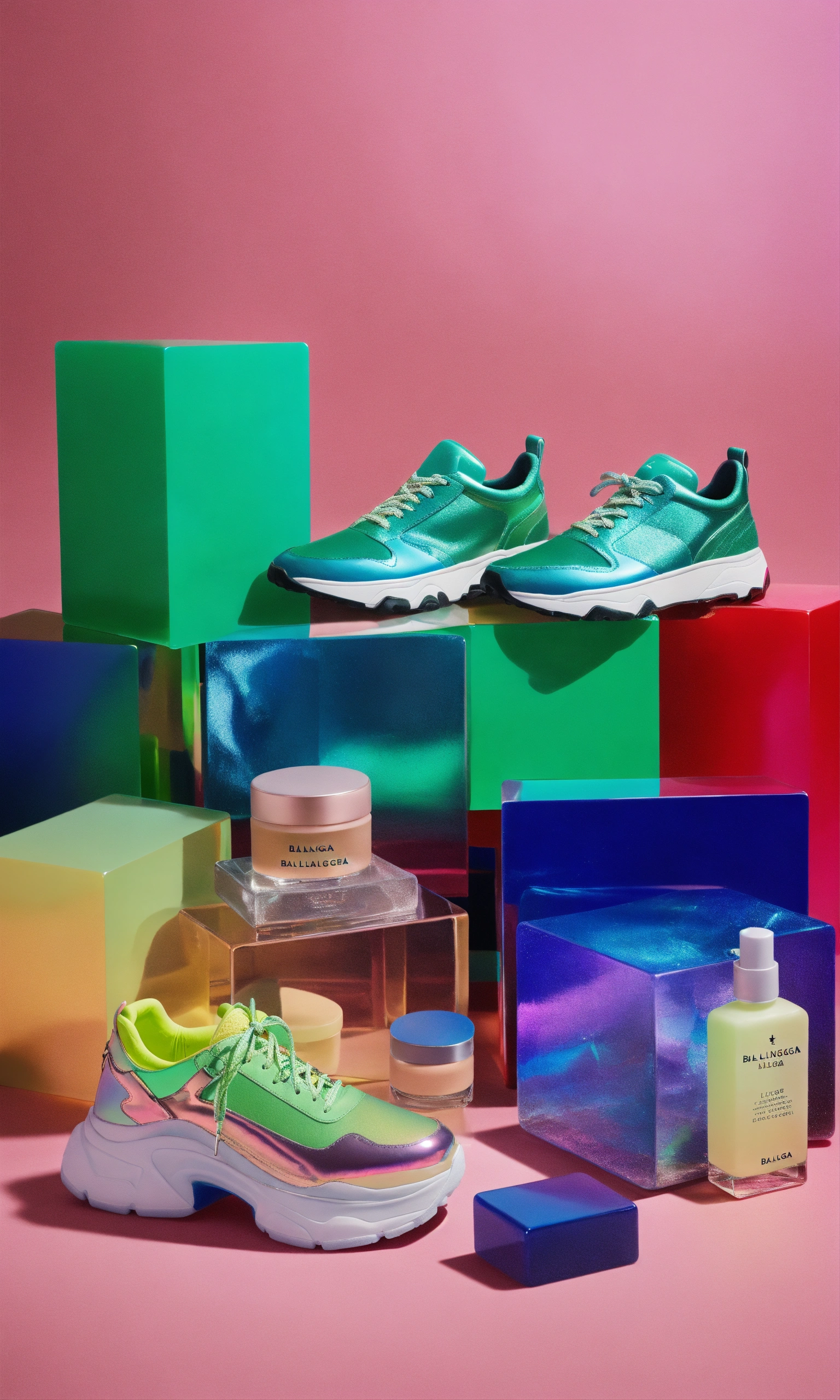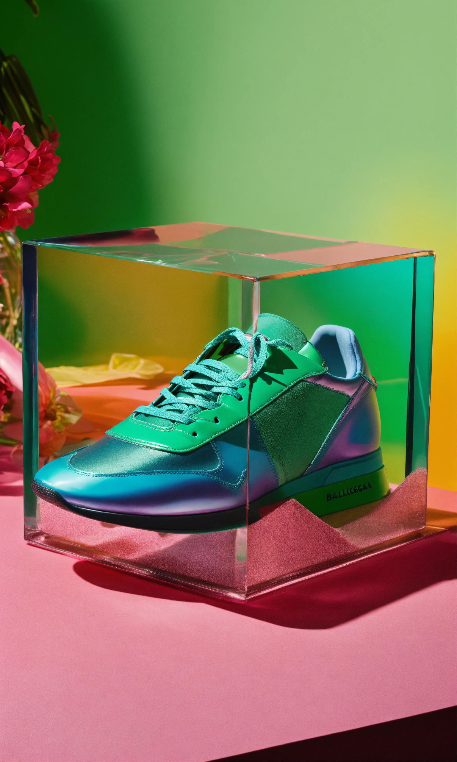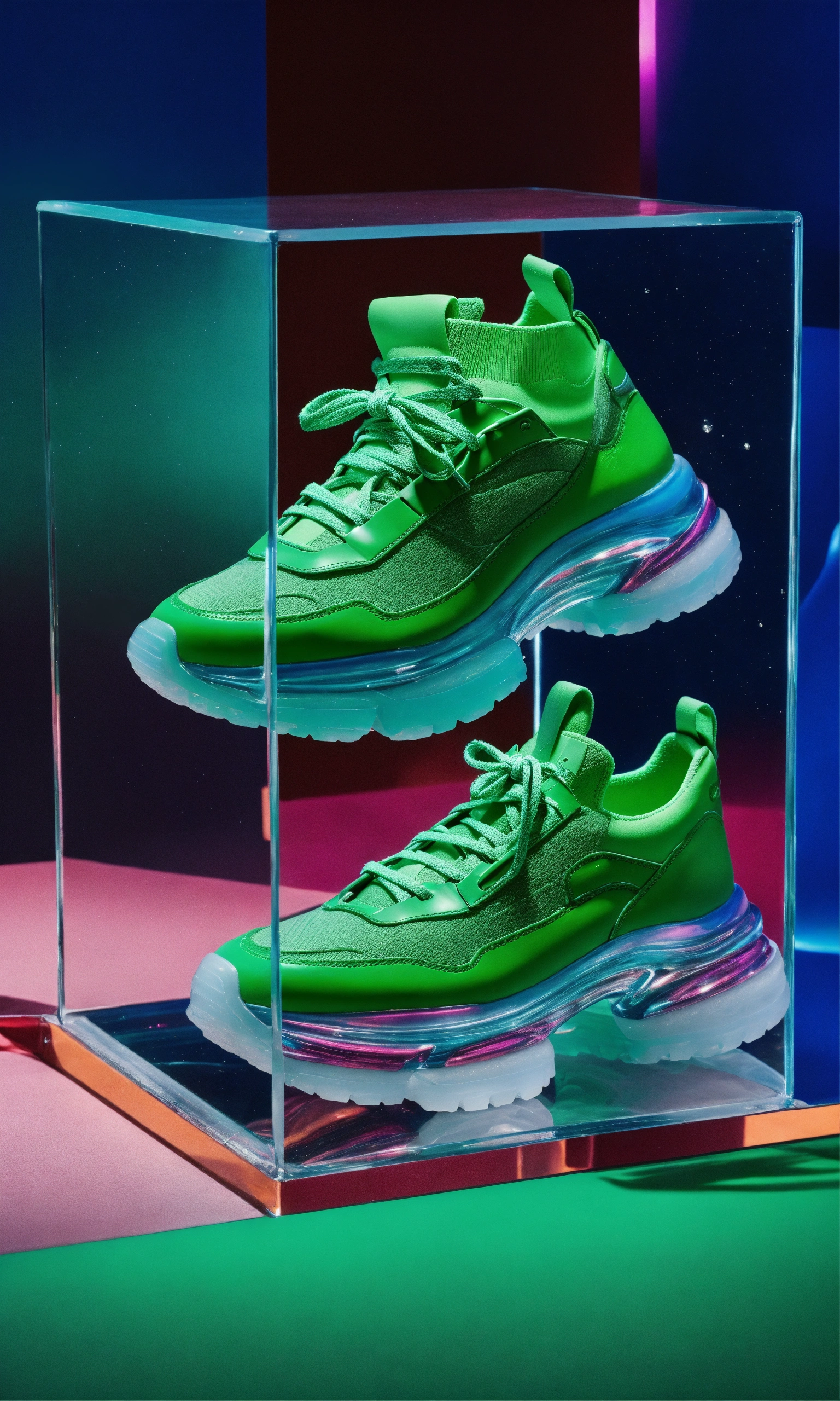 Clear iridescent cube full of colorful recognizable objects such as balenciaga sneakers, makeup. studio photography, e-comm, some green accent color, 4k, solid color background! table top photography! realistic!