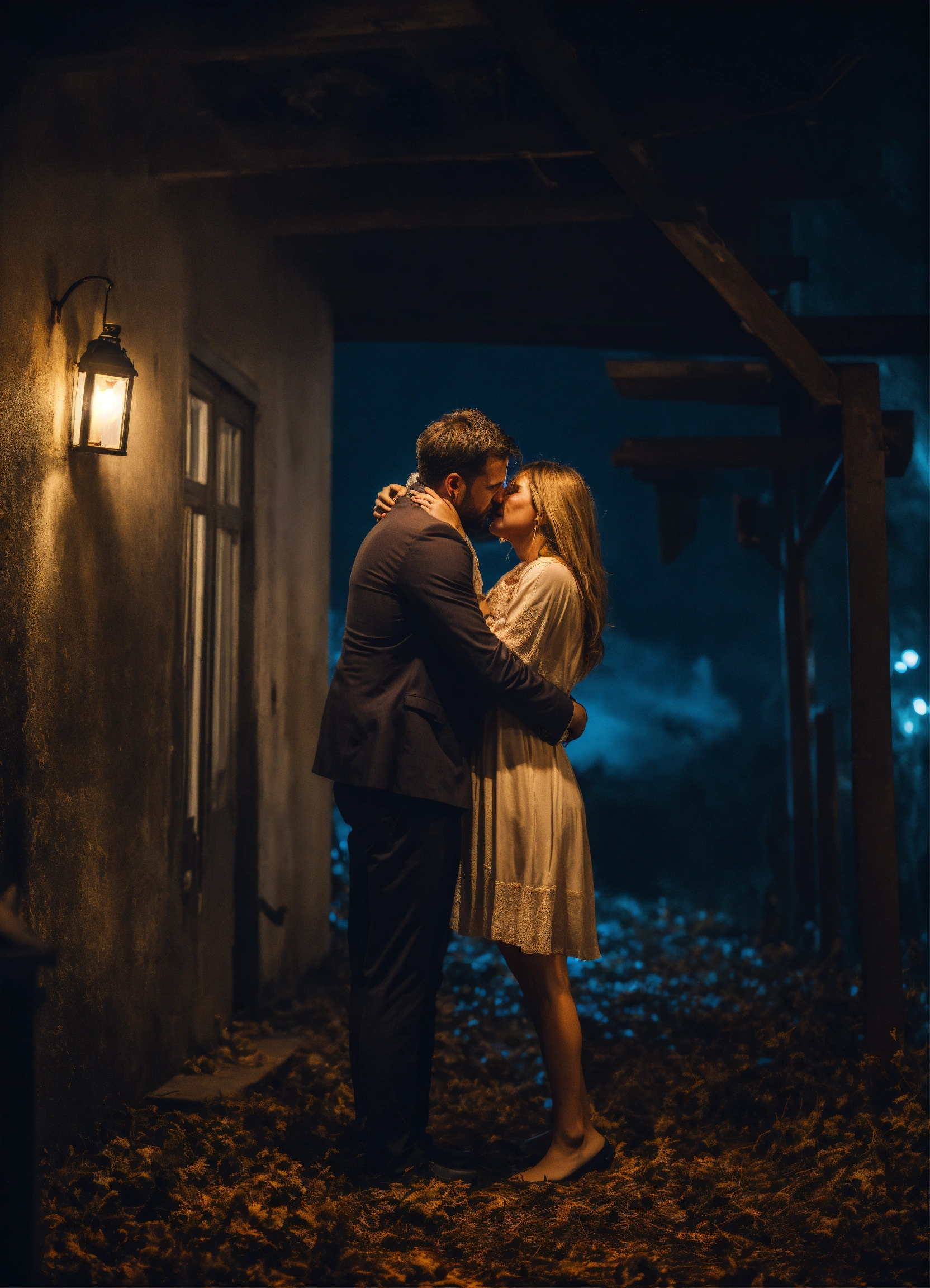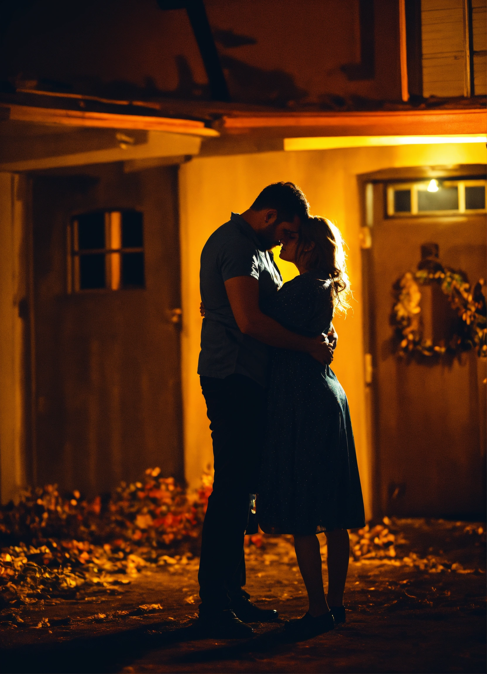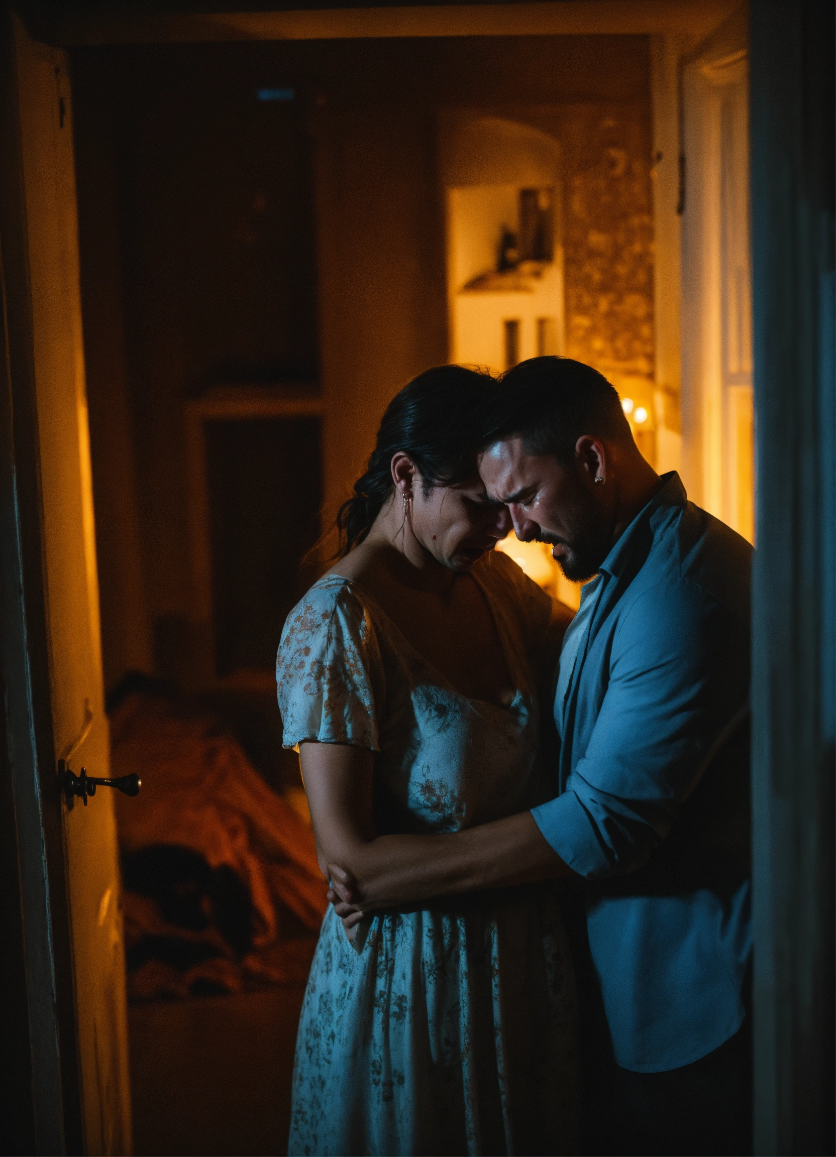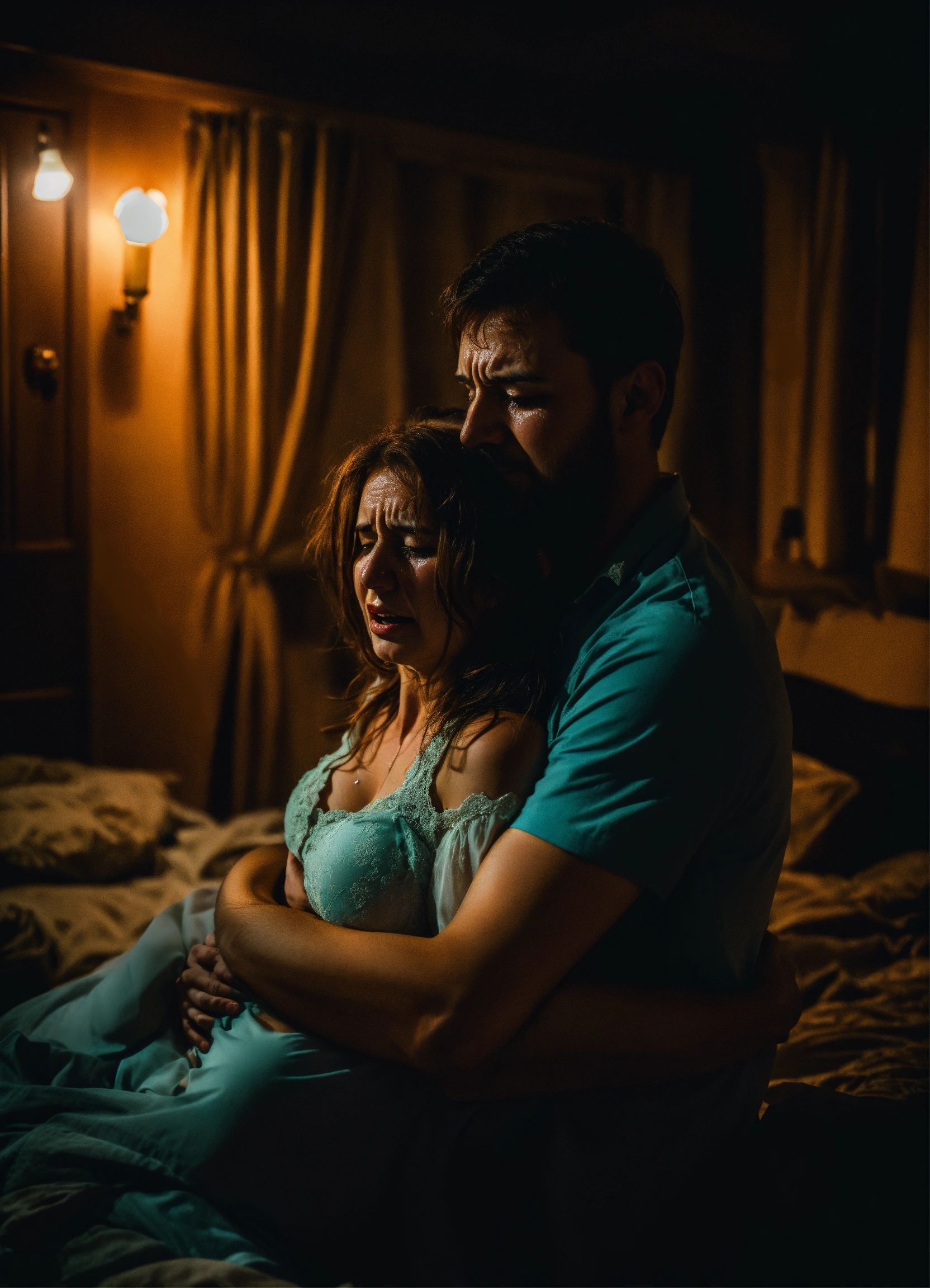 Man hugging feared and crying wife in scary night