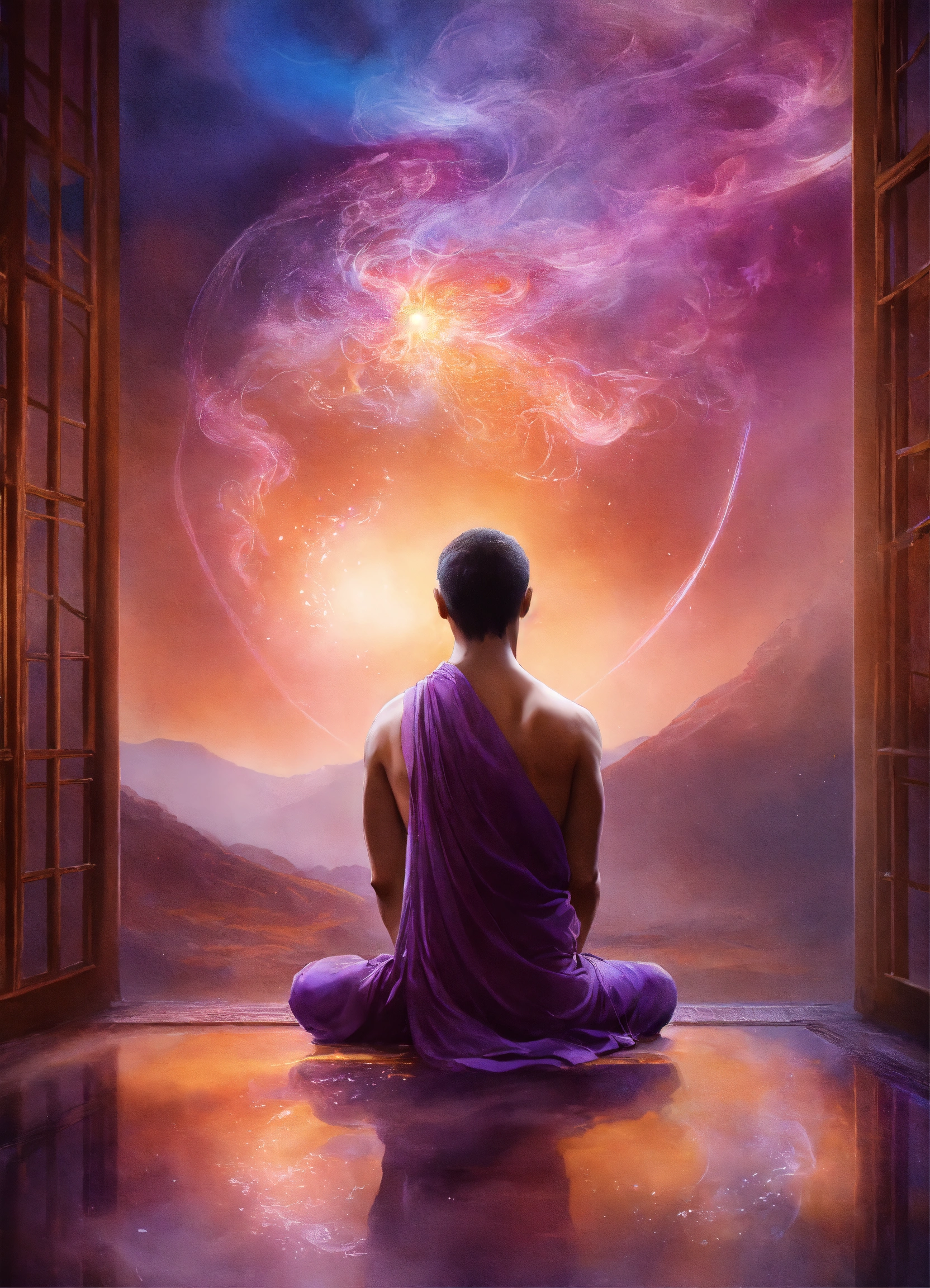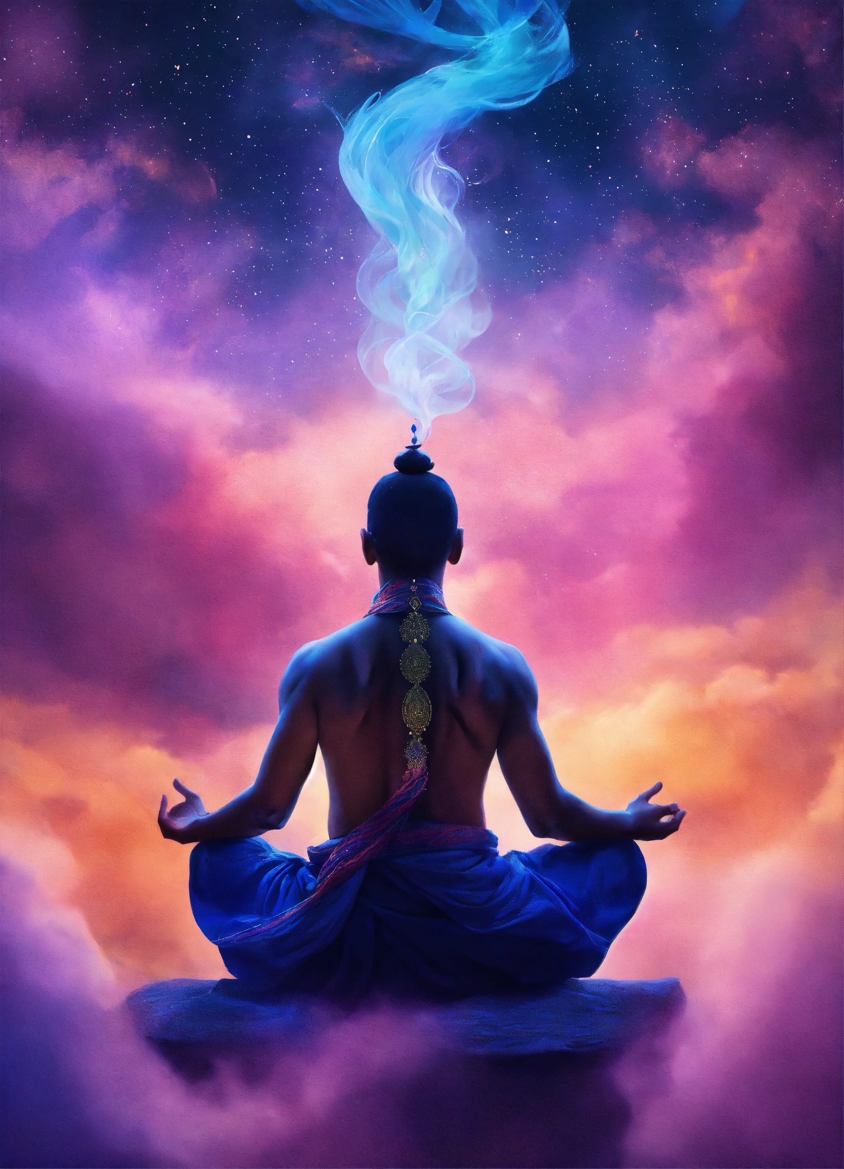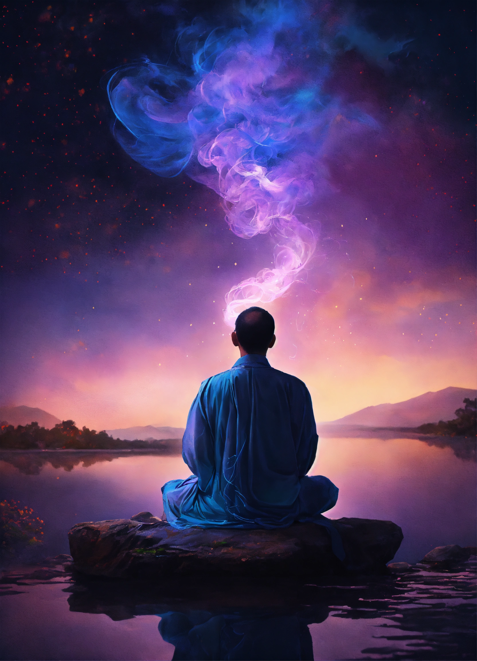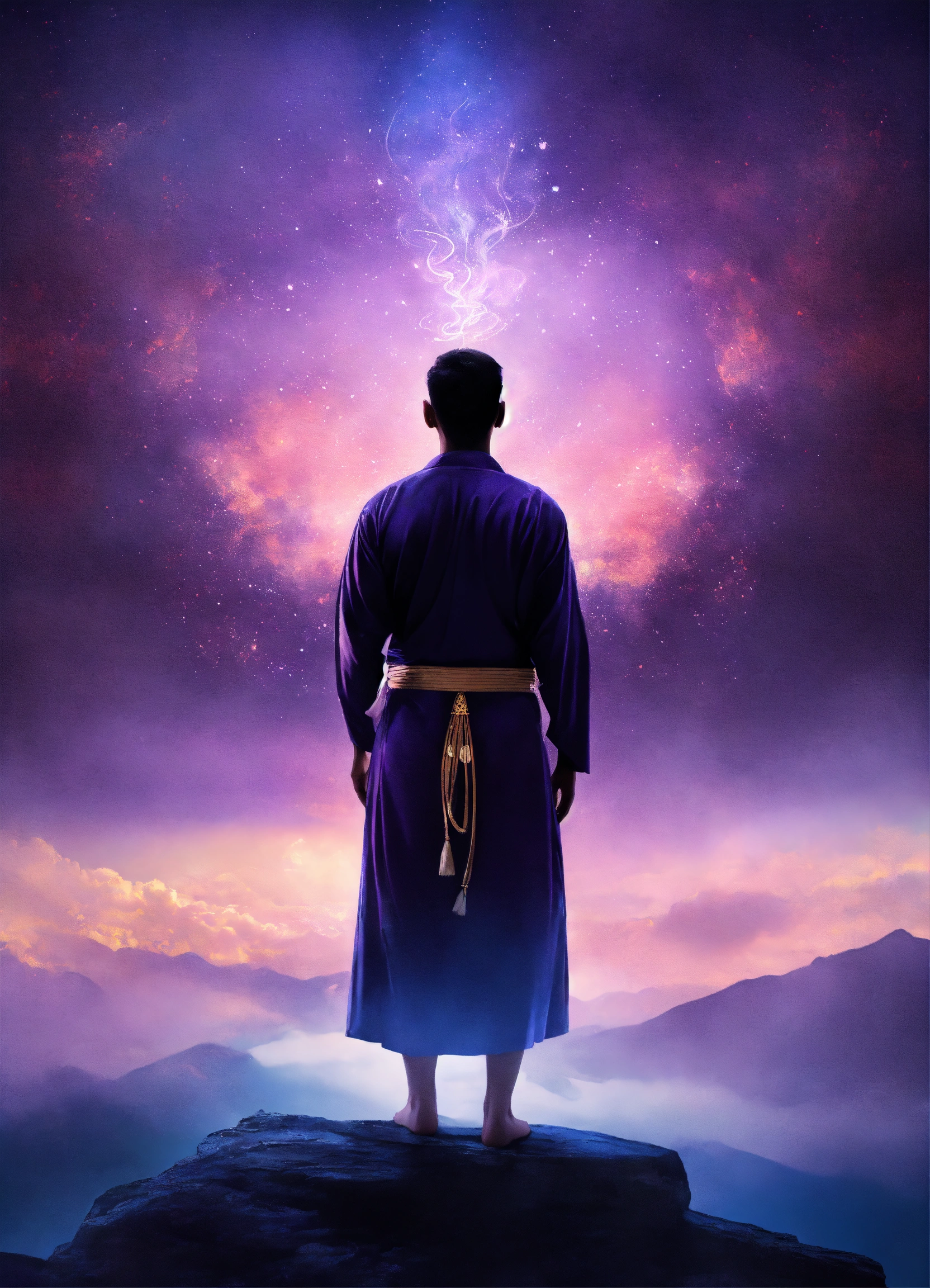 Realistic image that captures the ethereal essence of 'essence of oneness' a man with their back turned . in a beautiful calm and meditative zen space. envision a serene scene where wisps of fragrant smoke intertwine with the cosmos, symbolizing the connection to higher self and universal oneness. infuse the image with hues of tranquil blues and soothing purples, embodying the depth of inner peace. let the delicate dance of the smoke embody the journey of unity, as tendrils merge and blend, echoing the harmony that this incense brings. portray a sense of profound tranquility and spiritual elevation, inviting all who behold it to experience the transformative embrace of oneness.