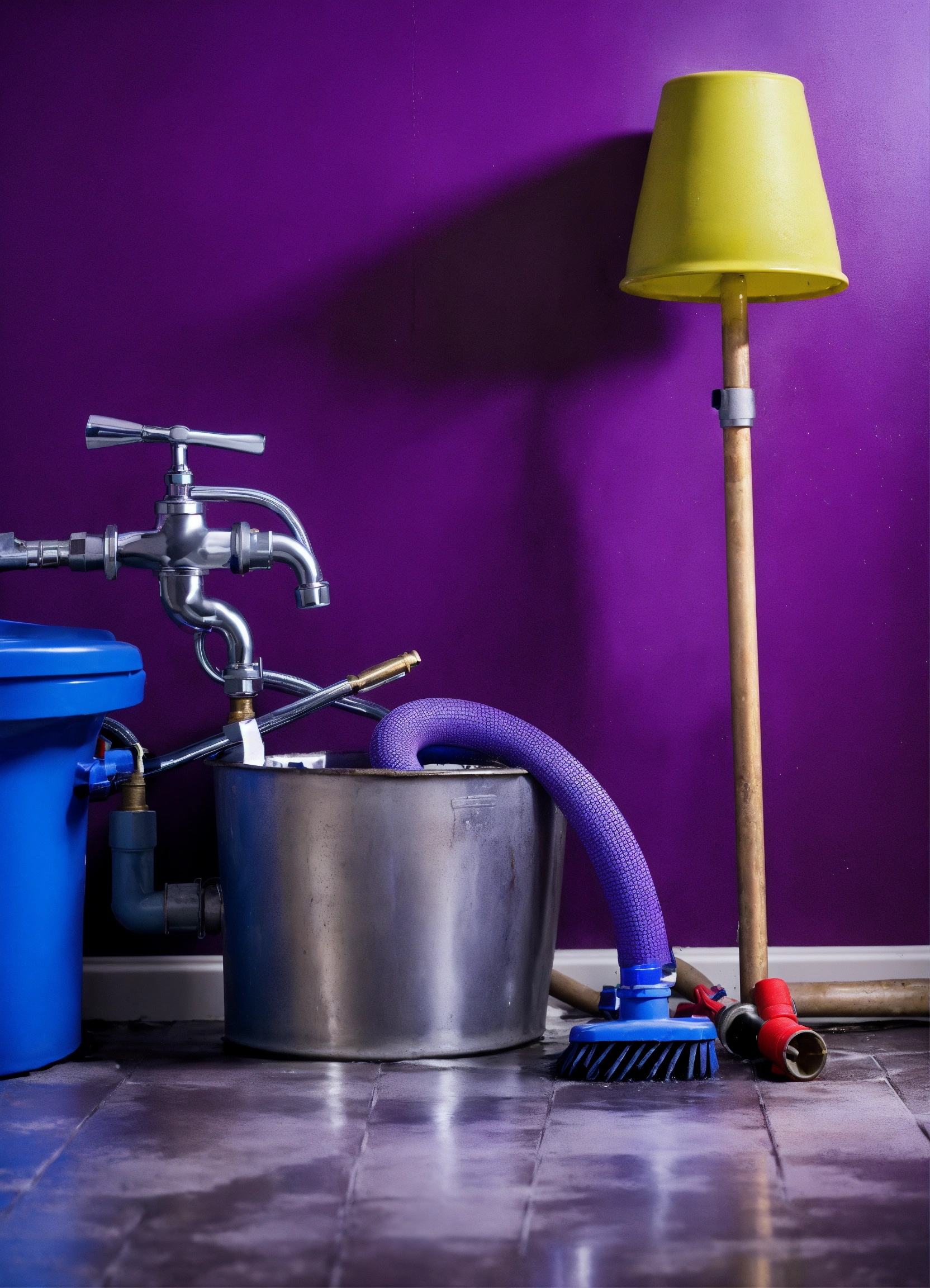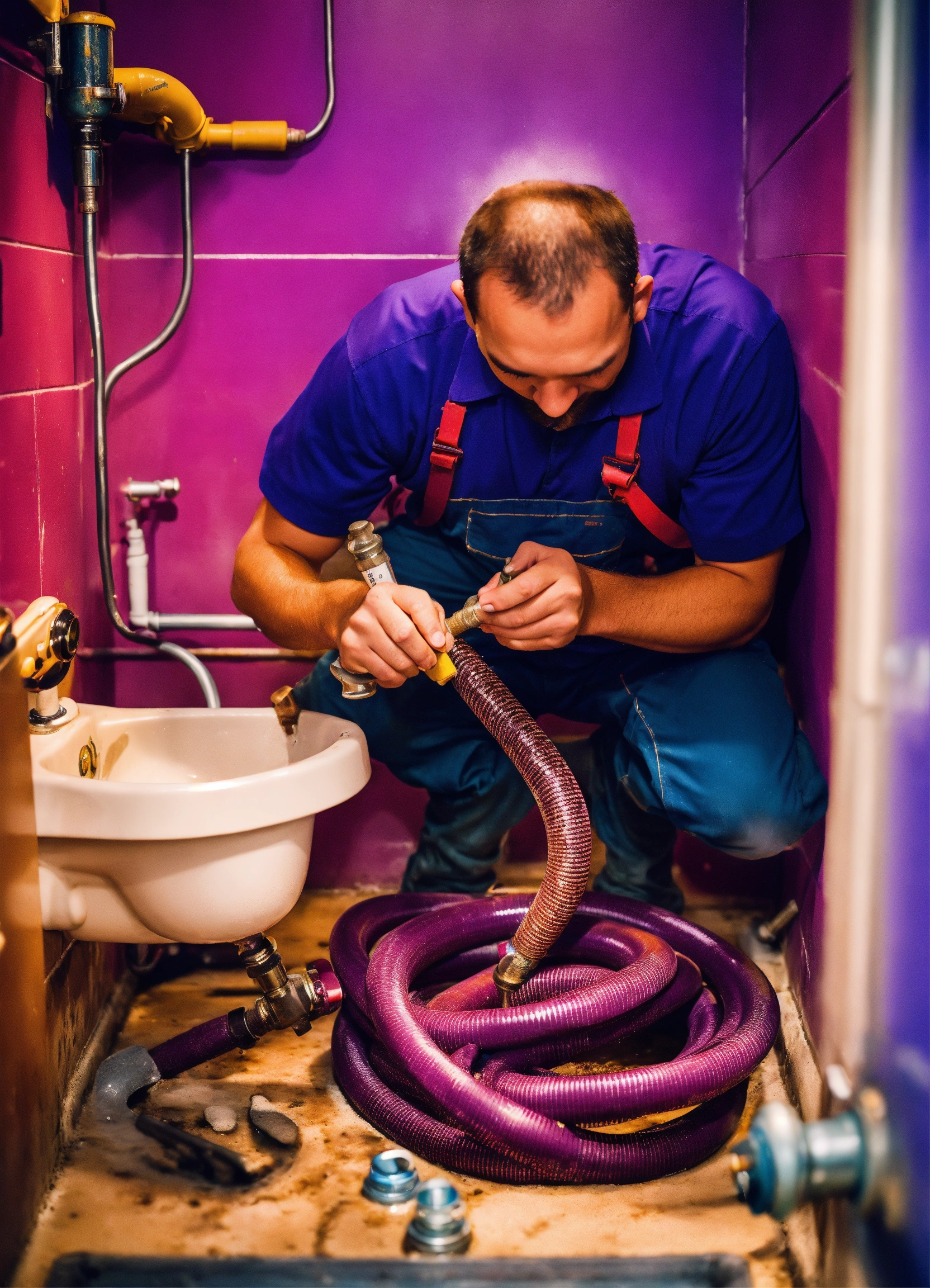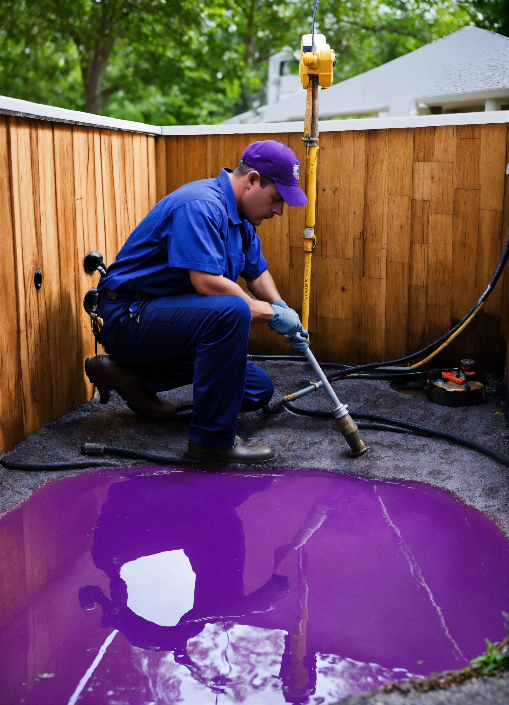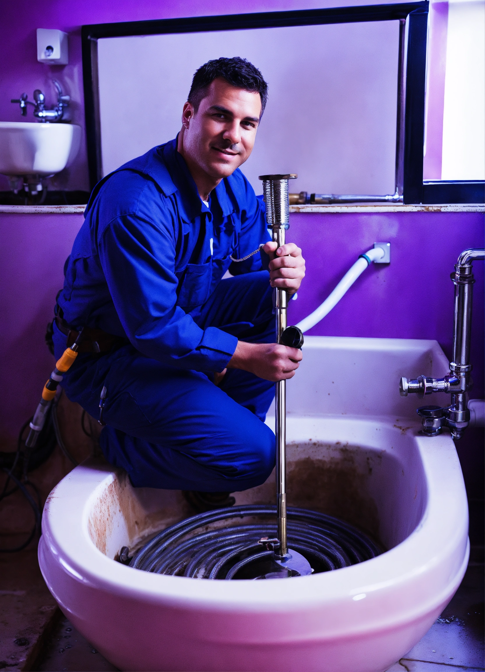 Purple color plumber show drain clog service would be a picture of a plumber using tools such as a drain snake or drain auger to clear a clogged drain