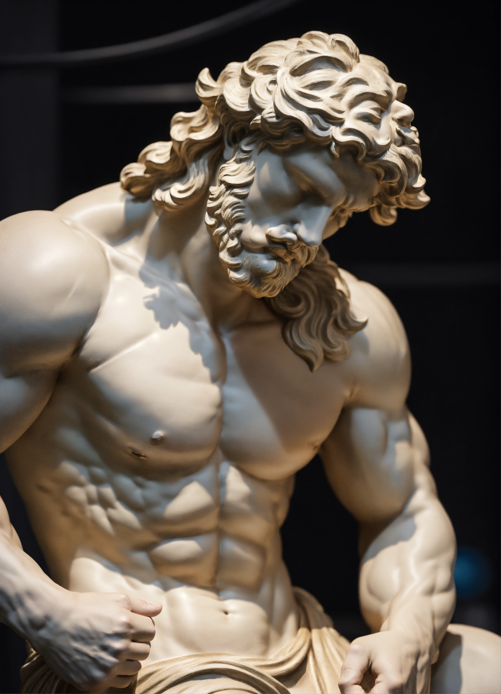 Modern muscular greek god statue with middelparting hair with white boddy with dark backround only head on a bodium