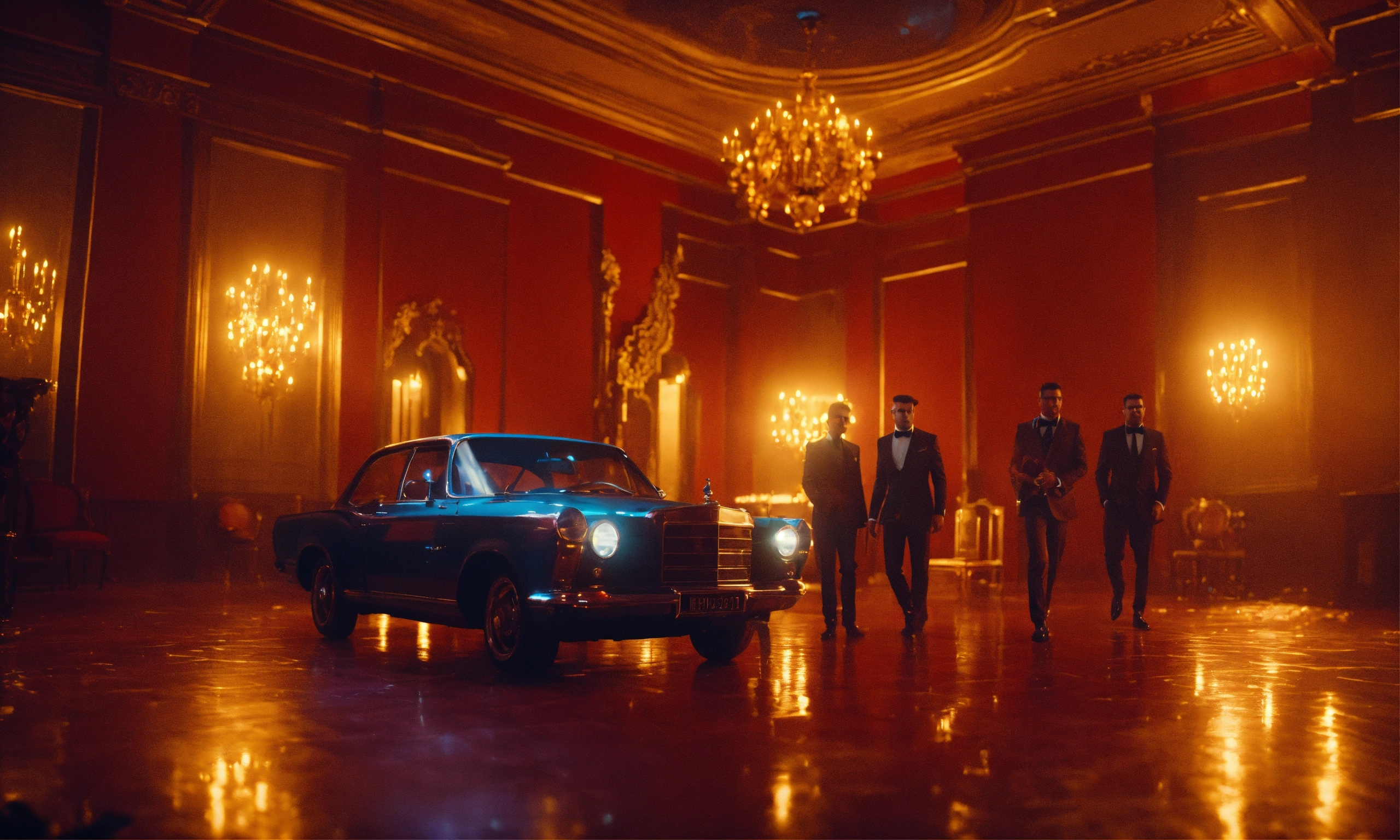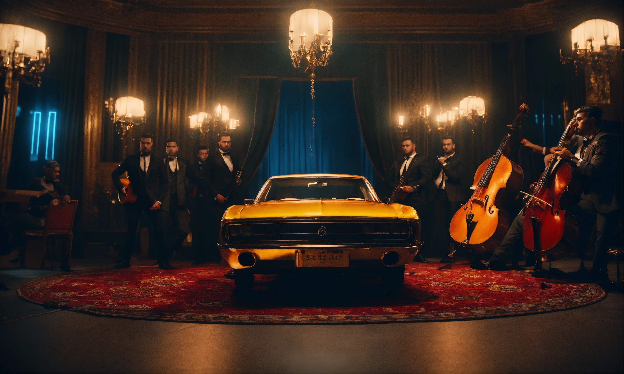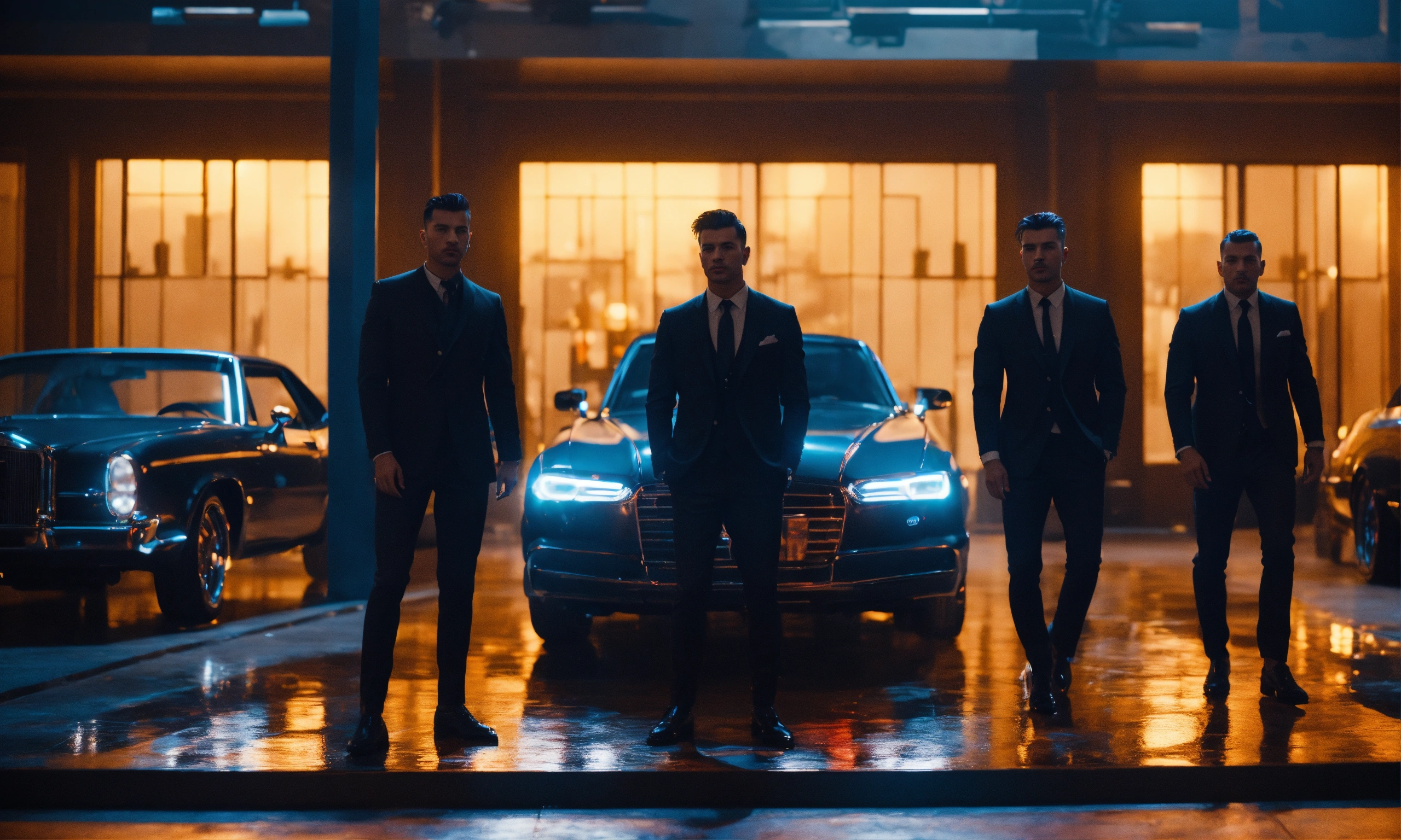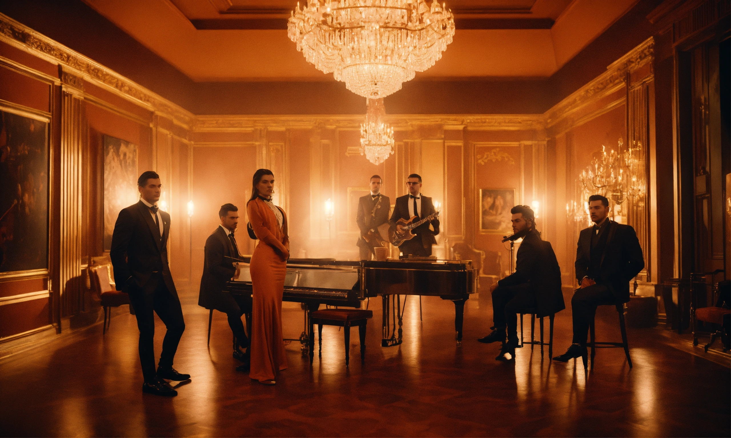 Artistic mafia group showing their style in music video, night interior, mood lighting, wide front shot, 8k, luxcorerender, earthly colour, cinematic photography, real humans, real images, matte finish, shot on arri anamorphic, extreme wide shot, smooth, sharp focus, ornate, highly dynamic, particulate, hyperreal, wide shot