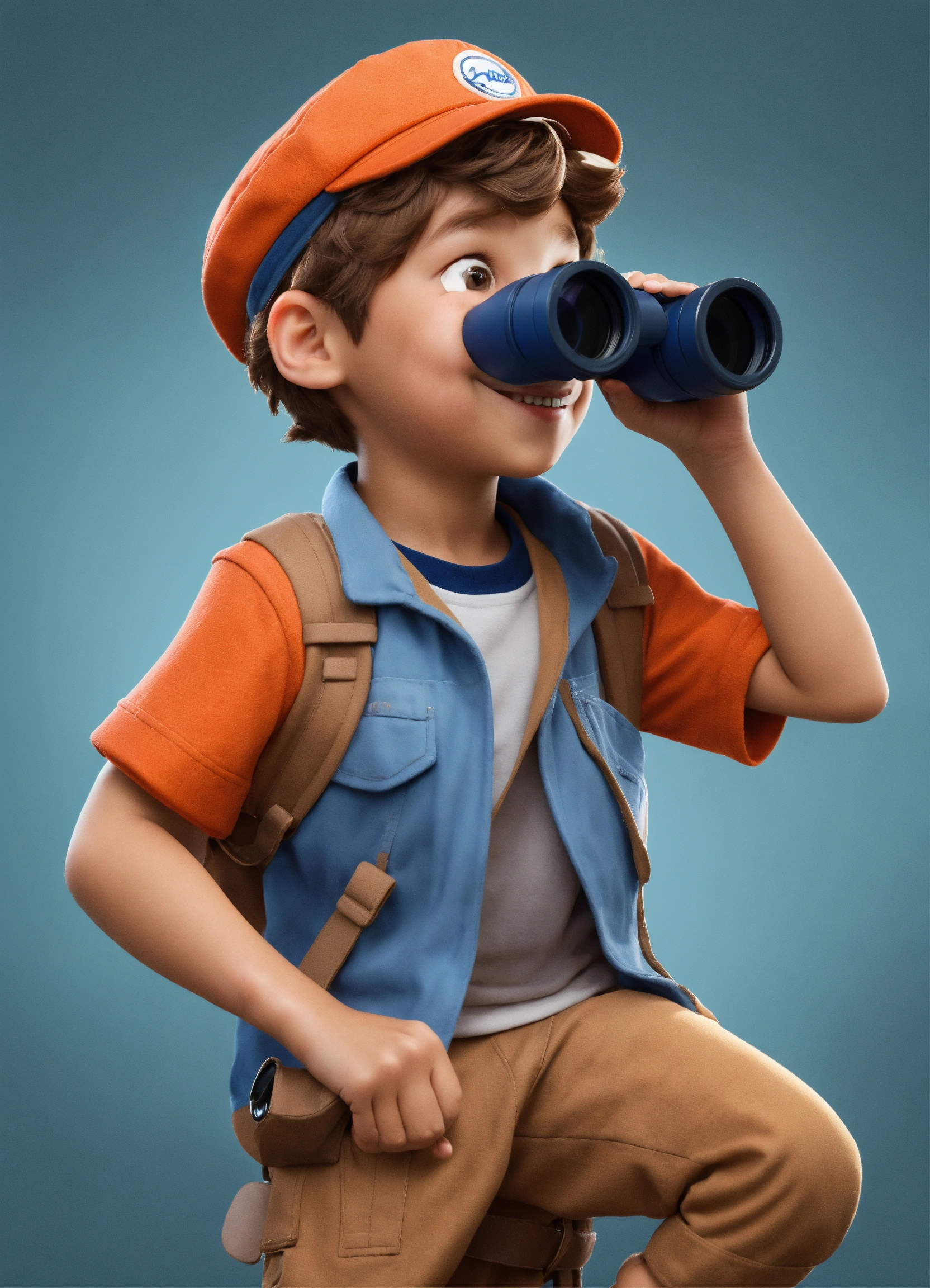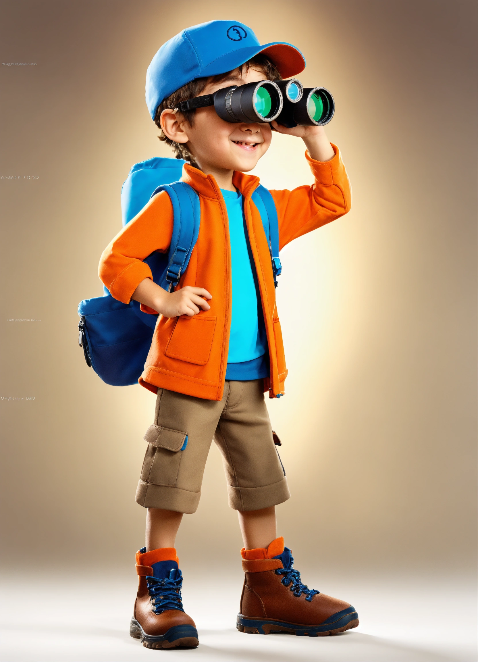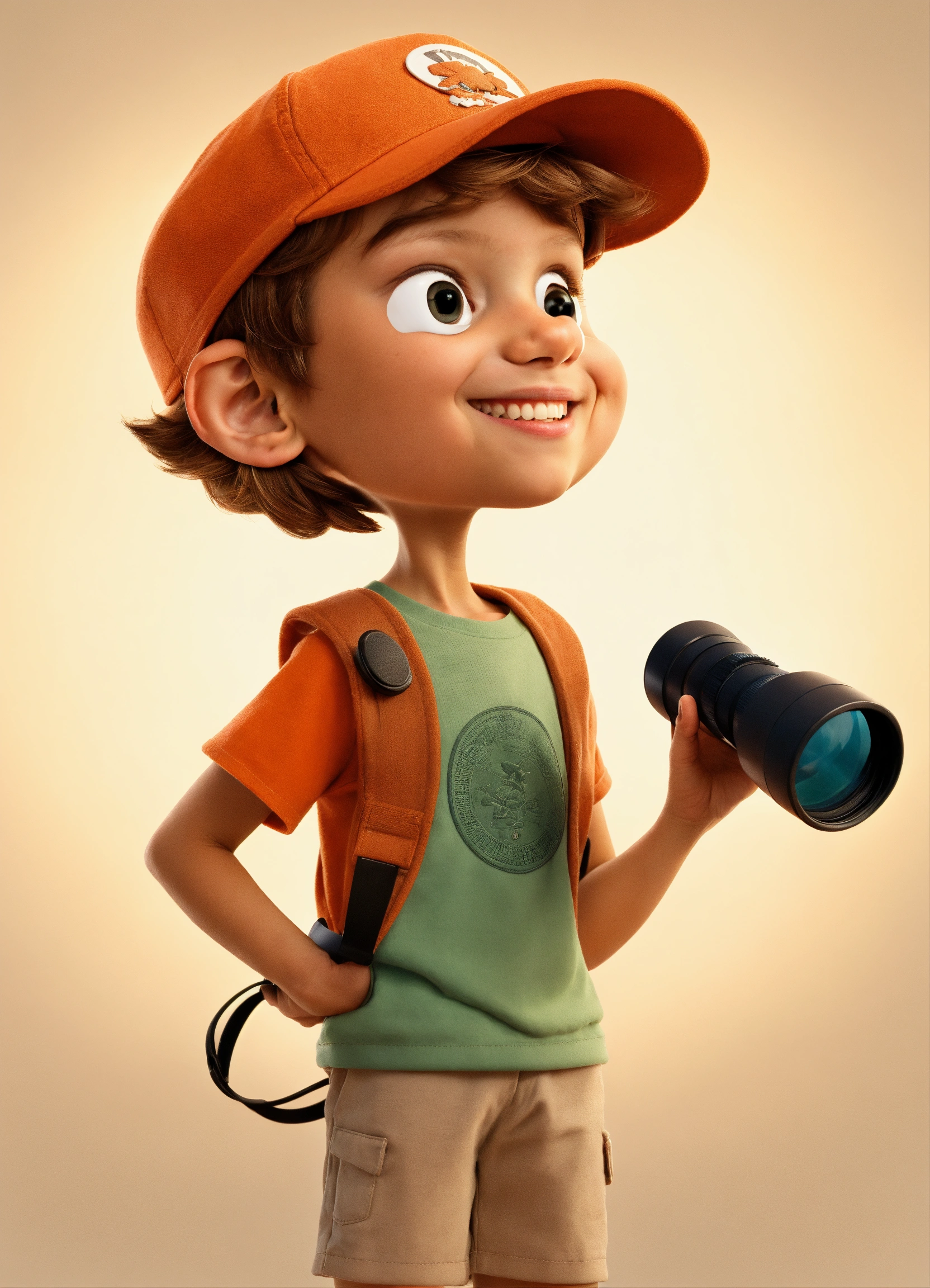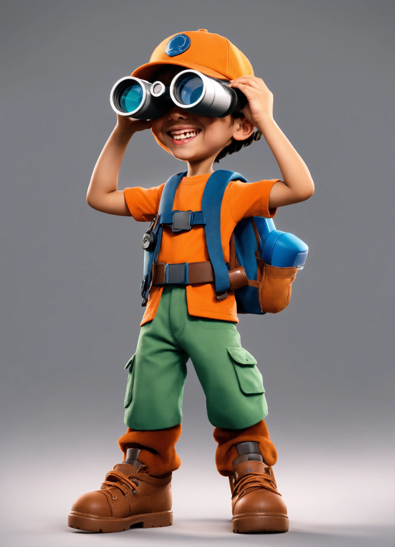 8 year old. happy boy with light skin, with cap, hair in color orang-brown. looking through binoculars. by disney concept artists, elegant, sharp focus. 3d style. happy. white background. full body. looking to the side. .holding binoculars in hand and looking