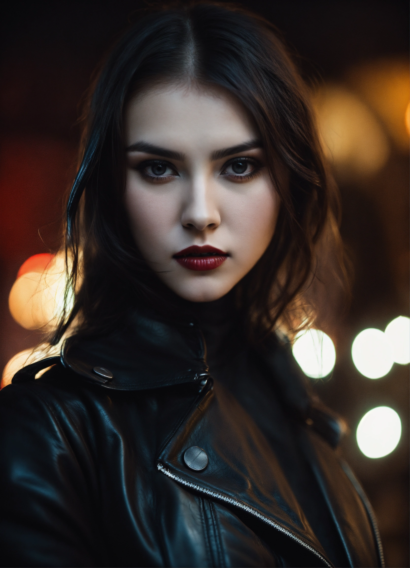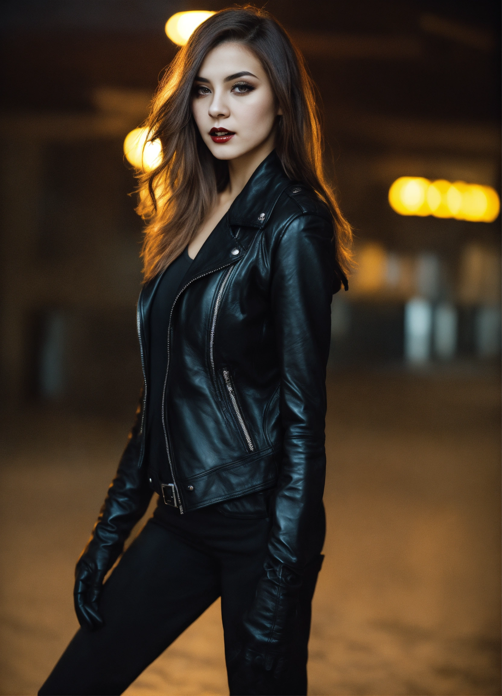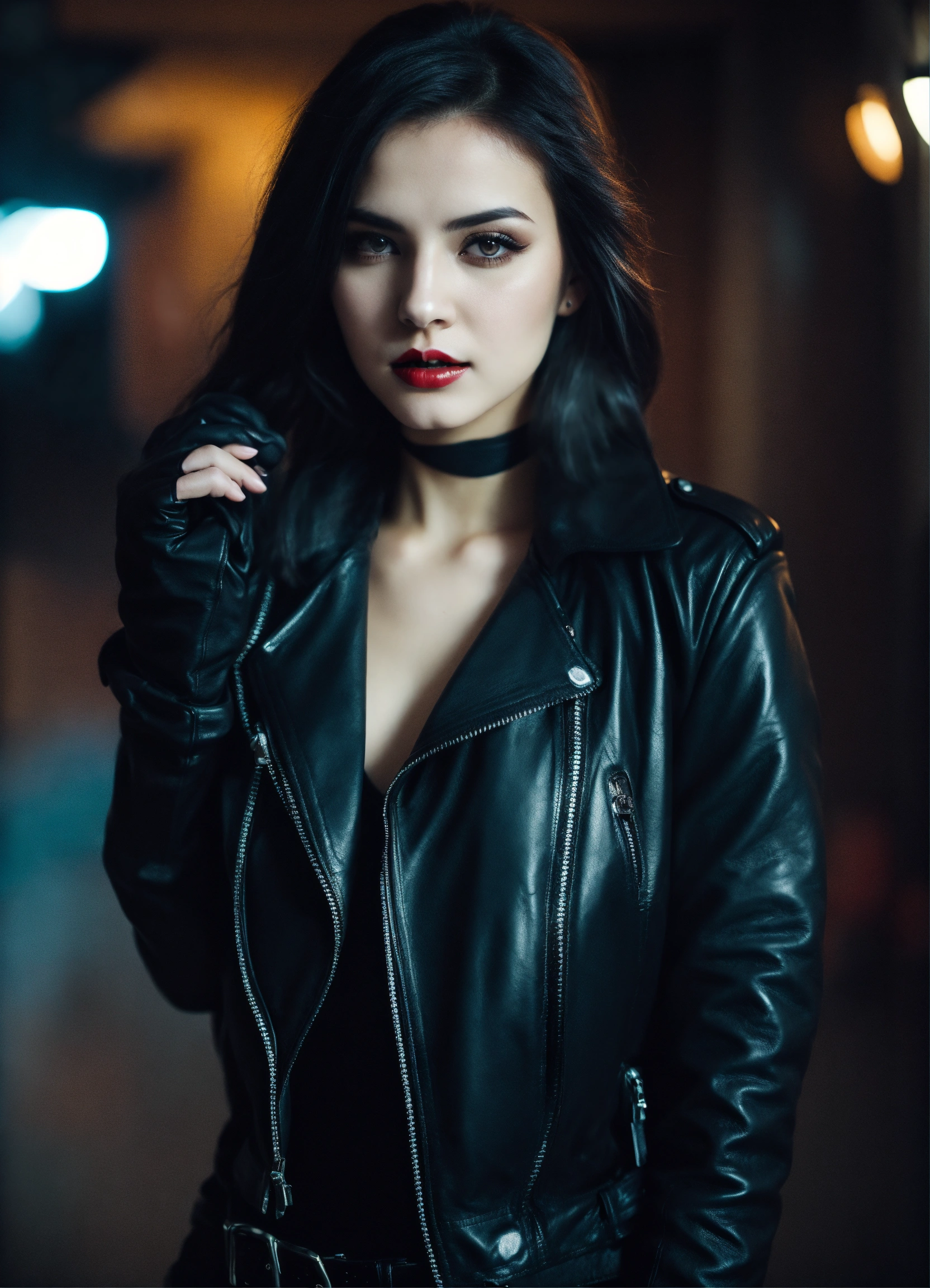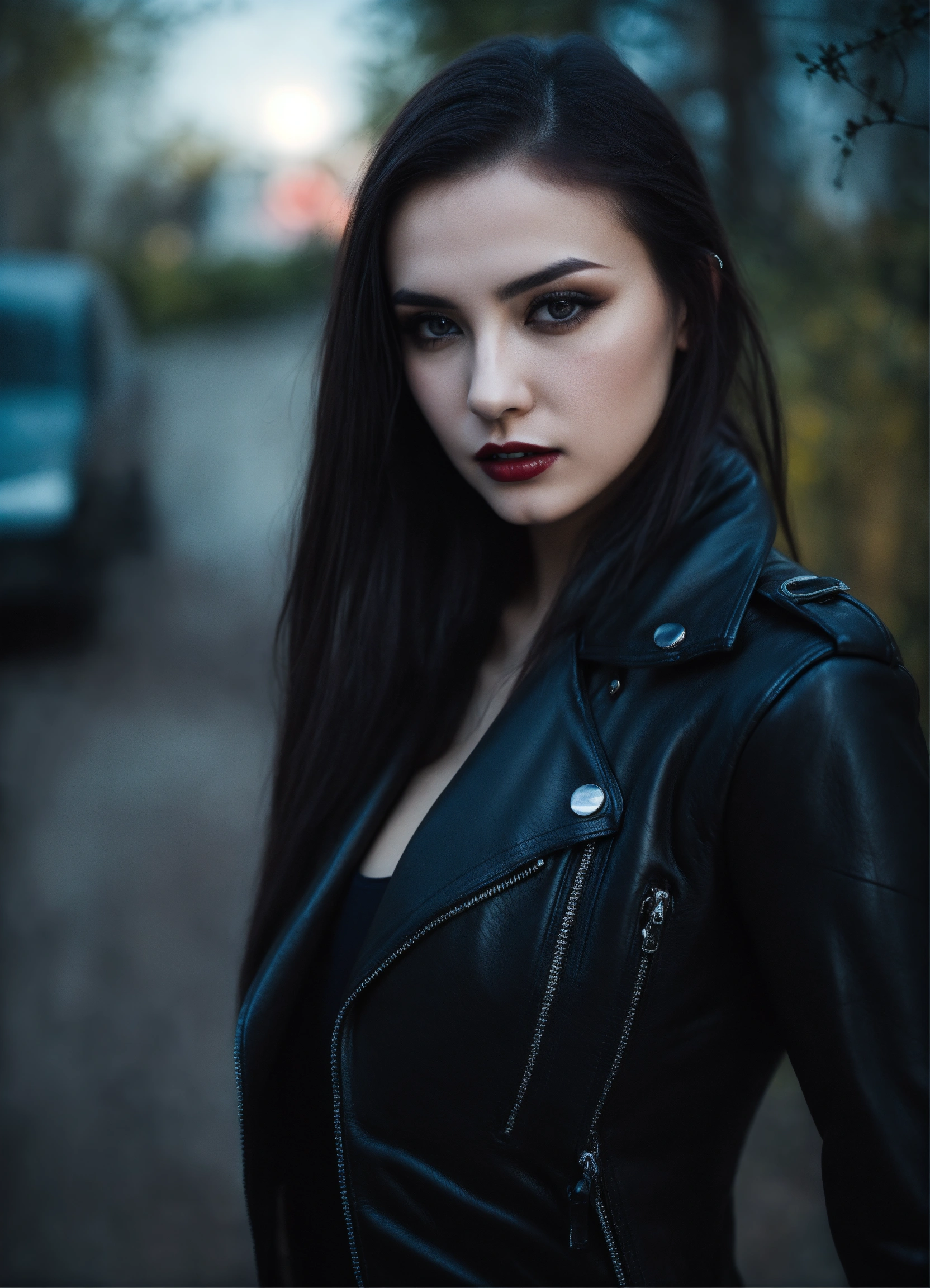 A beautiful obscure girl 25yo, dark eyes, white skin, wear a black clothes, black leather jacket and gloves, ultra hd, vampire