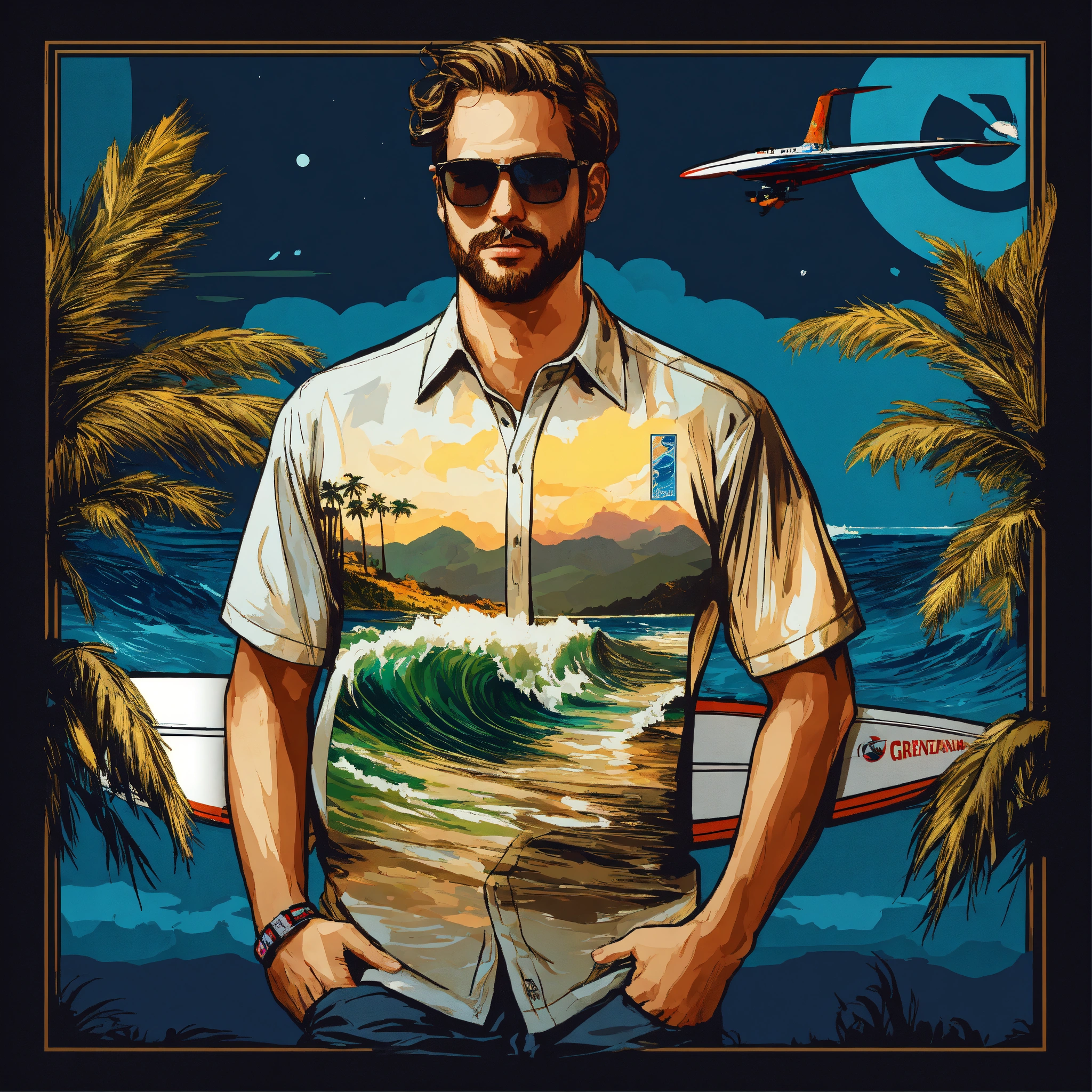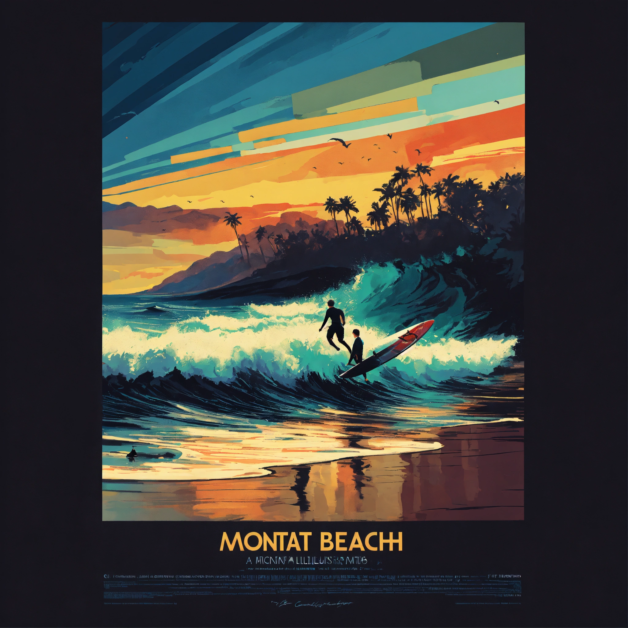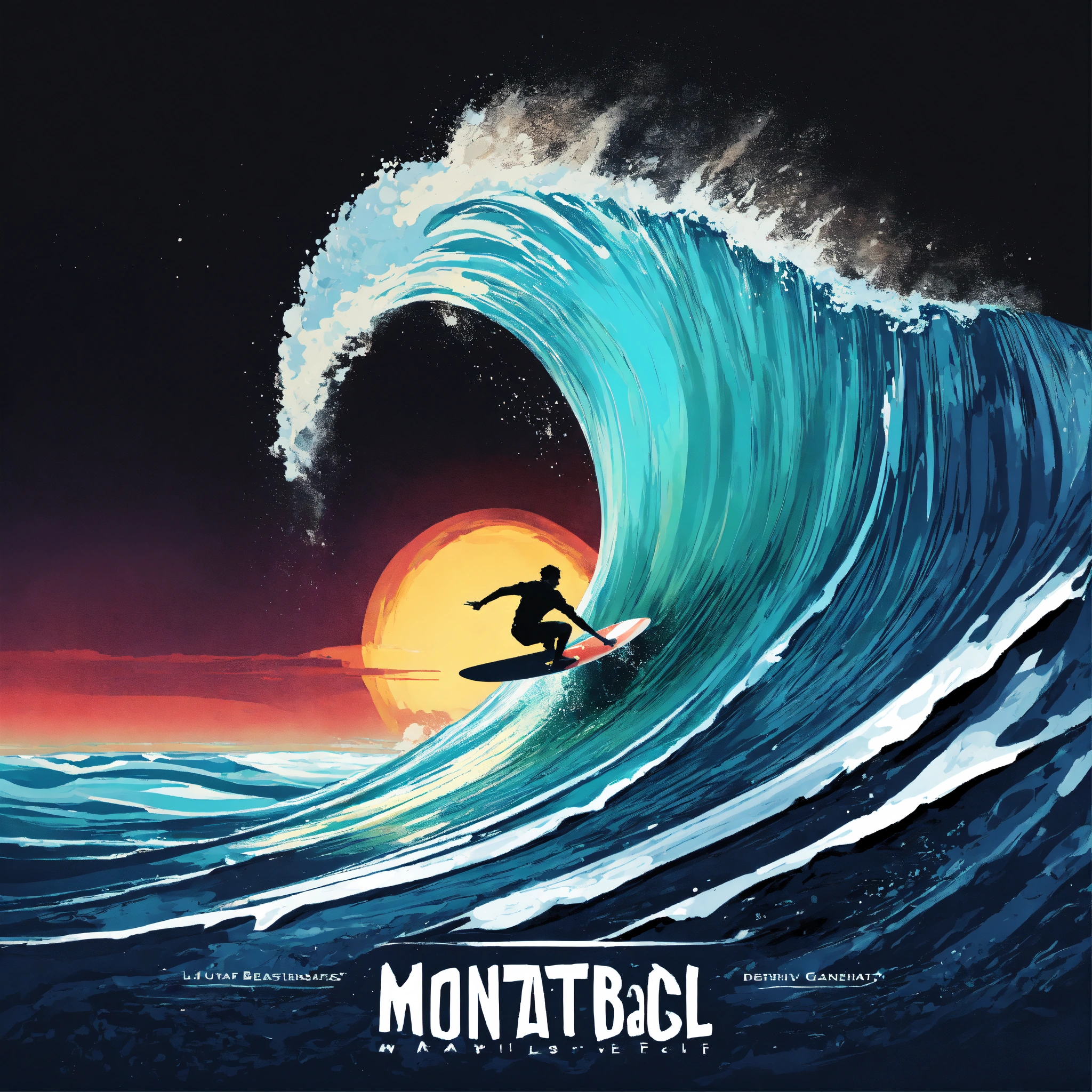 Vector logo-shirt, title "montabeach" a poster with ultra realistic surfing, with the words of daniel castancarne griffithsandreas lieruss millsleonid afremov, black background