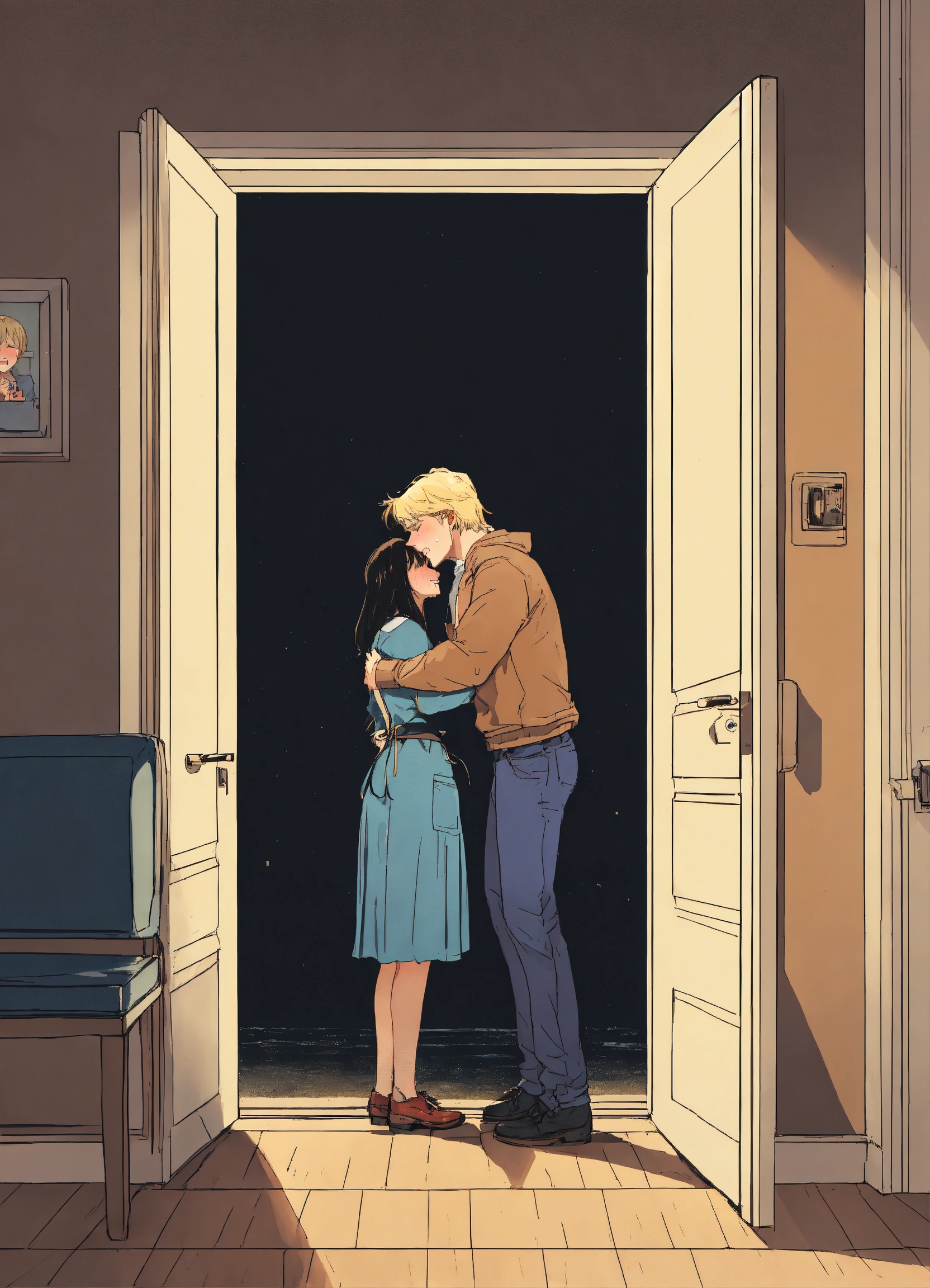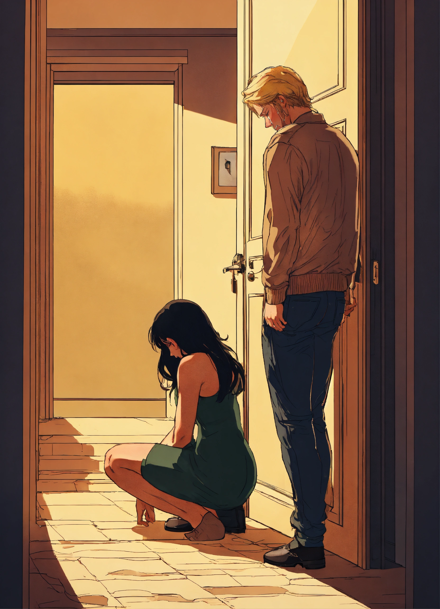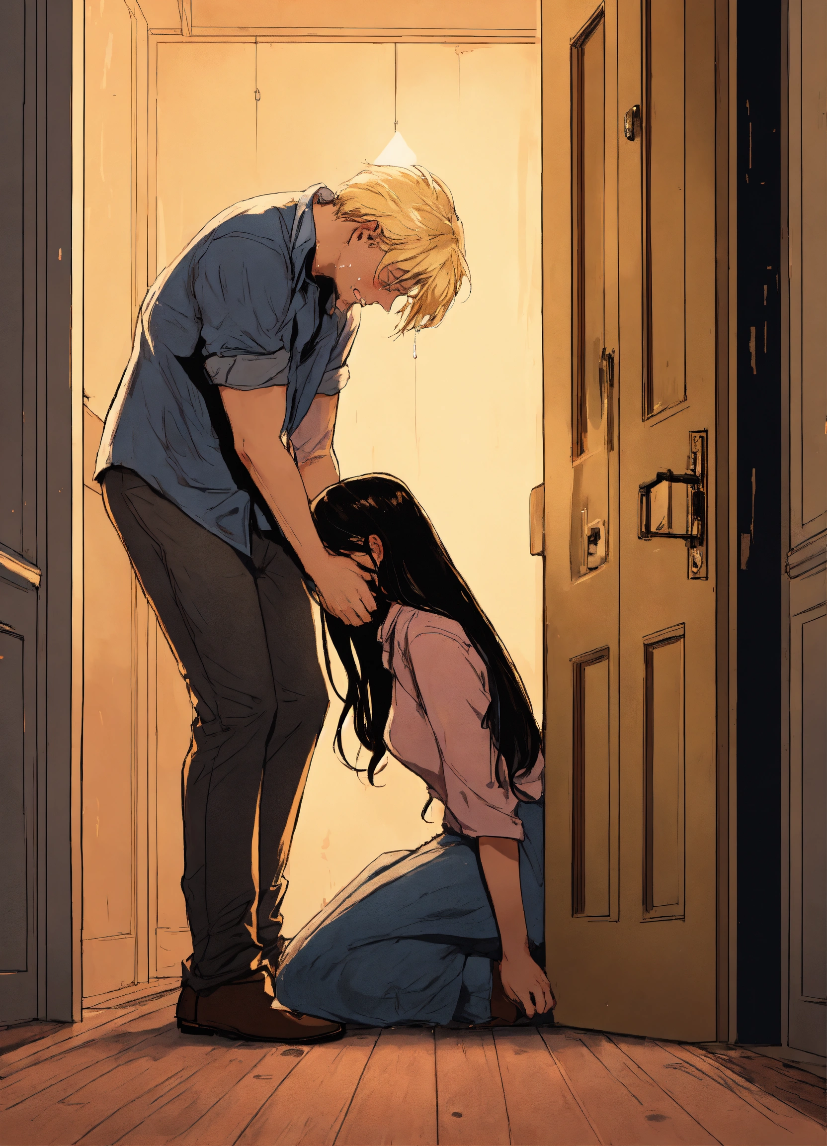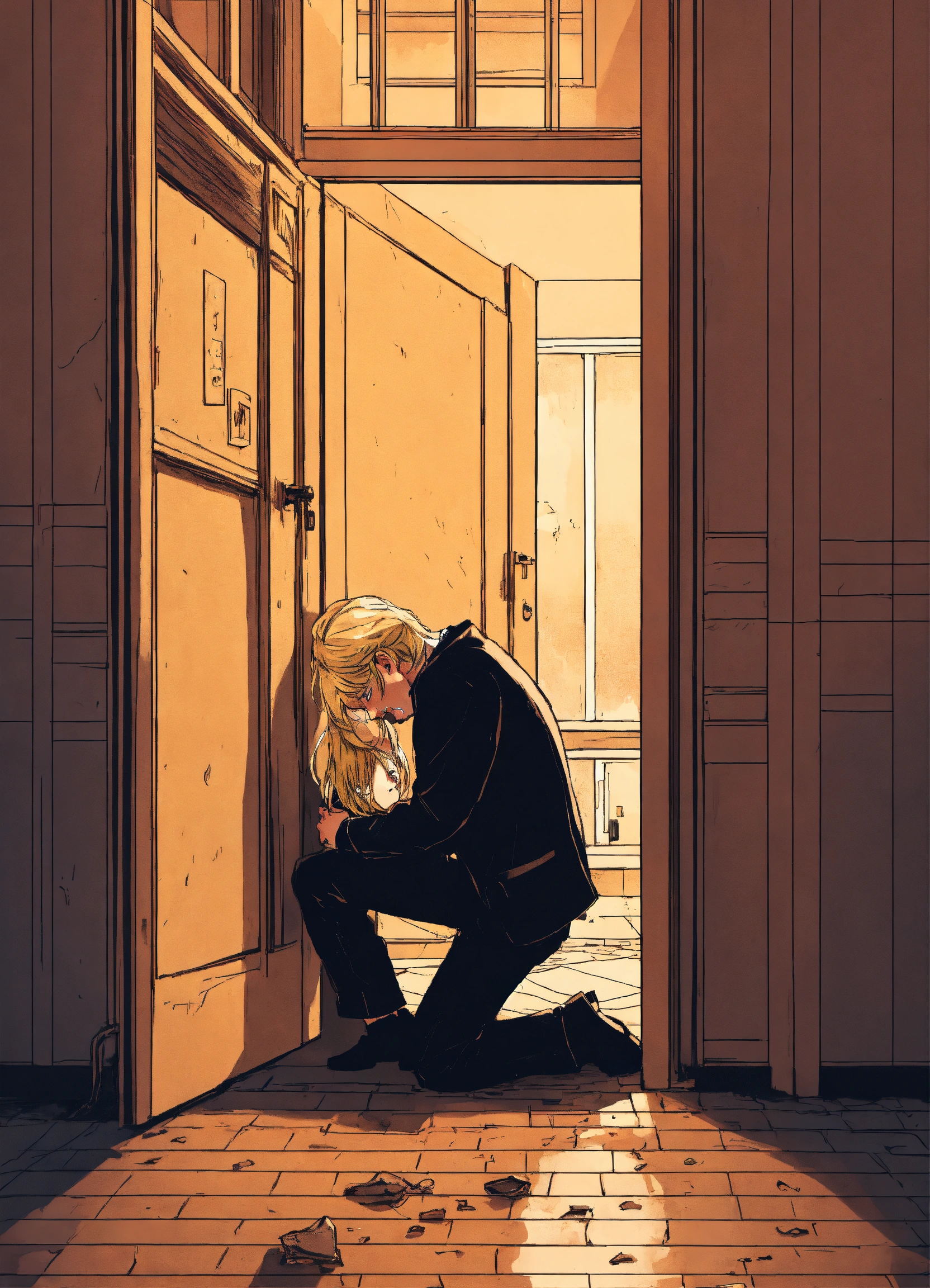 A blond man crying watching a dark-haired girl walk out the door with her back turned to him as he kneels and clutches his chest in agony