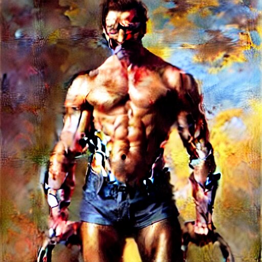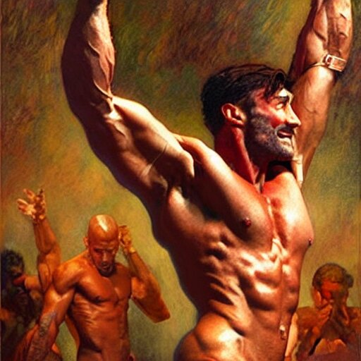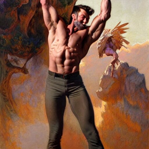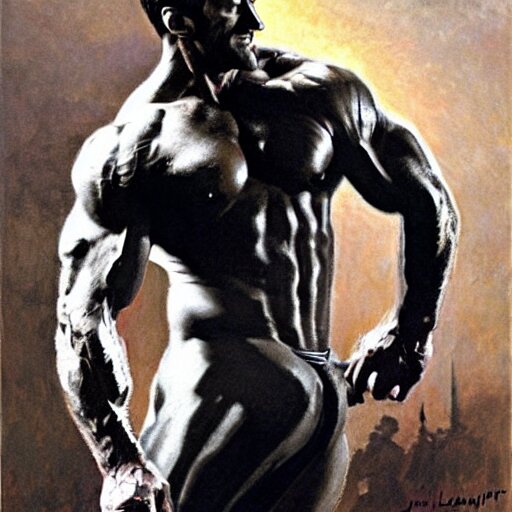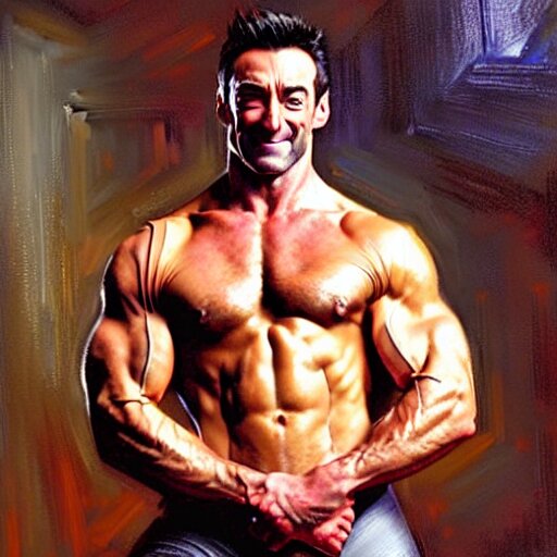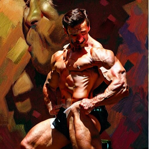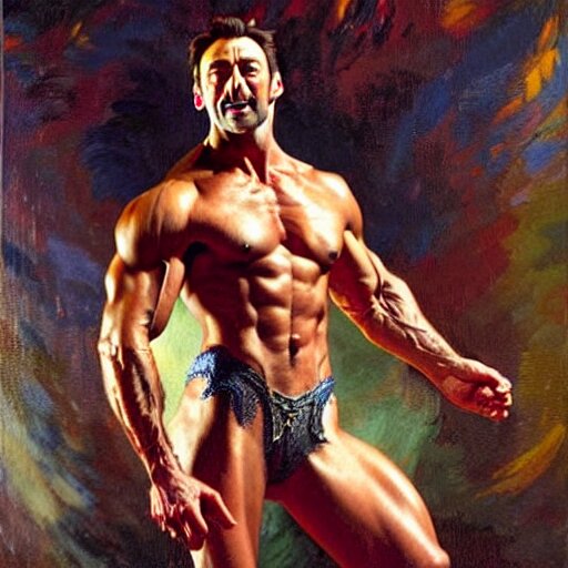 Muscular hugh jackman performs on broadway, painting by gaston bussiere, craig mullins, j. c. leyendecker, tom of finland