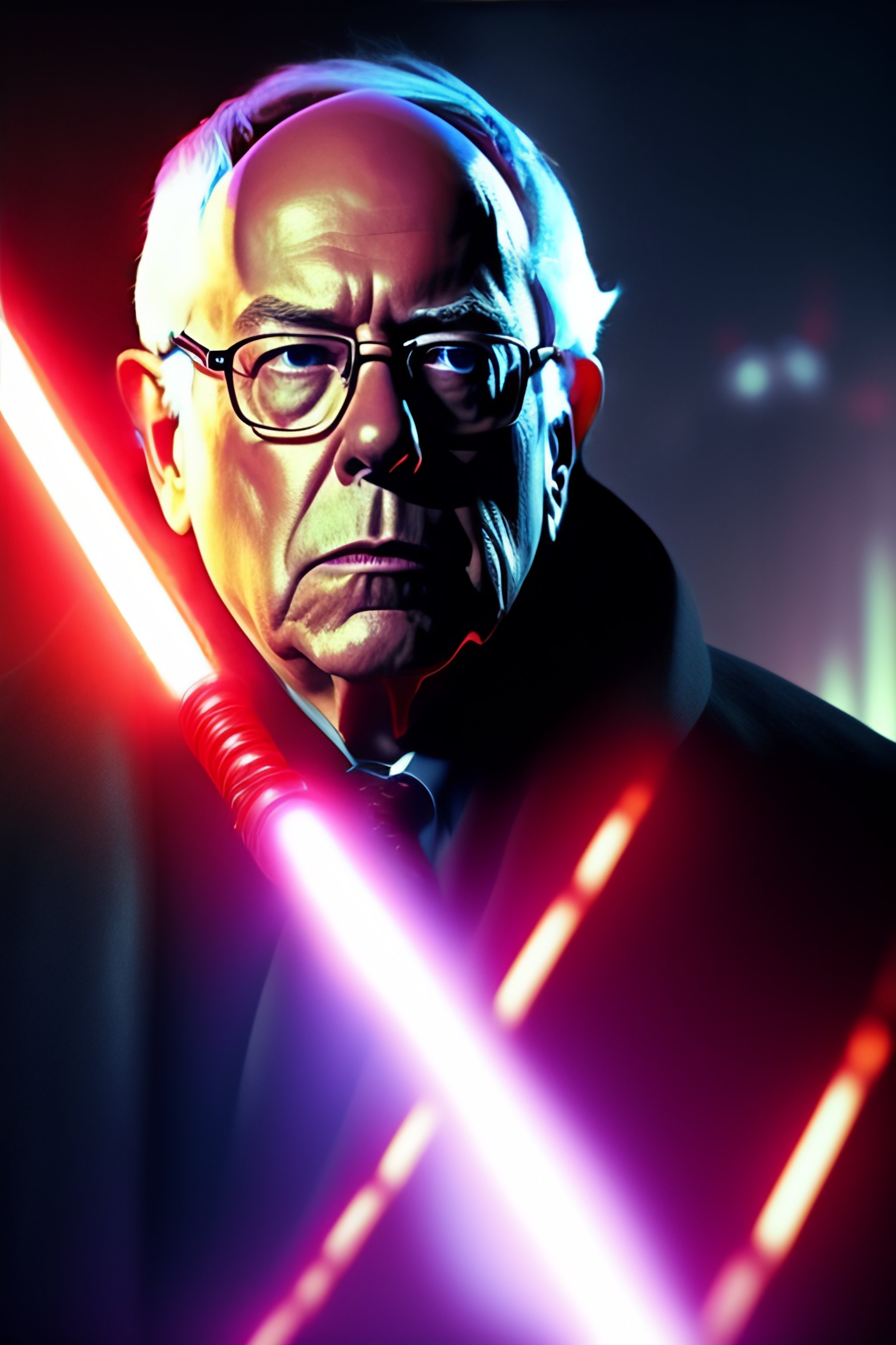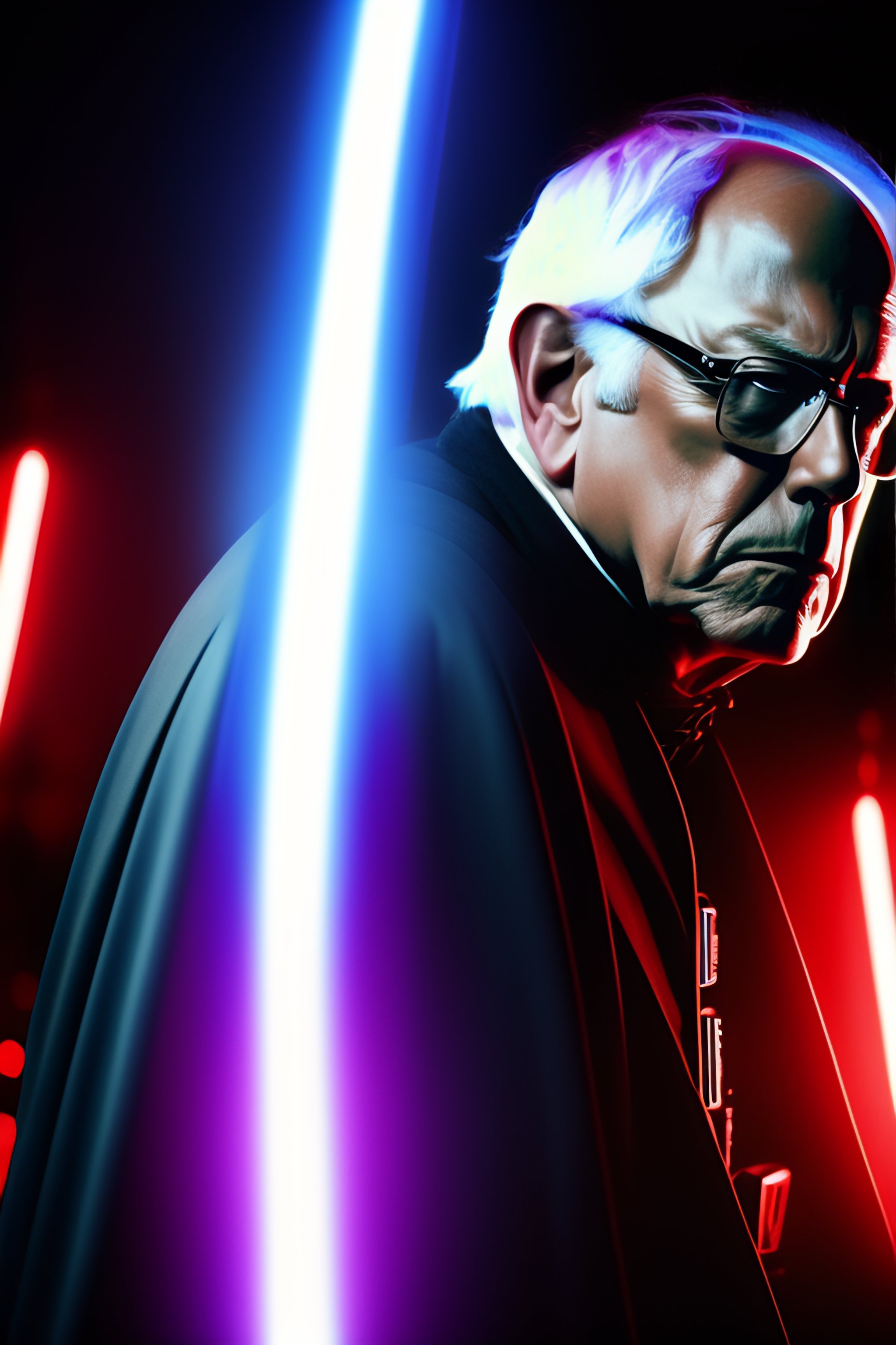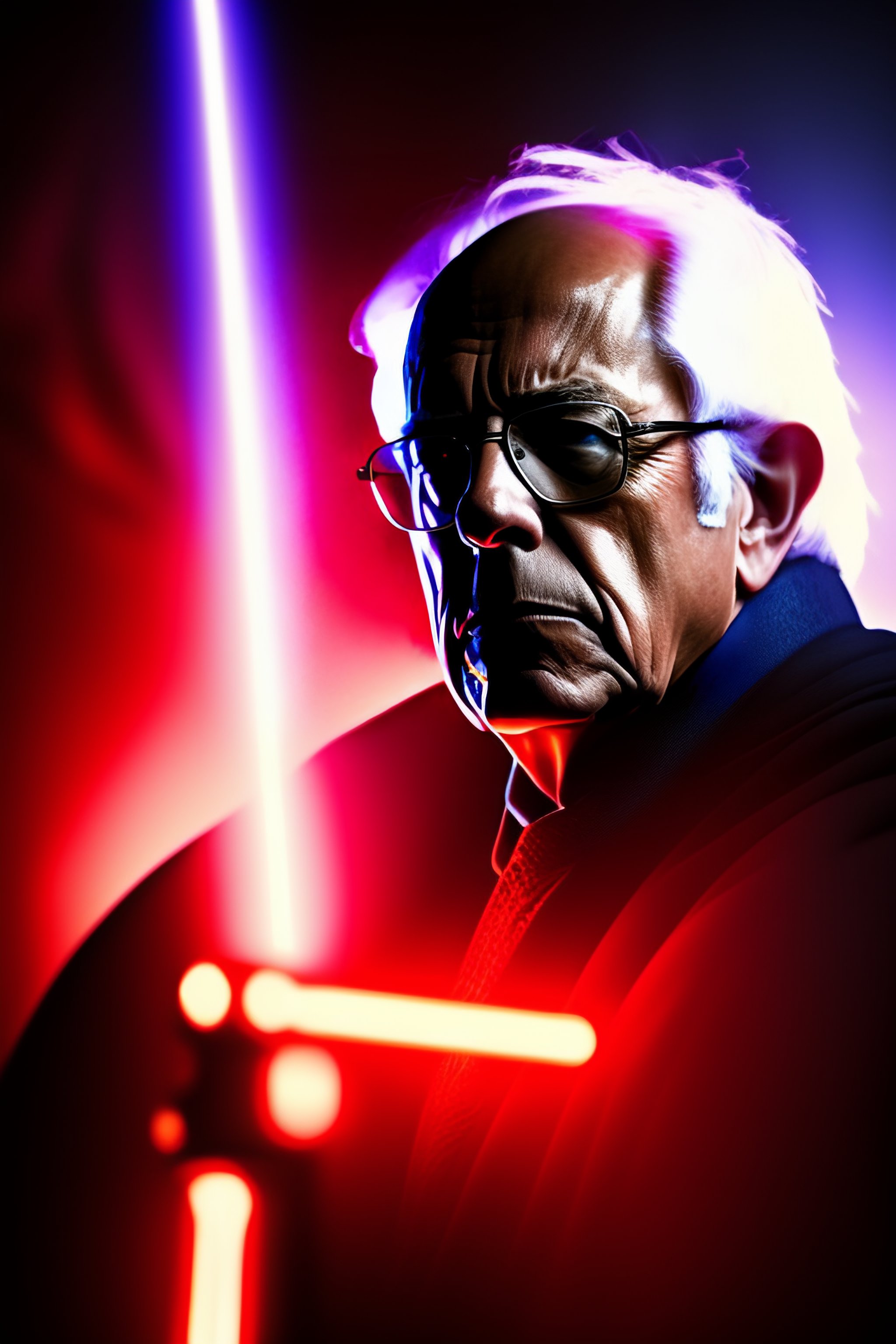 Bernie sanders as a sith lord in starwars revenge of the sith, holding a red lightsaber, evil, splash art, movie still, cinematic lighting, dramatic, octane render, long lens, shallow depth of field, bokeh, anamorphic lens flare, 8 k, hyper detailed, 3 5 mm film grain