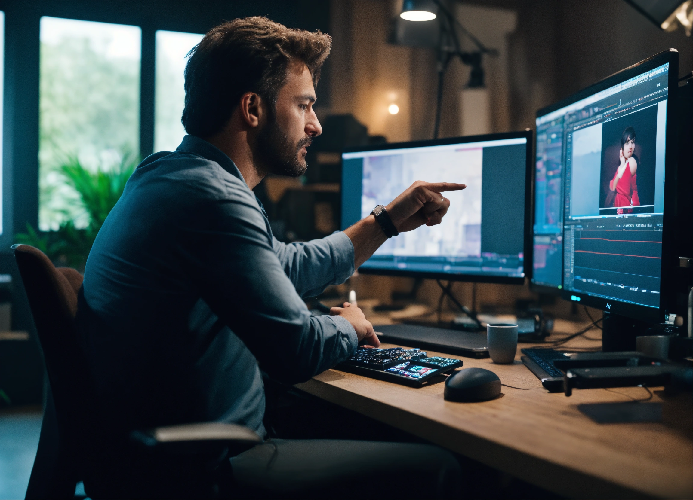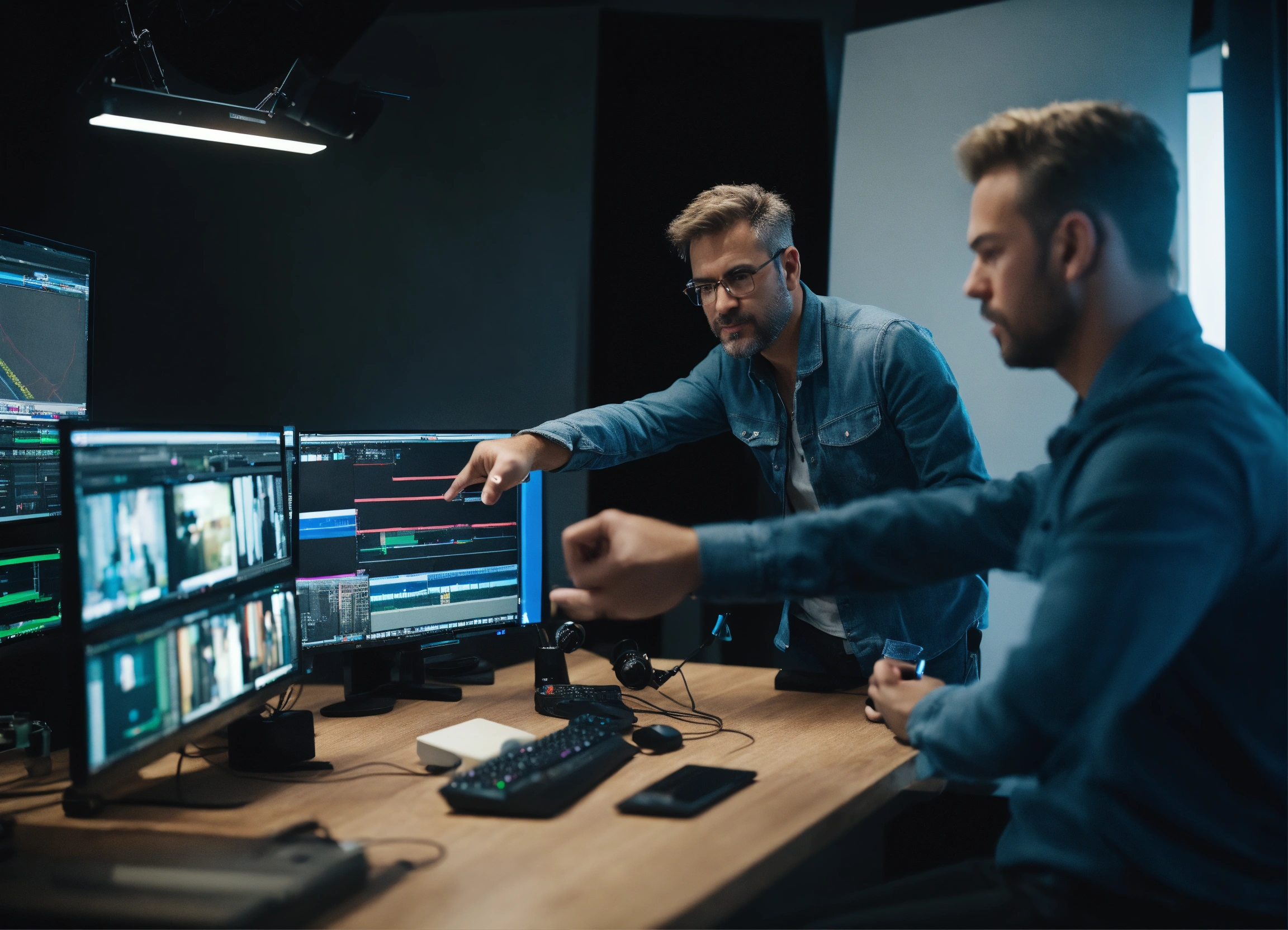 Photo director in the studio - the director is standing next to the editor, pointing his fingers at the computer screen and saying something. the screen shows that the video is being edited. realistic. soft focus. clear beautiful facial features. 3d. full frame.