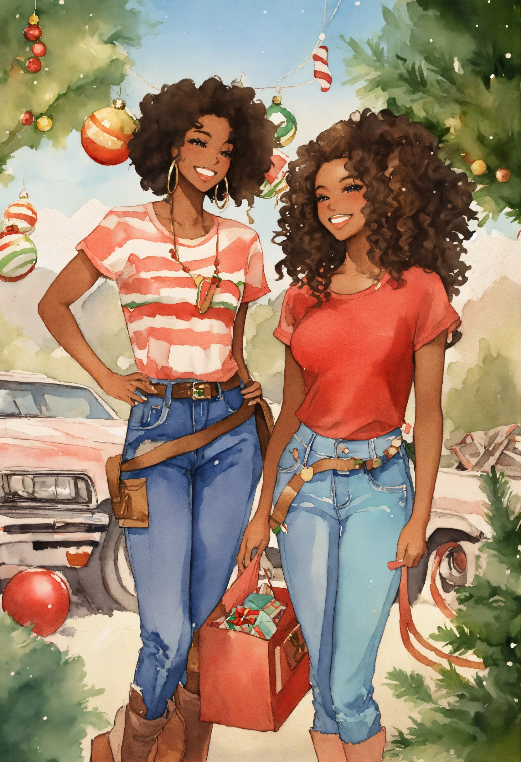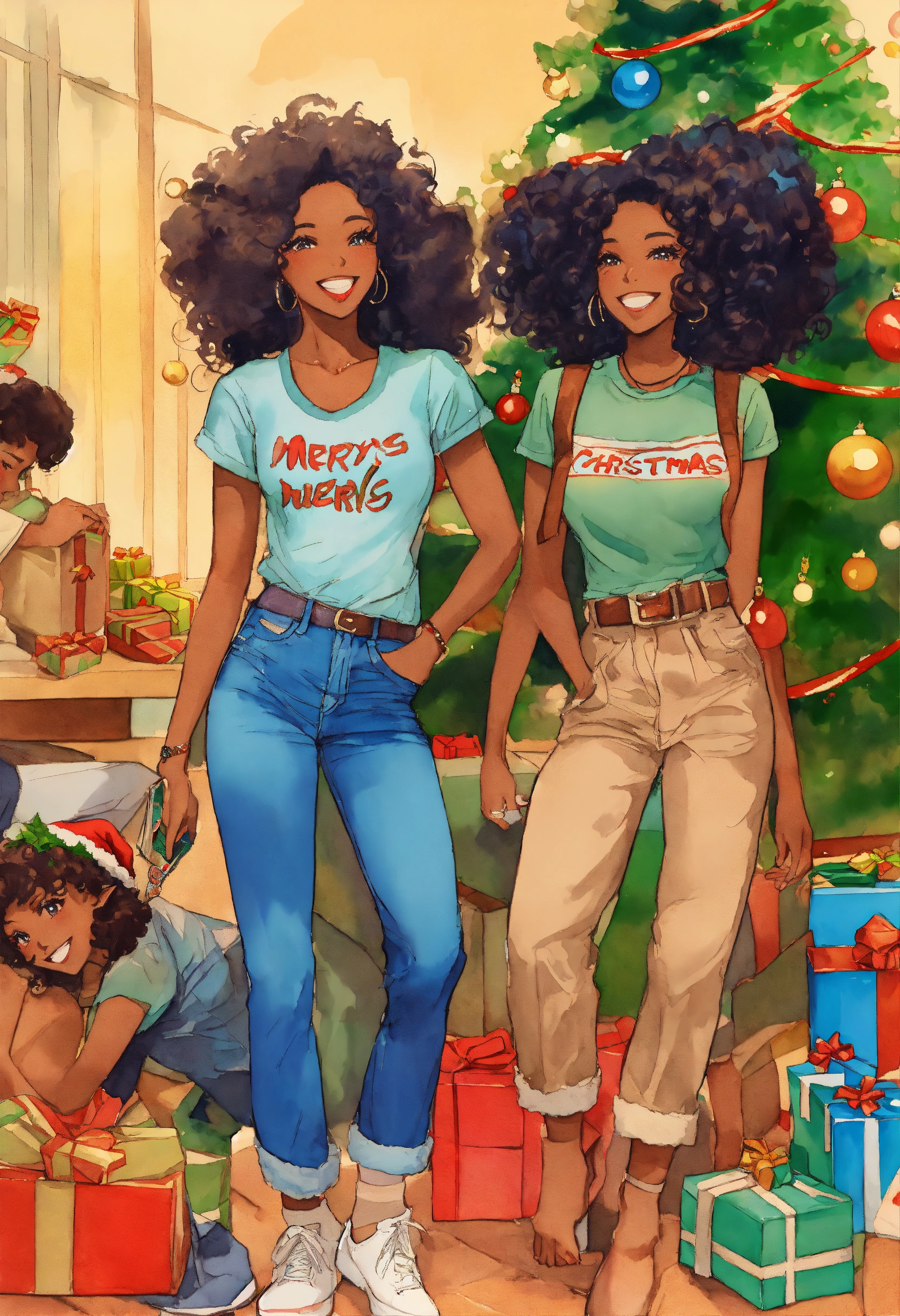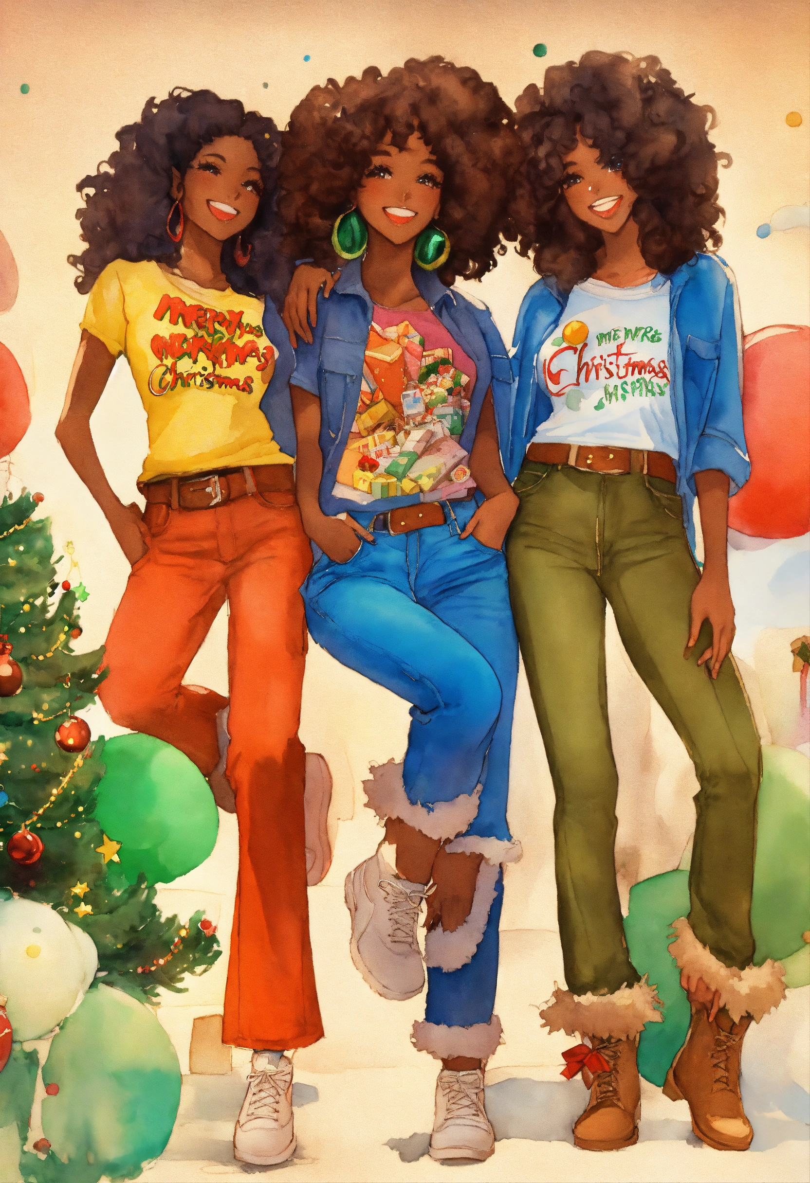 The 70’s retro advertising art, smiling year dark complexion christmas adult women elves, flowing glossy locs and wispy coil curls, with various colorful tshirts, cargo pants and ripped distressed blue jeans, presents 🎁 . rule of thirds. we wish you a merry christmas outdoor southern cali party theme. moe anime style. watercolor