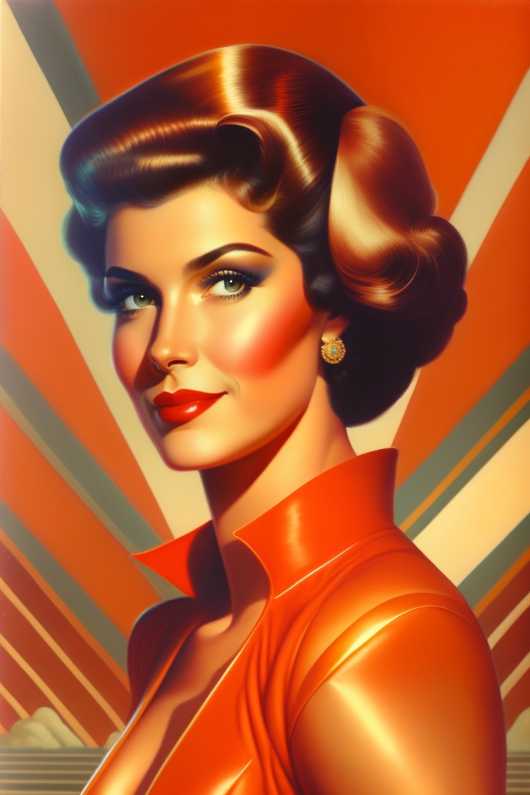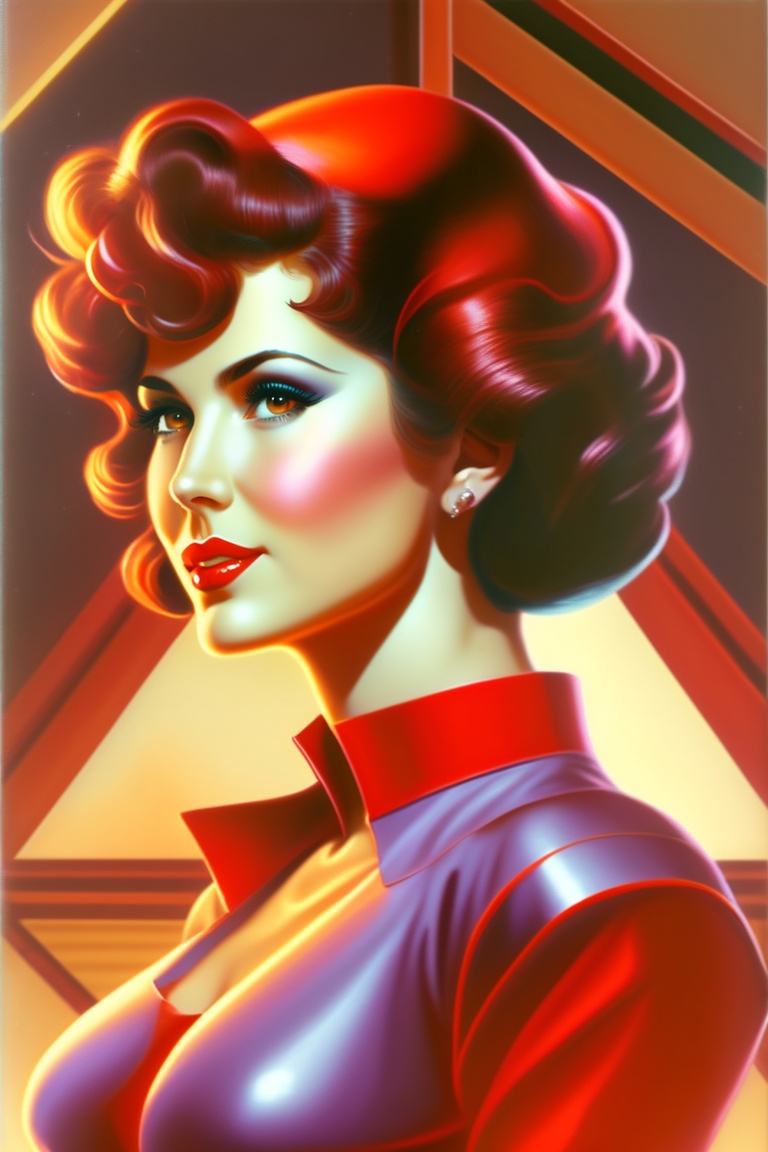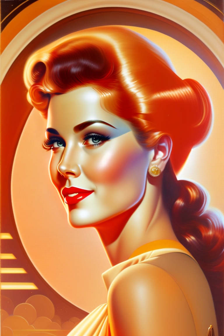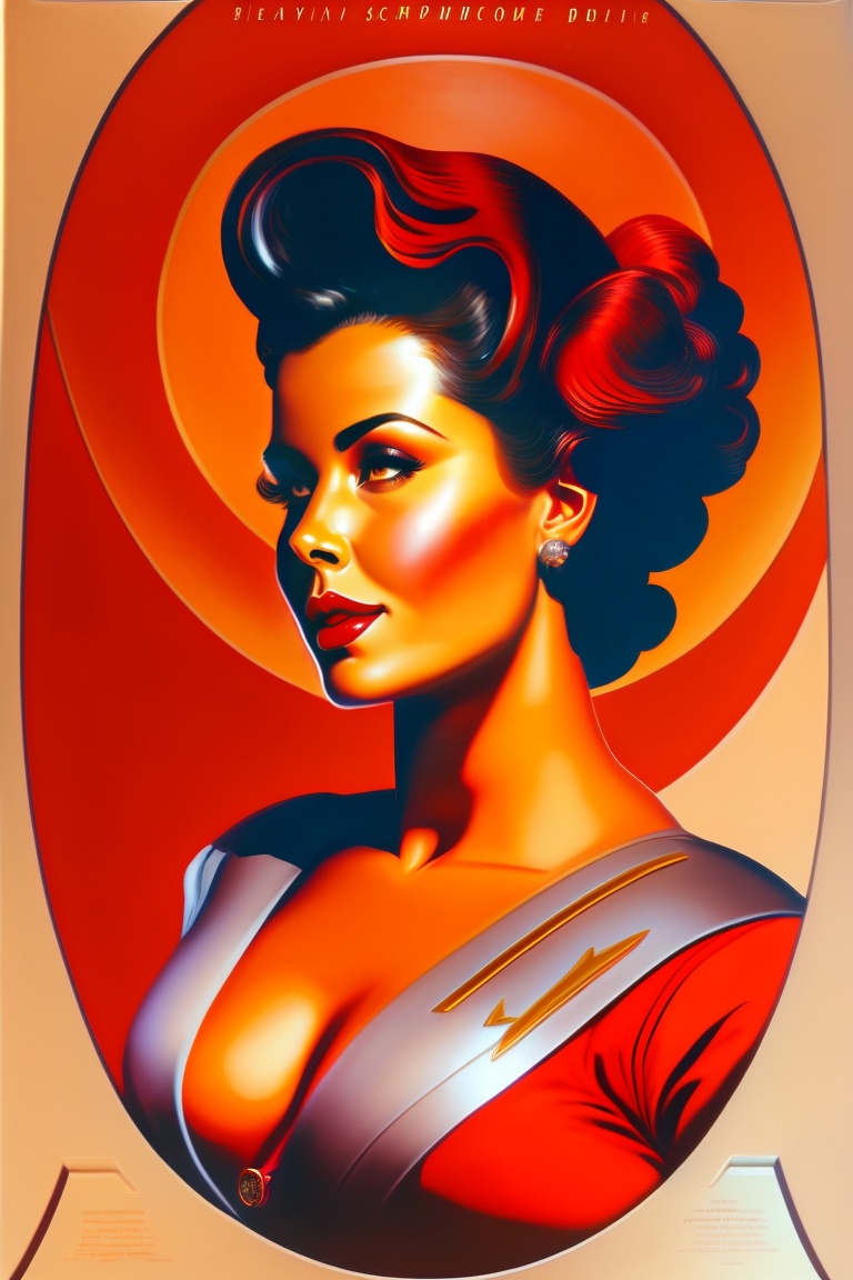 Portrait woman, brune, sci fi 50's, vintage, flash gordon style, alex raymond style, illustration, old school, big city in backround, starships in the sky, cameo colors