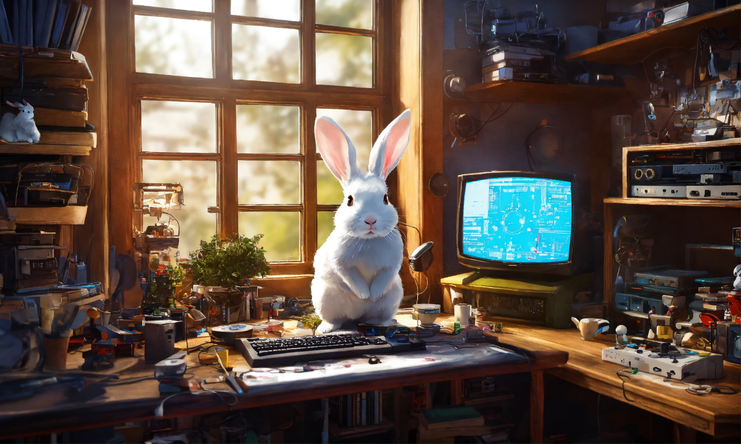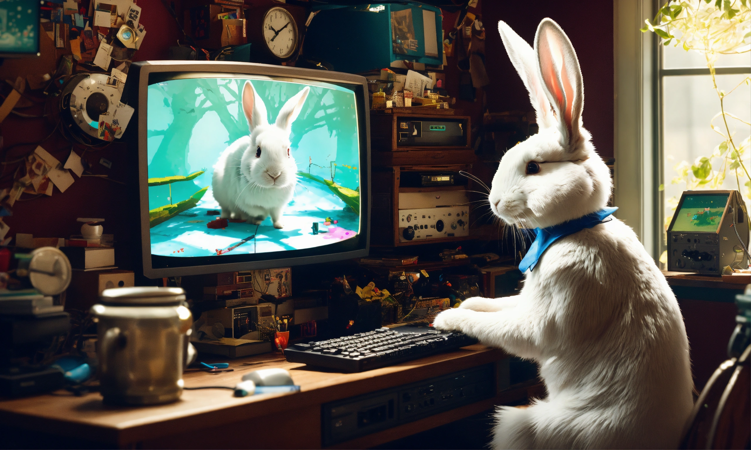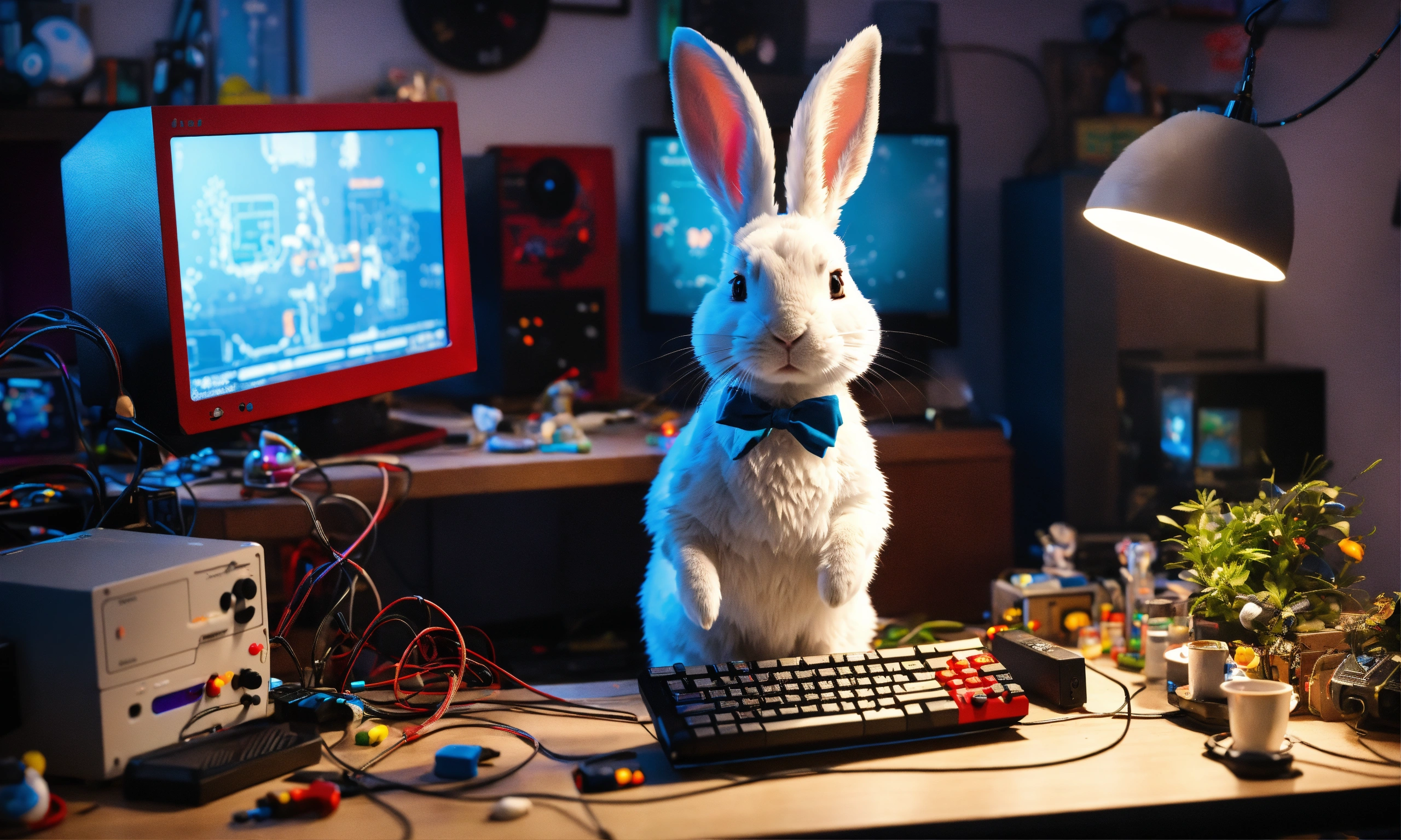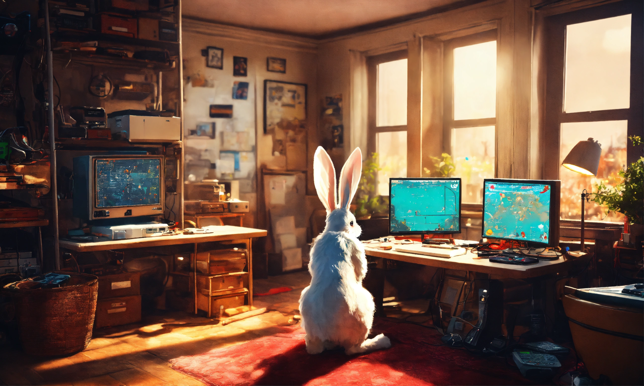 A white rabbit, in the style of alice in wonderland is a software developer beta testing video games in a messy geeky home office filled with retro video game consoles and computer screens with source code