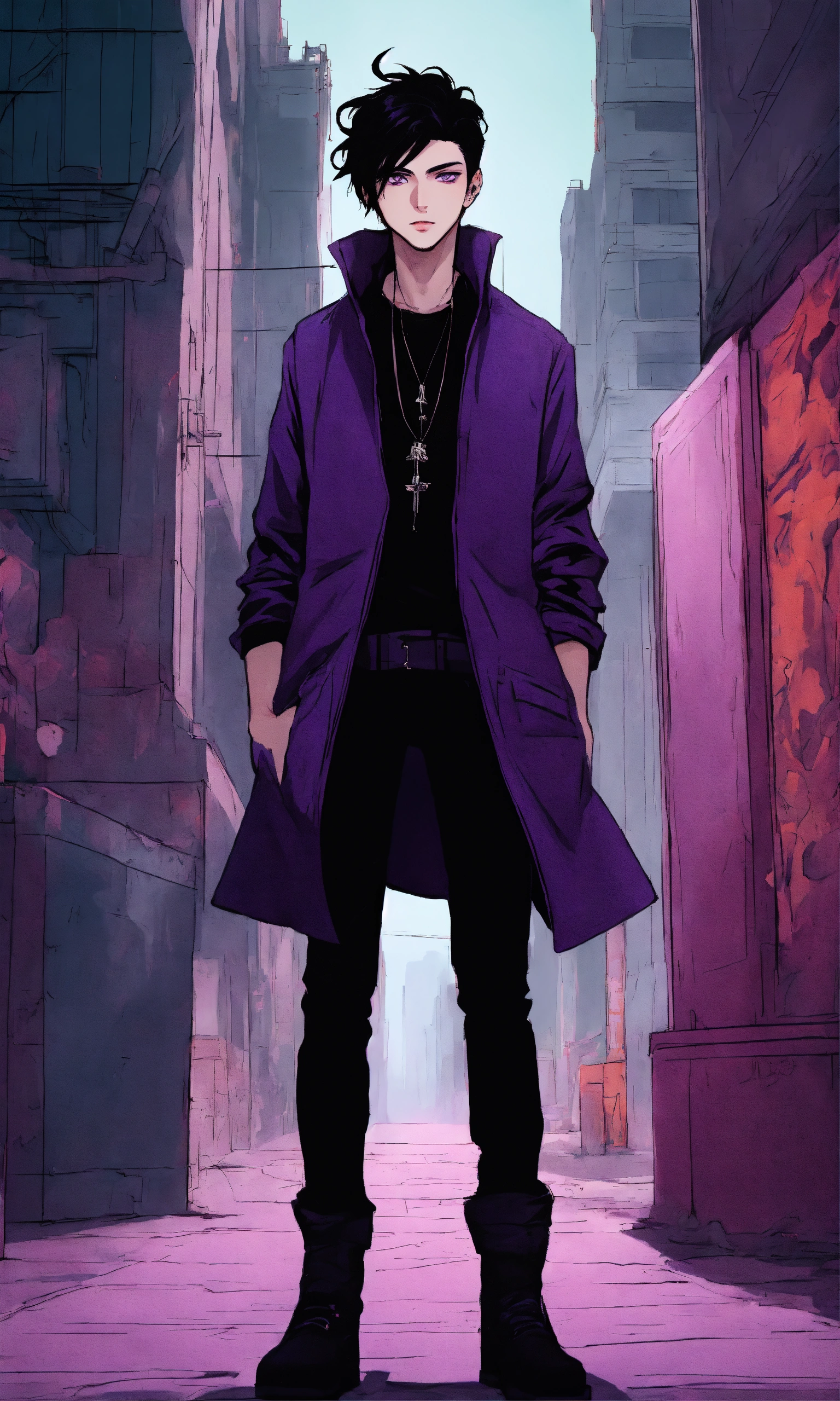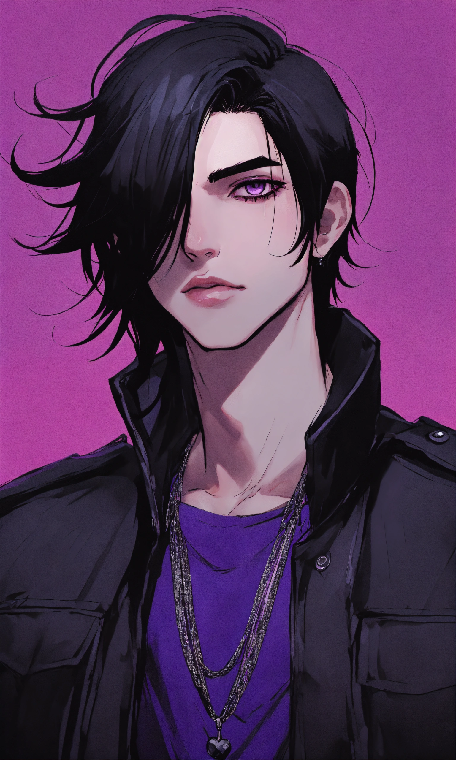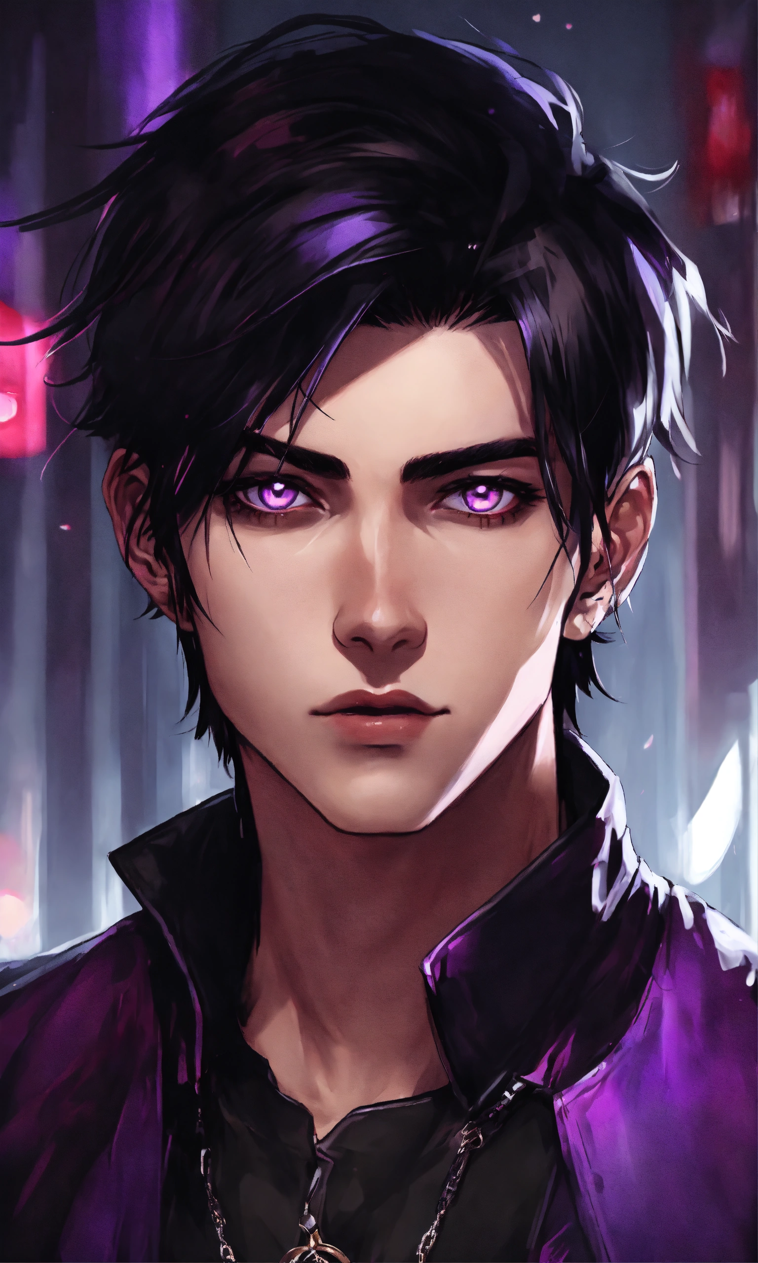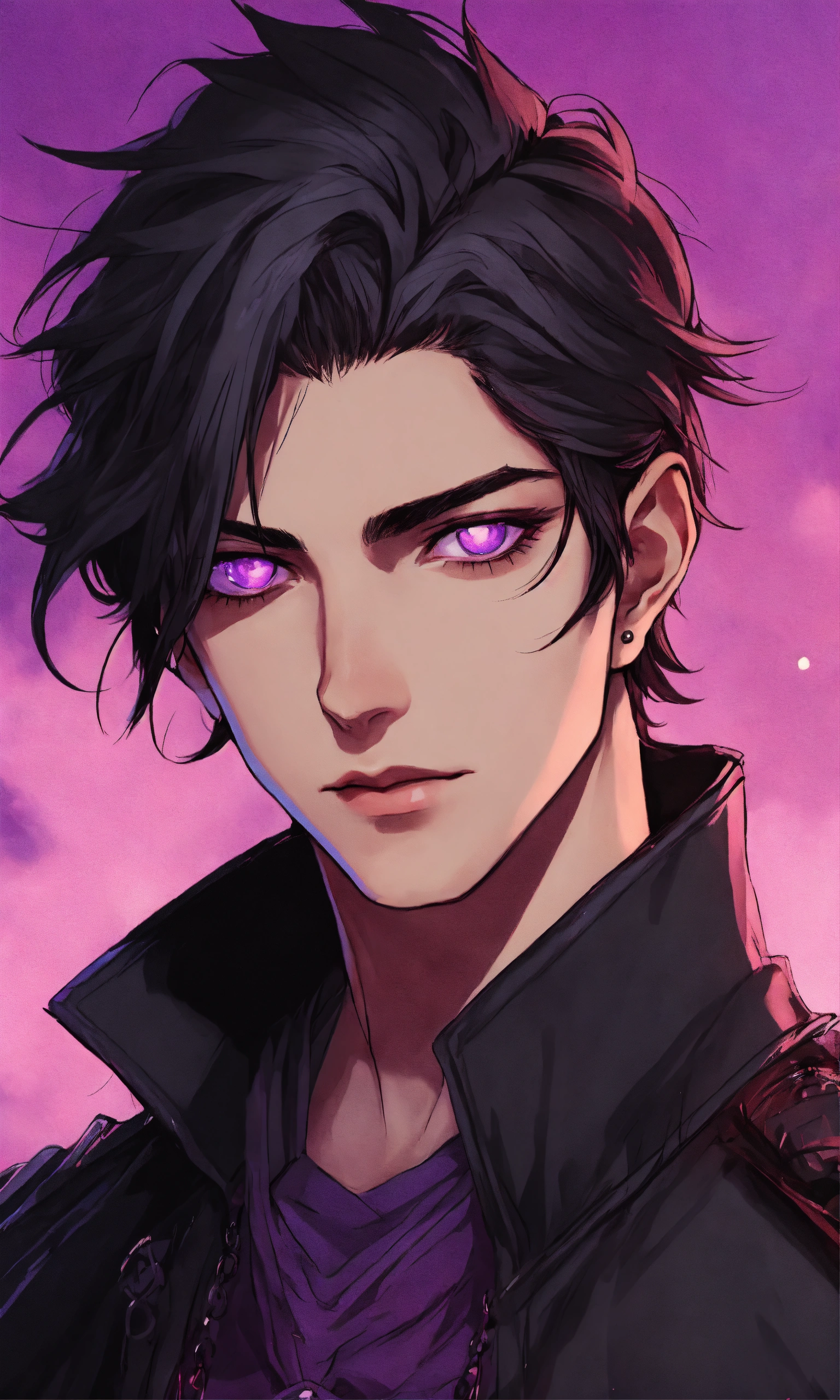 Medium straight black haired goth young guy with purple eyes