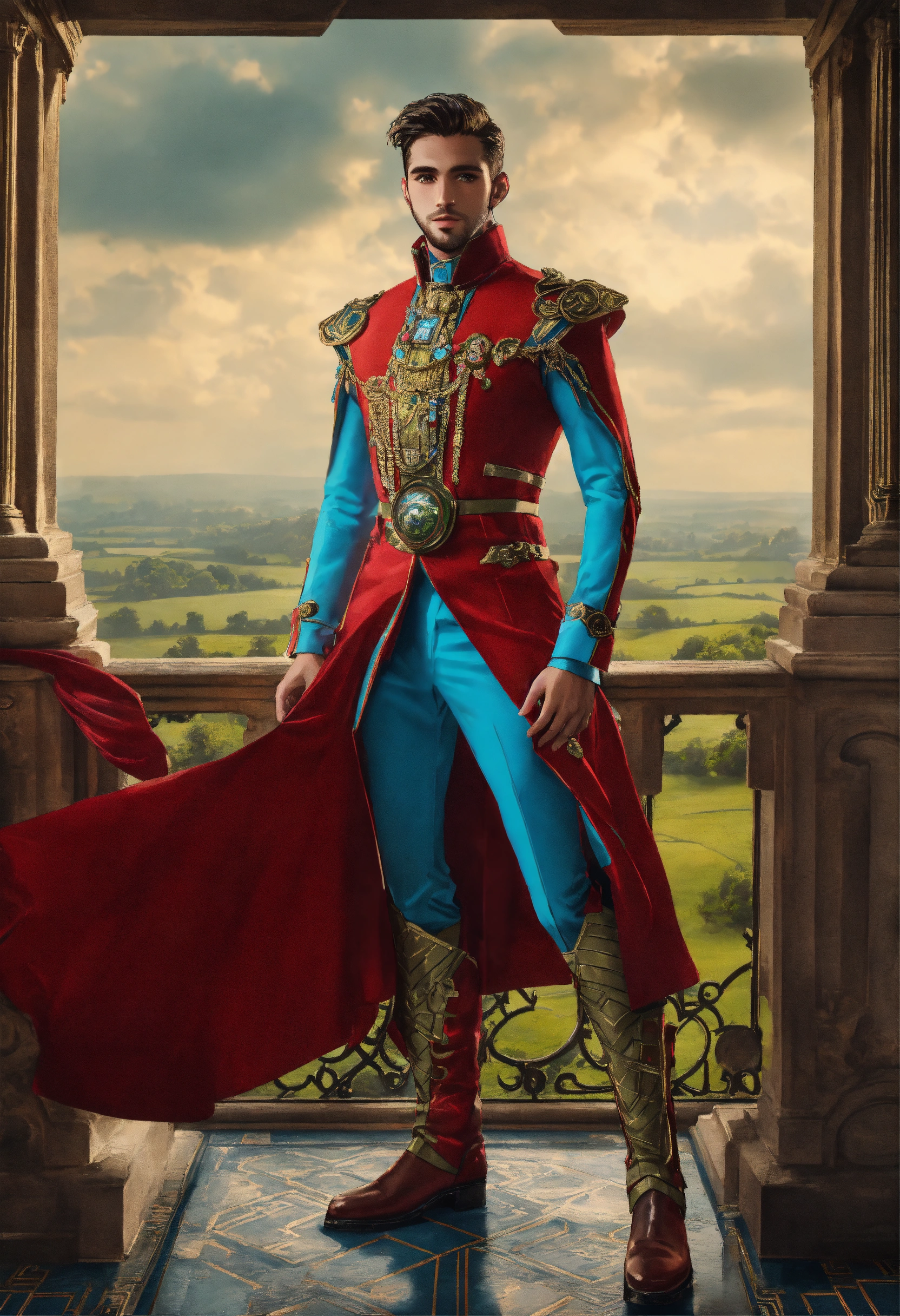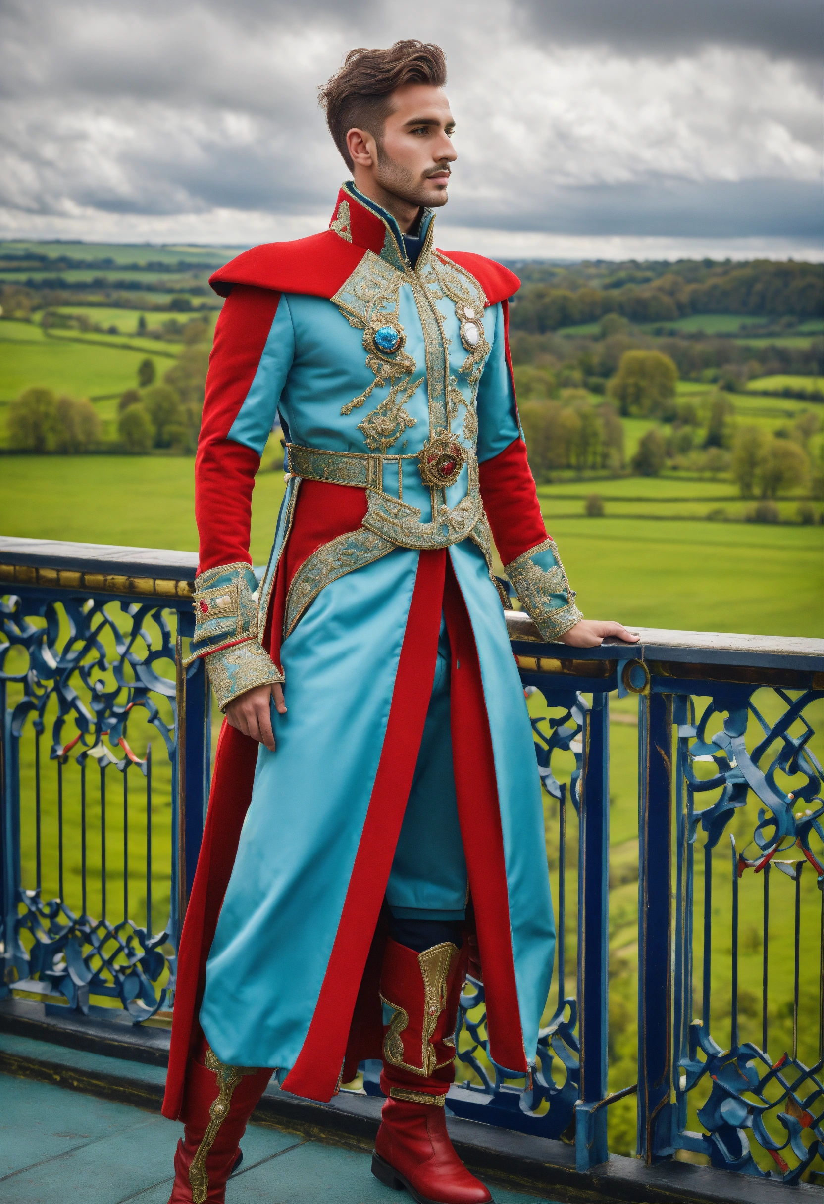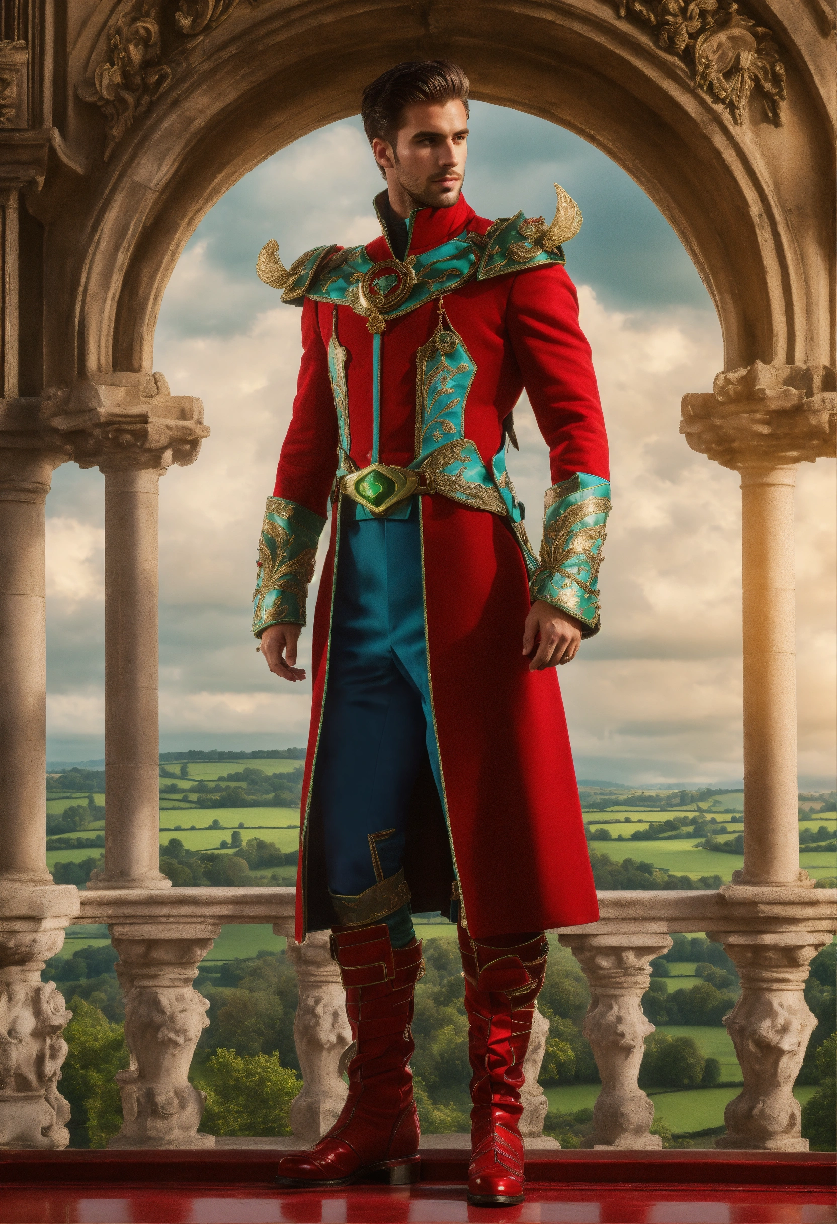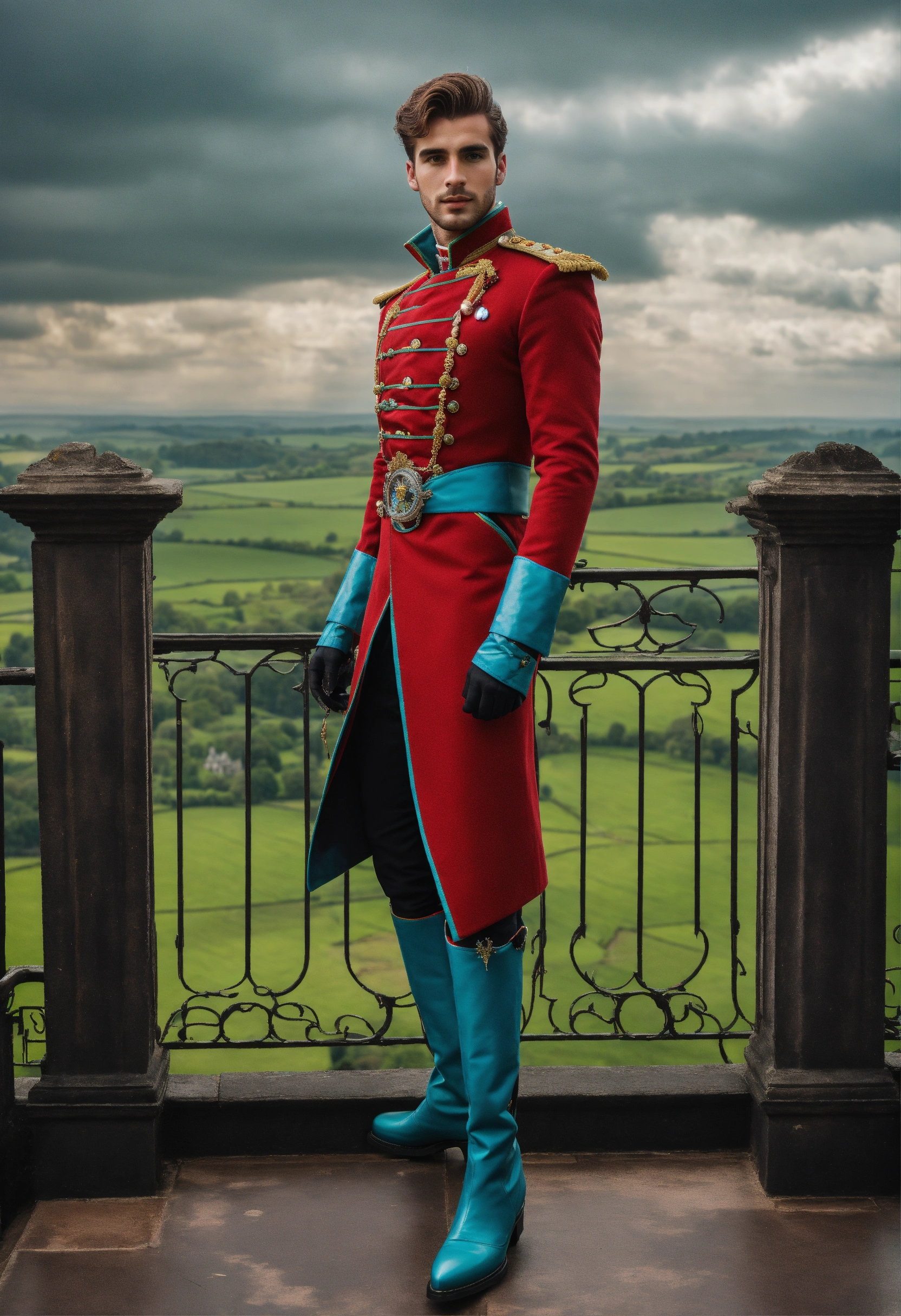 Highly detailed full body of a sci fi aristocrat, royalty, red and light blue and volt green futuristic outfit and boots, standing on palace balcony overlooking the english countryside on a cloudy day, male, handsome, 29 years old, highly detailed