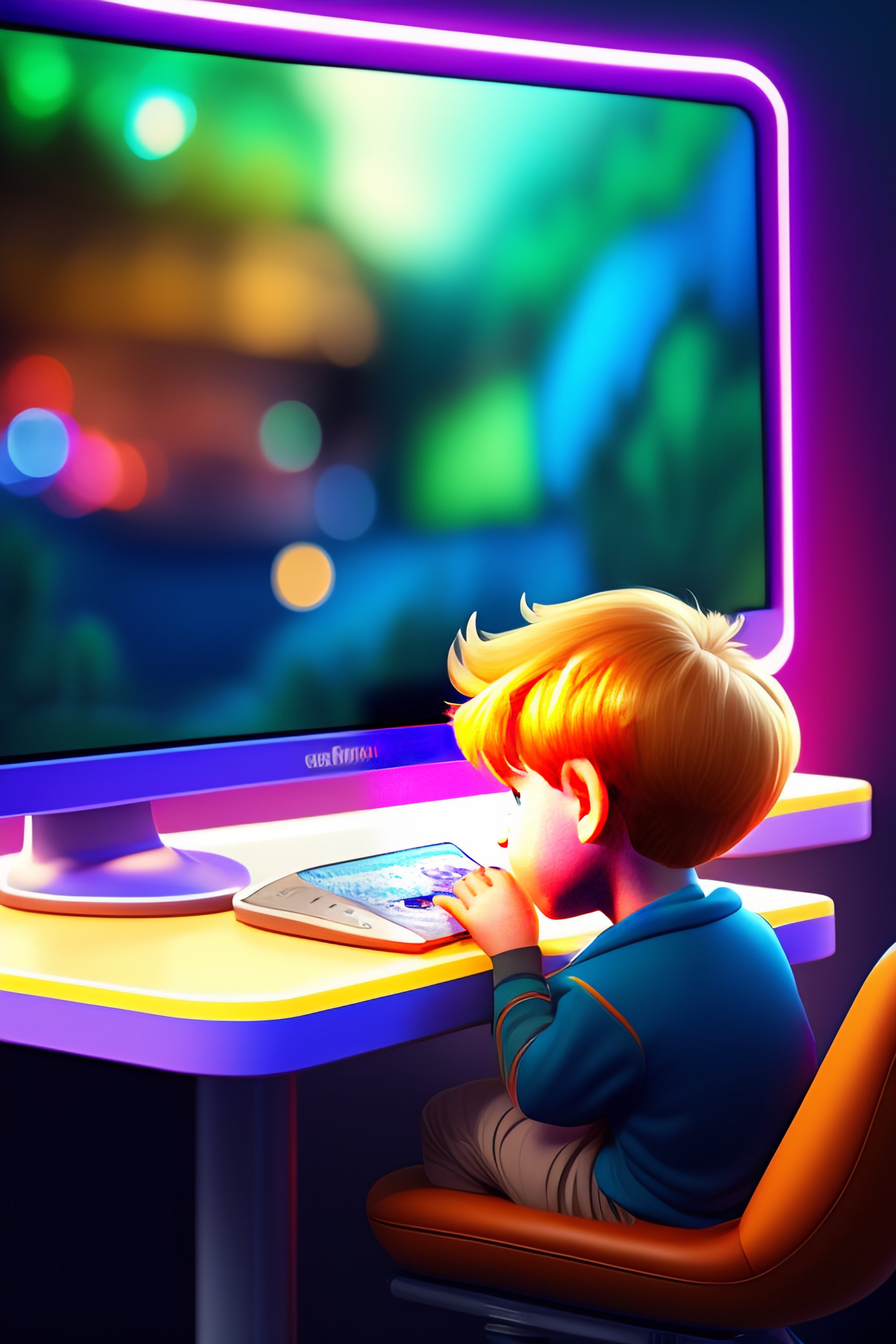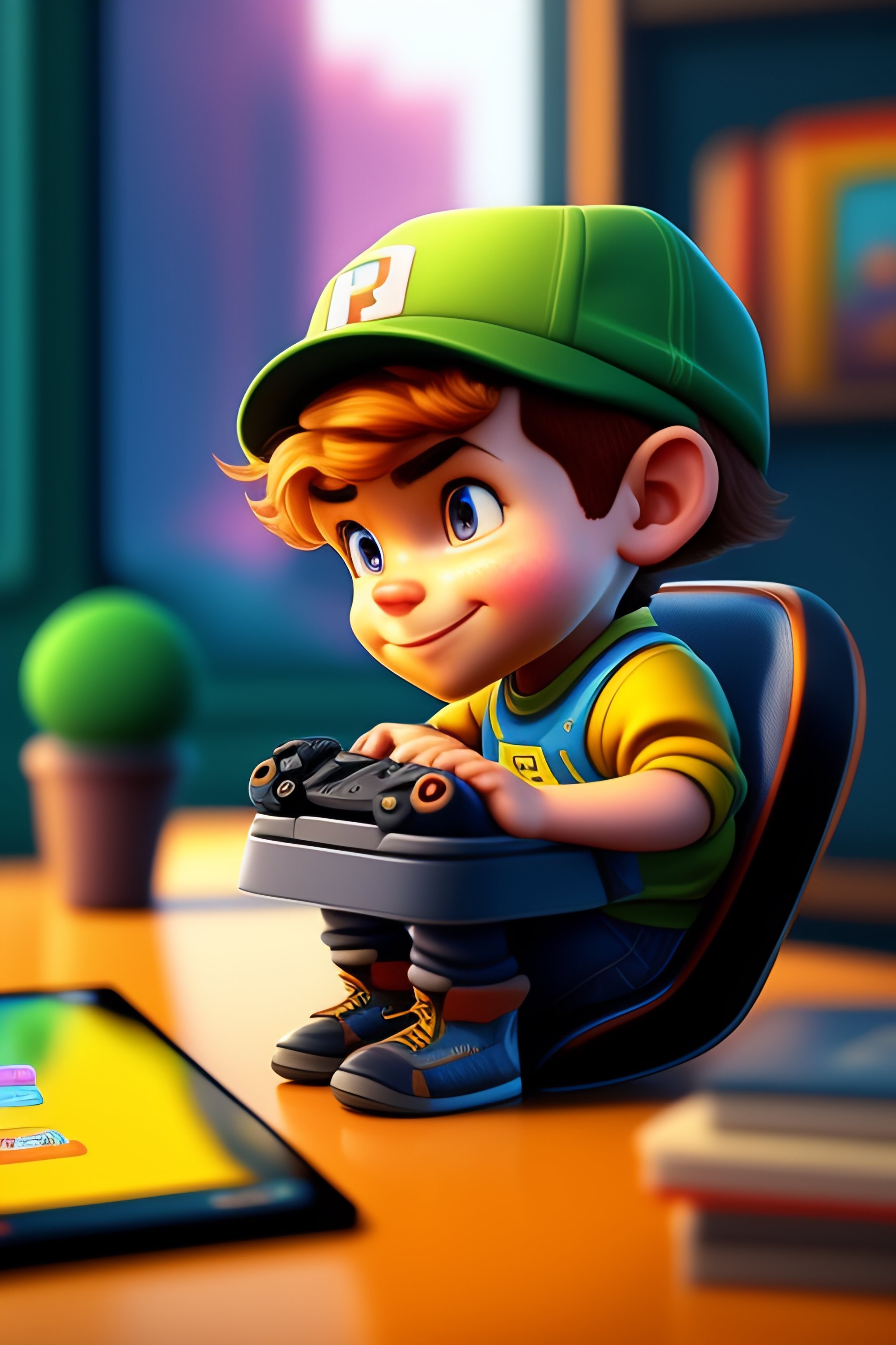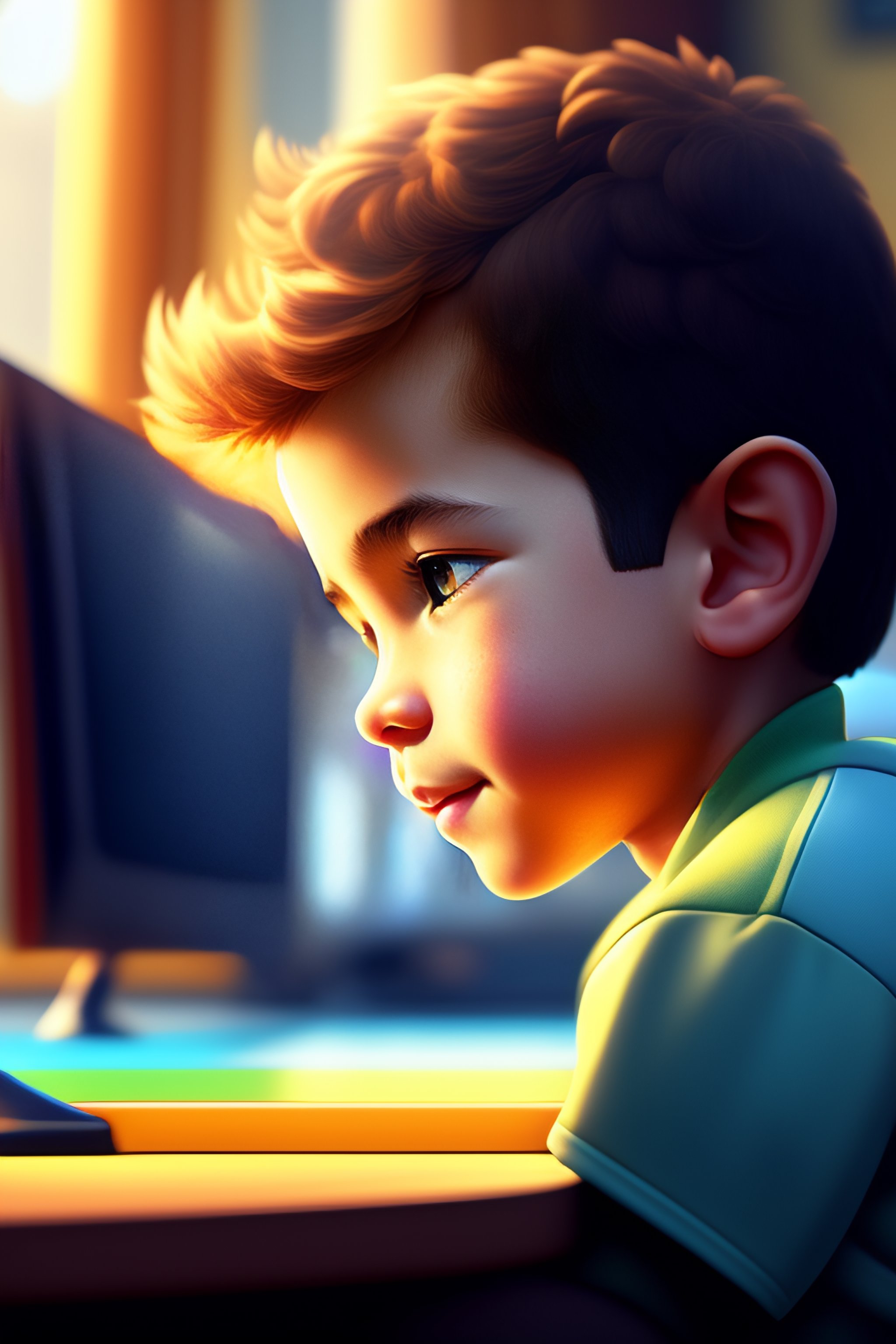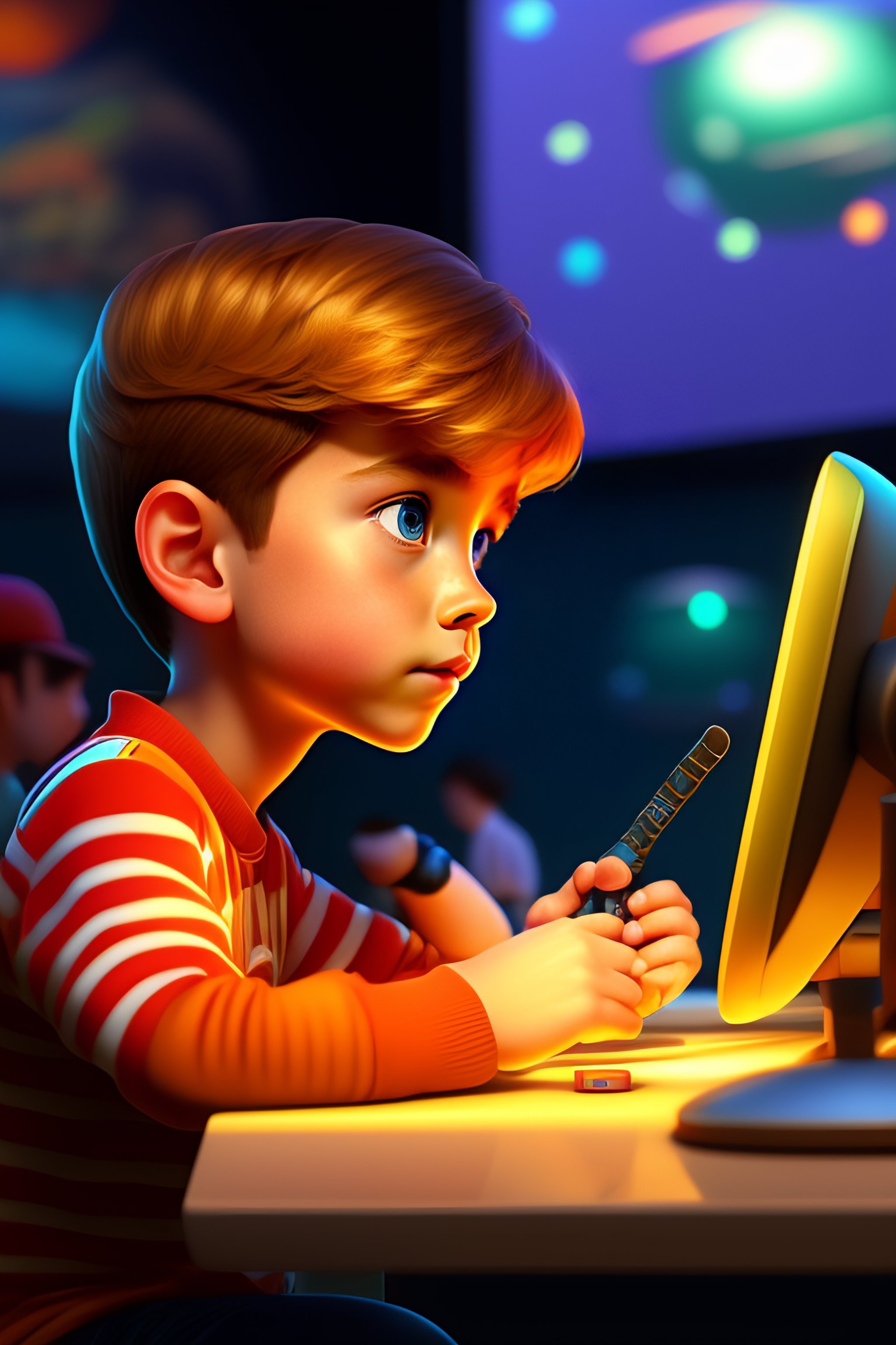 Bright pixar art of a boy playing computer games, sitting at a table where cute game characters come out of the computer screen