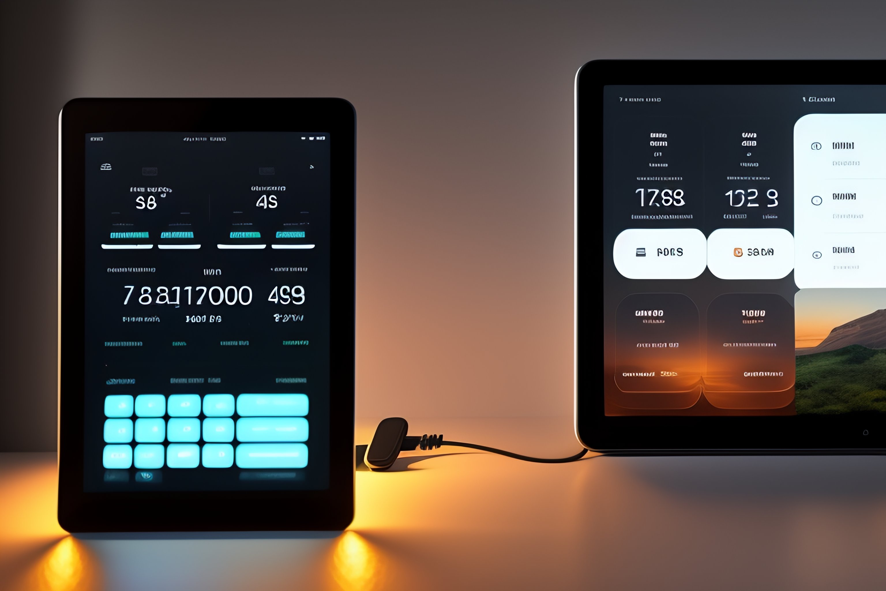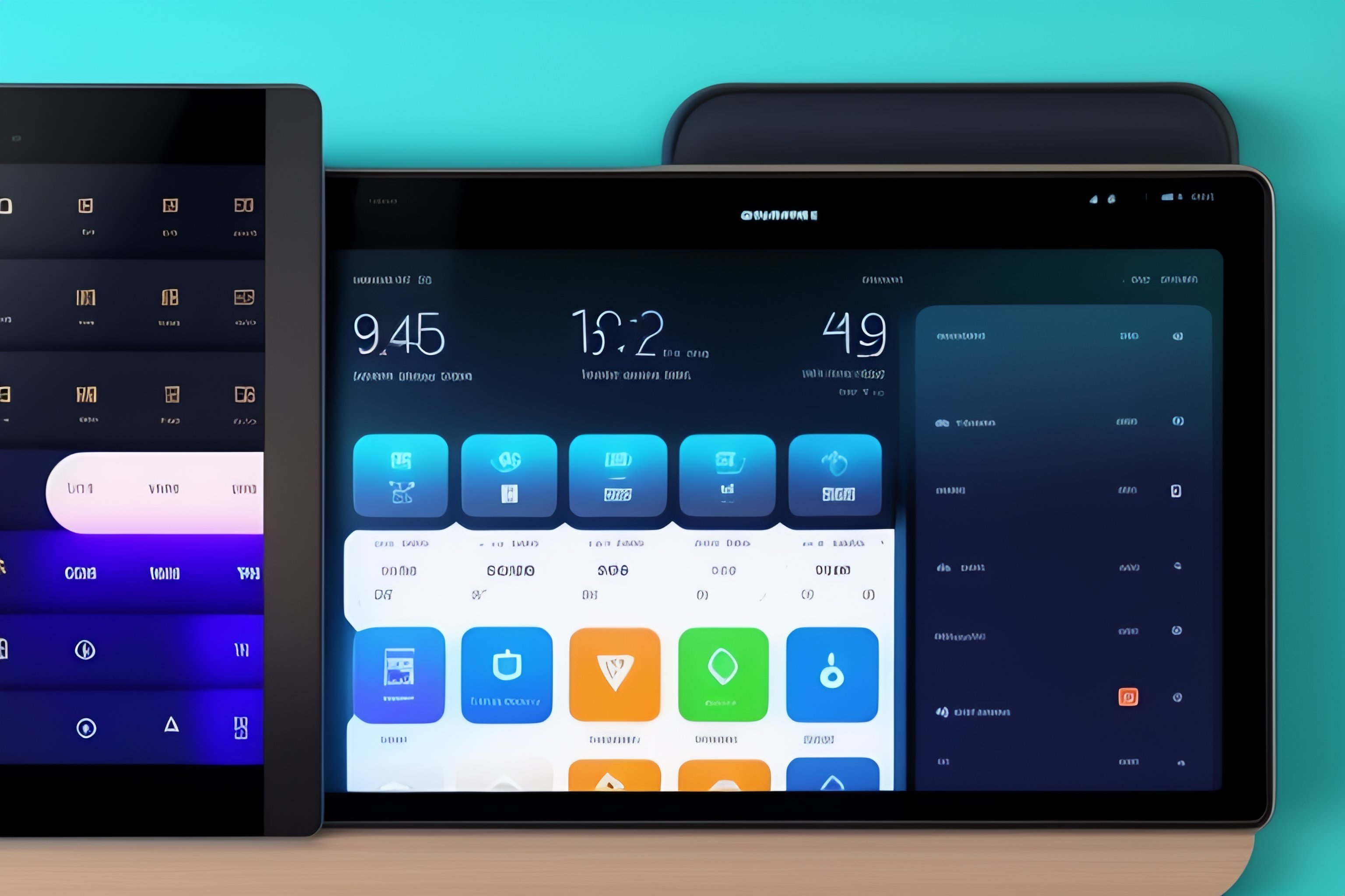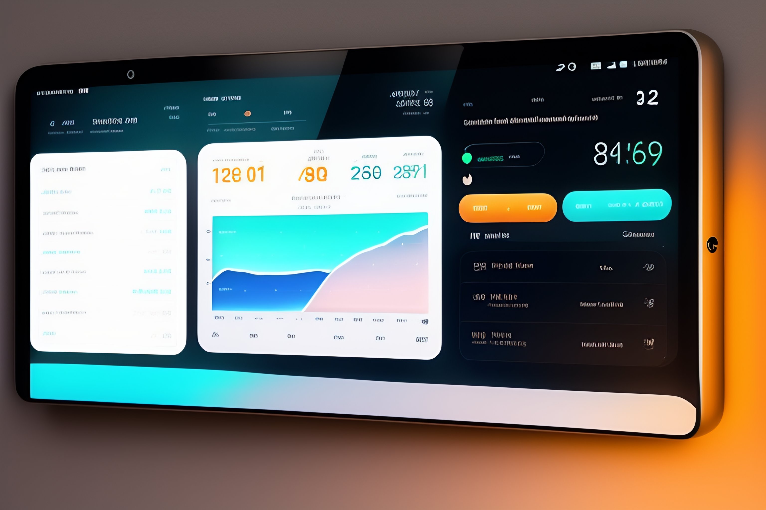 Ui interface for smart home tablet with side column left and right panel with different widgets for media, lights, doorlock, and some stats with graphs