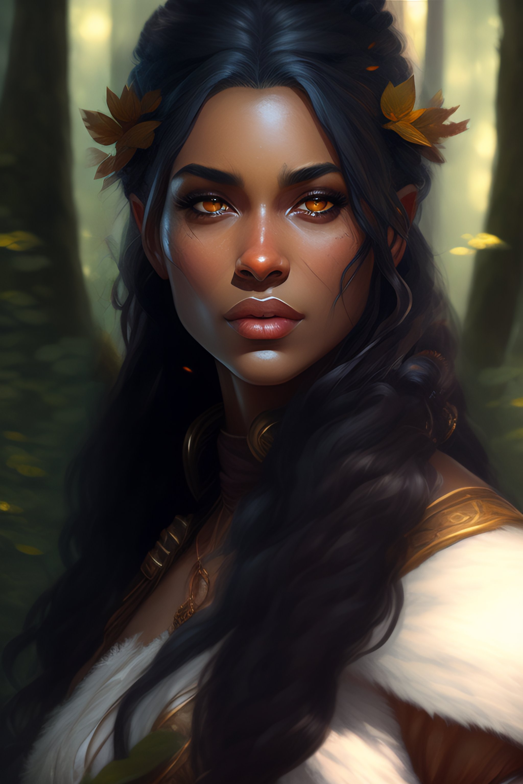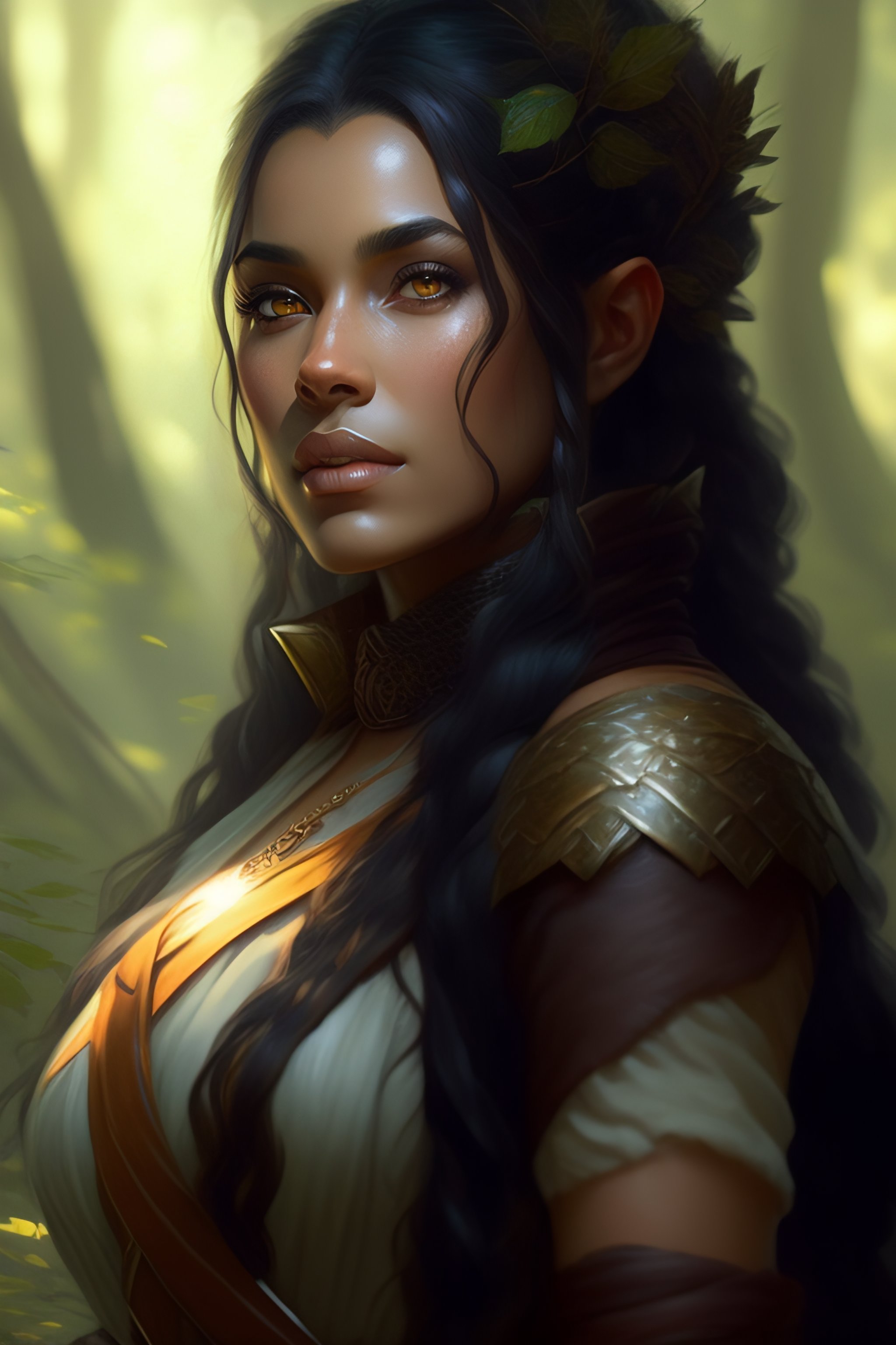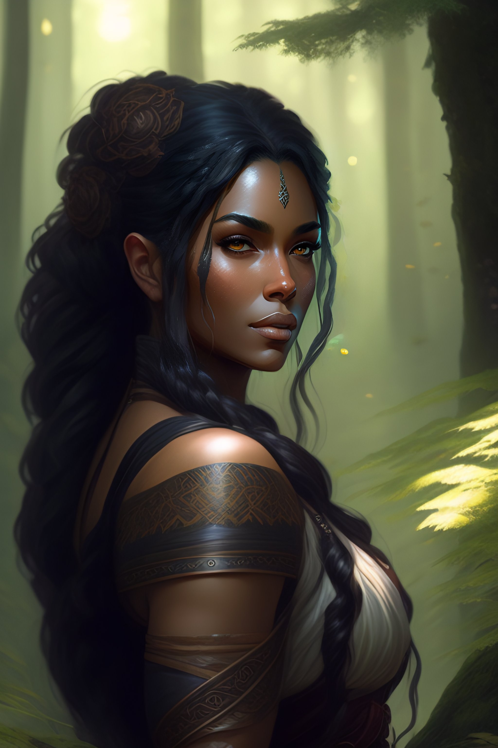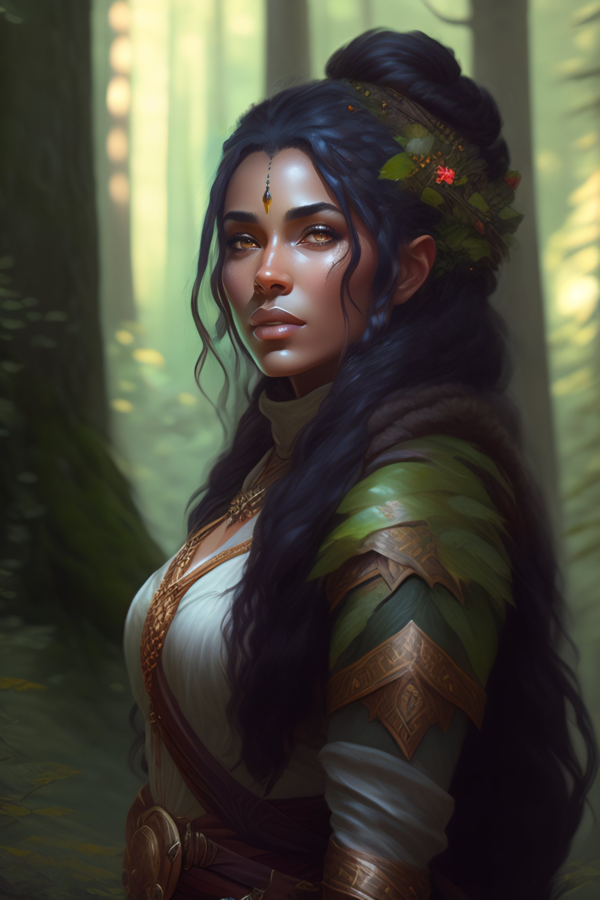 A female dwarf, druid, dark gray hair, brown skin, summer forest, realistic, intricat, concept art, by greg rutkowski