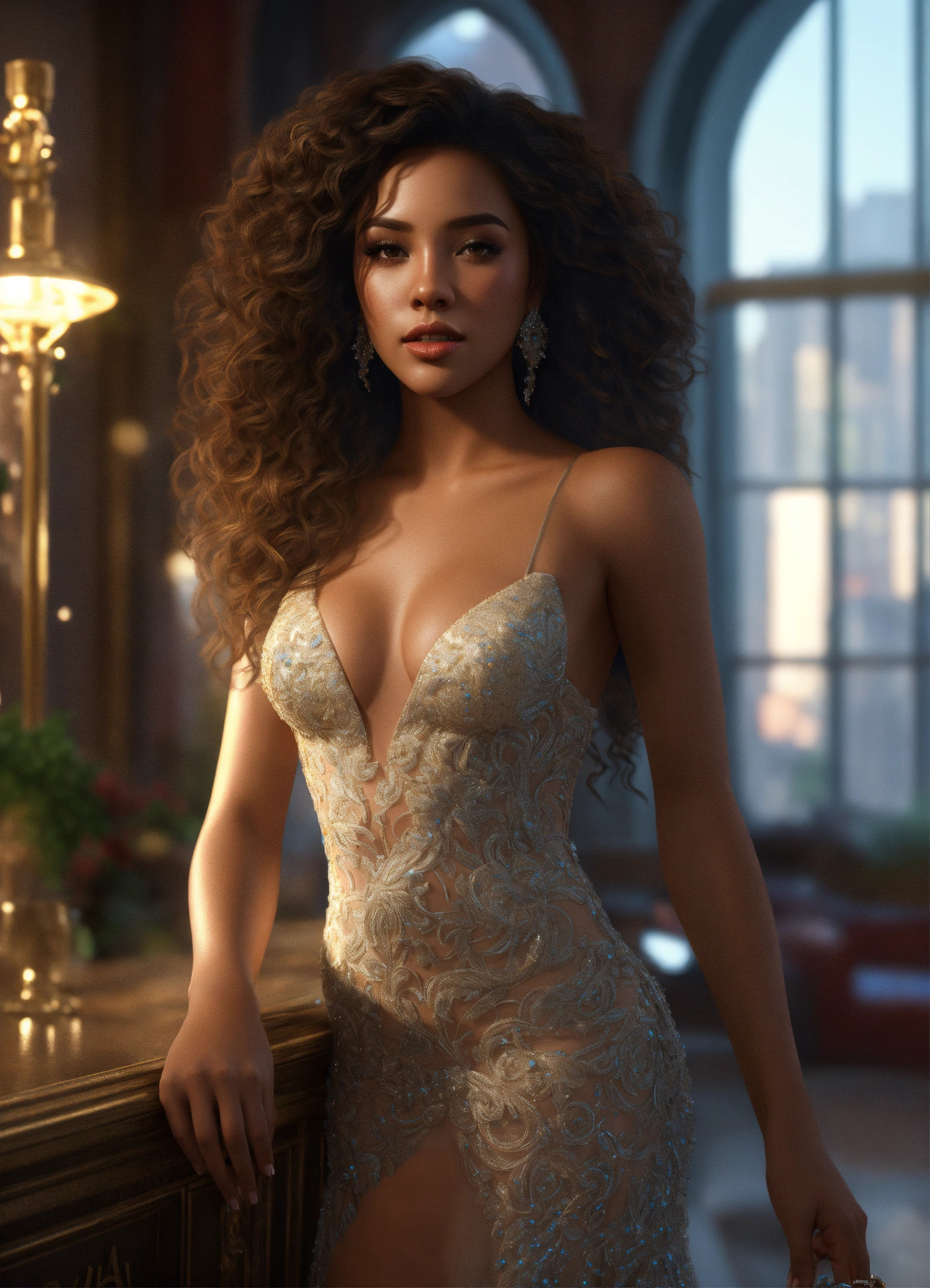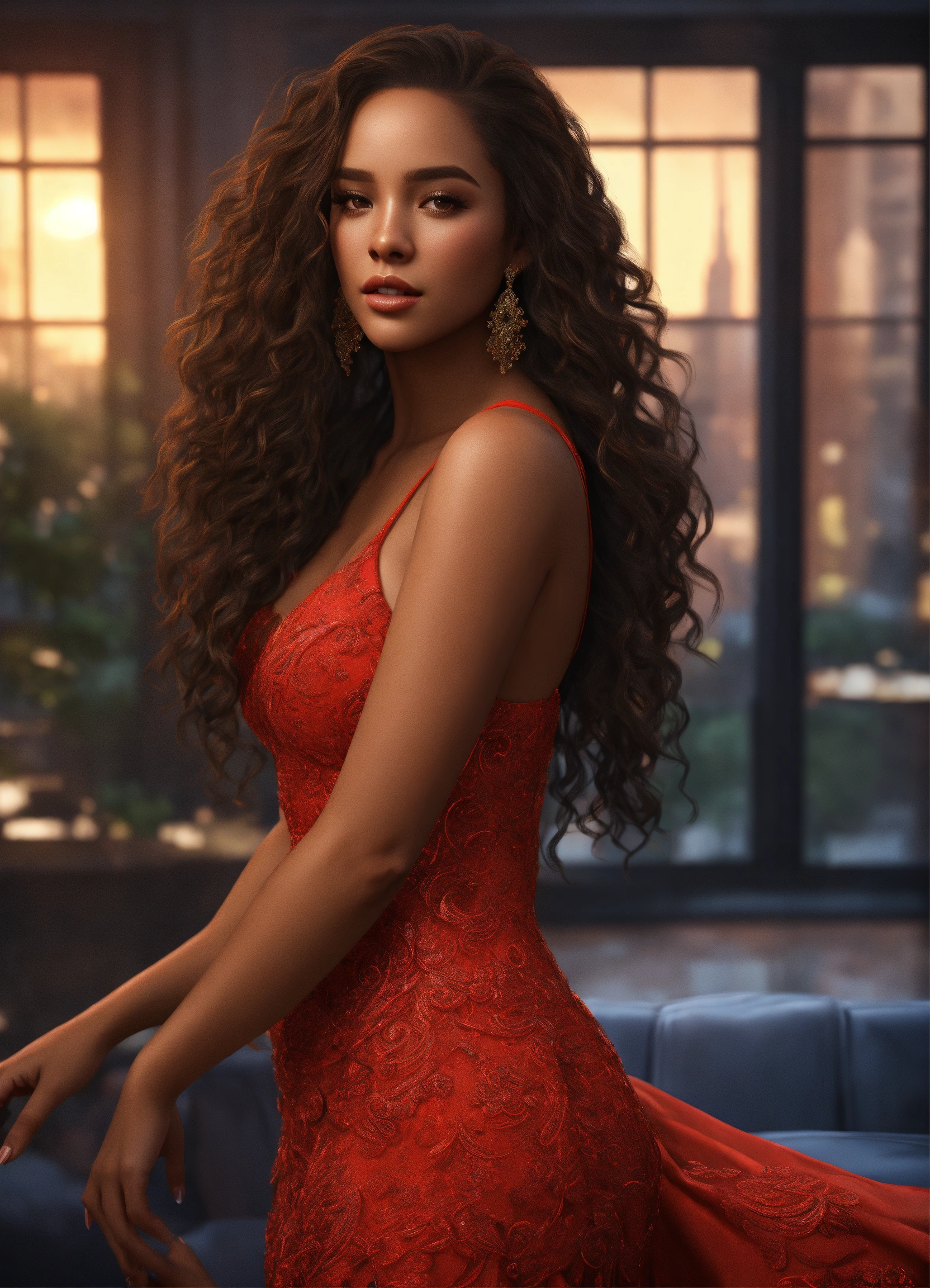 Full body of a beautiful, dominican female, with long curly hair, perfect face and full lips, wearing a prom dress, fully covered, inside a new york city apartment, full body, 8k resolution concept art portrait dynamic lighting hyperdetailed intricately detailed splash art trending on artstation unreal engine 5 volumetric lighting