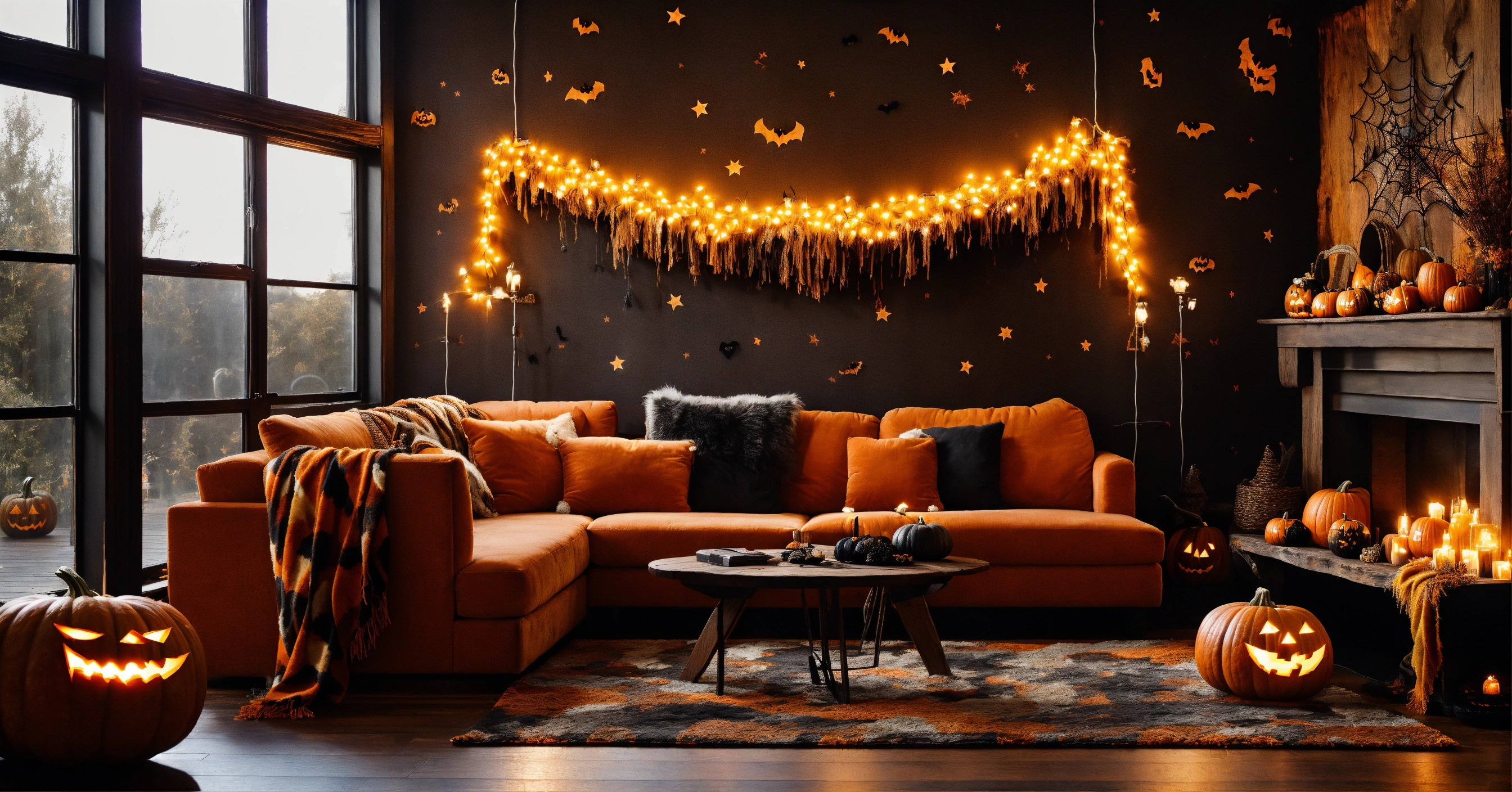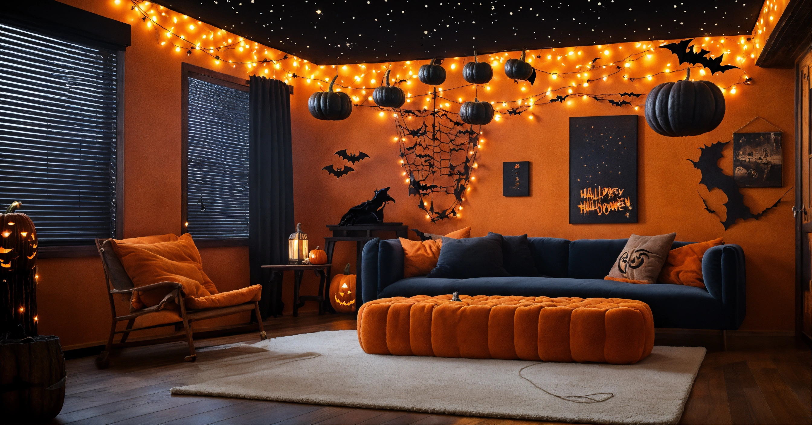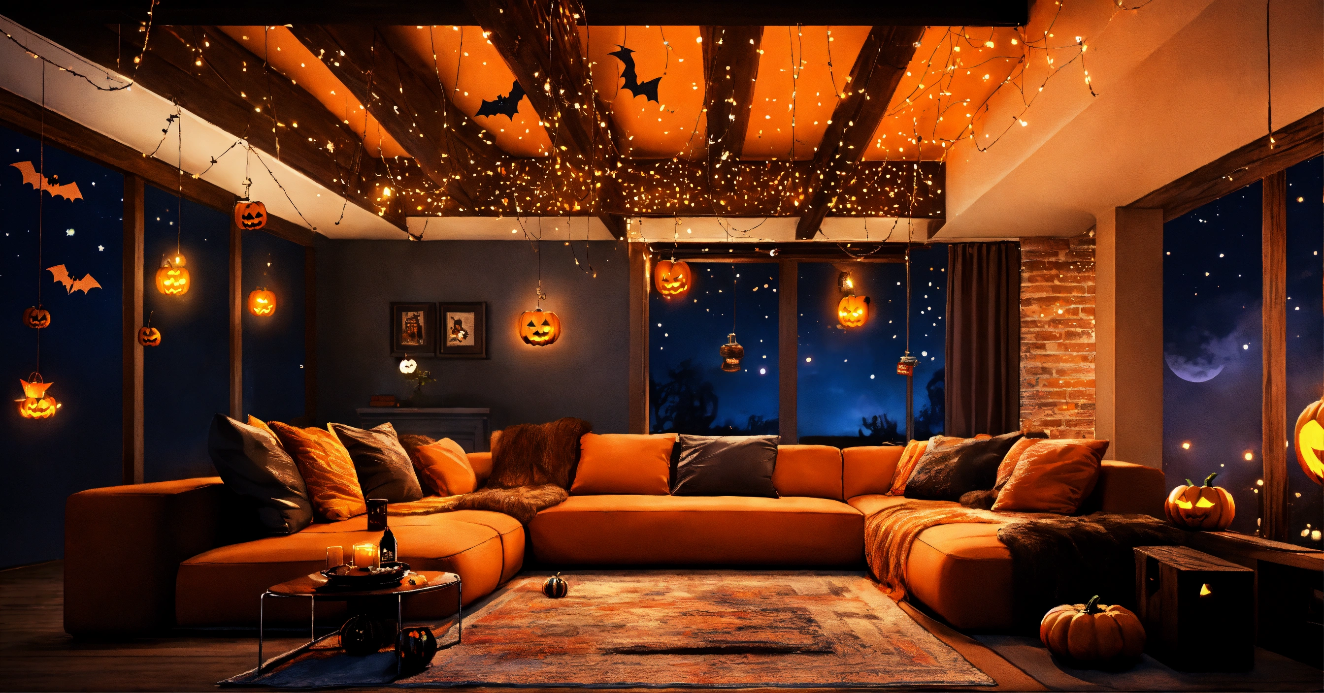 Halloween living room, fluffy orange rug, dark wood beam high ceiling night sky stars, halloween, dark wood, big fluffy couch, dark wood, dark grafitti wall halloween string light