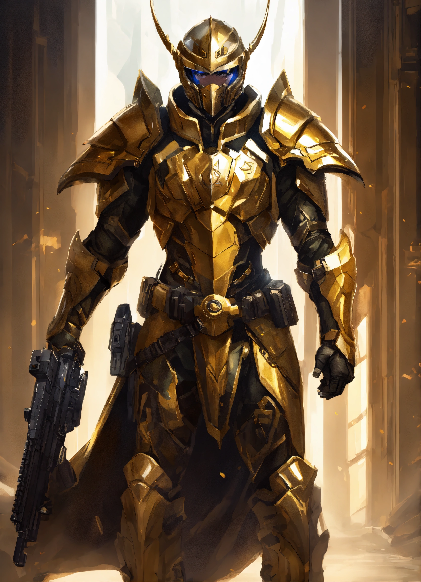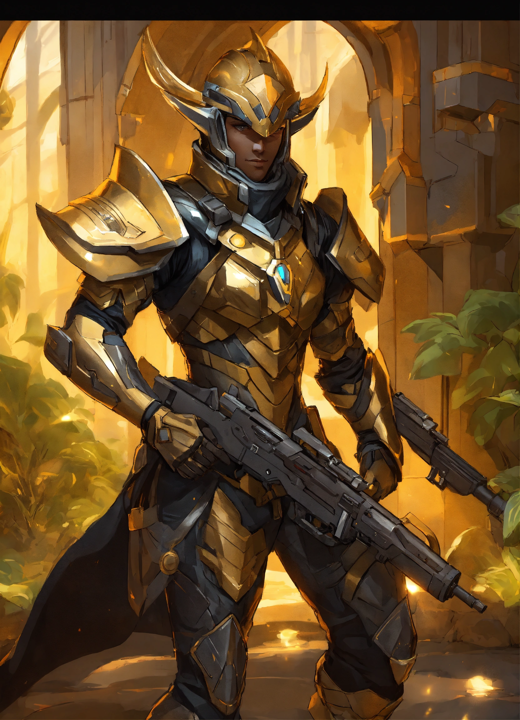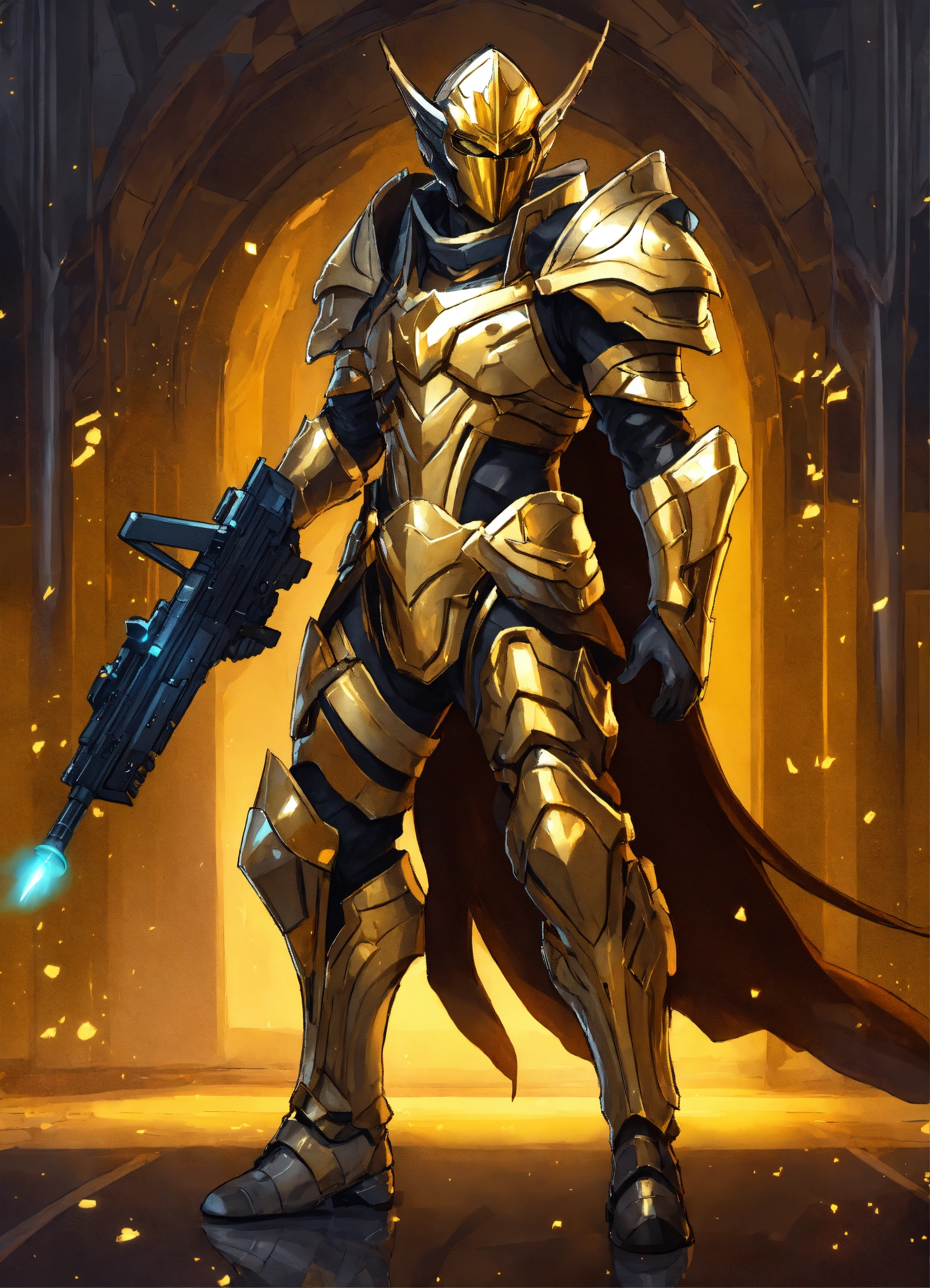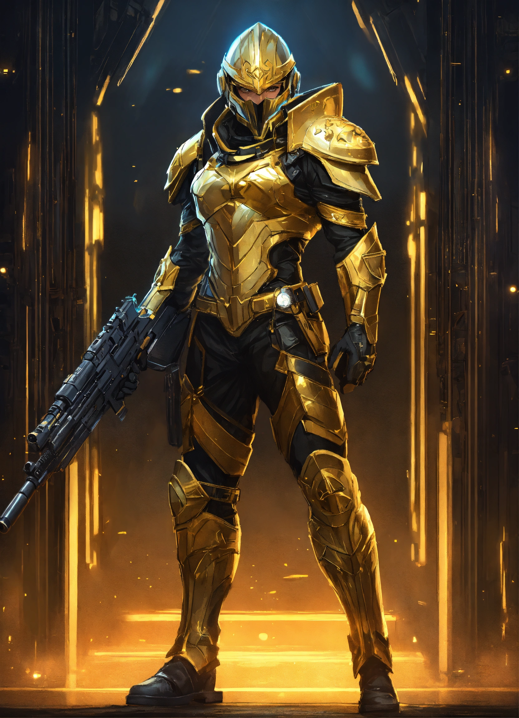 Full body cartoon art of a high elf sci fi soldier wearing heavy sci fi elven armor, black and gold armor and helmet, visor, boots, male, holding a light machine gun, full body, hd