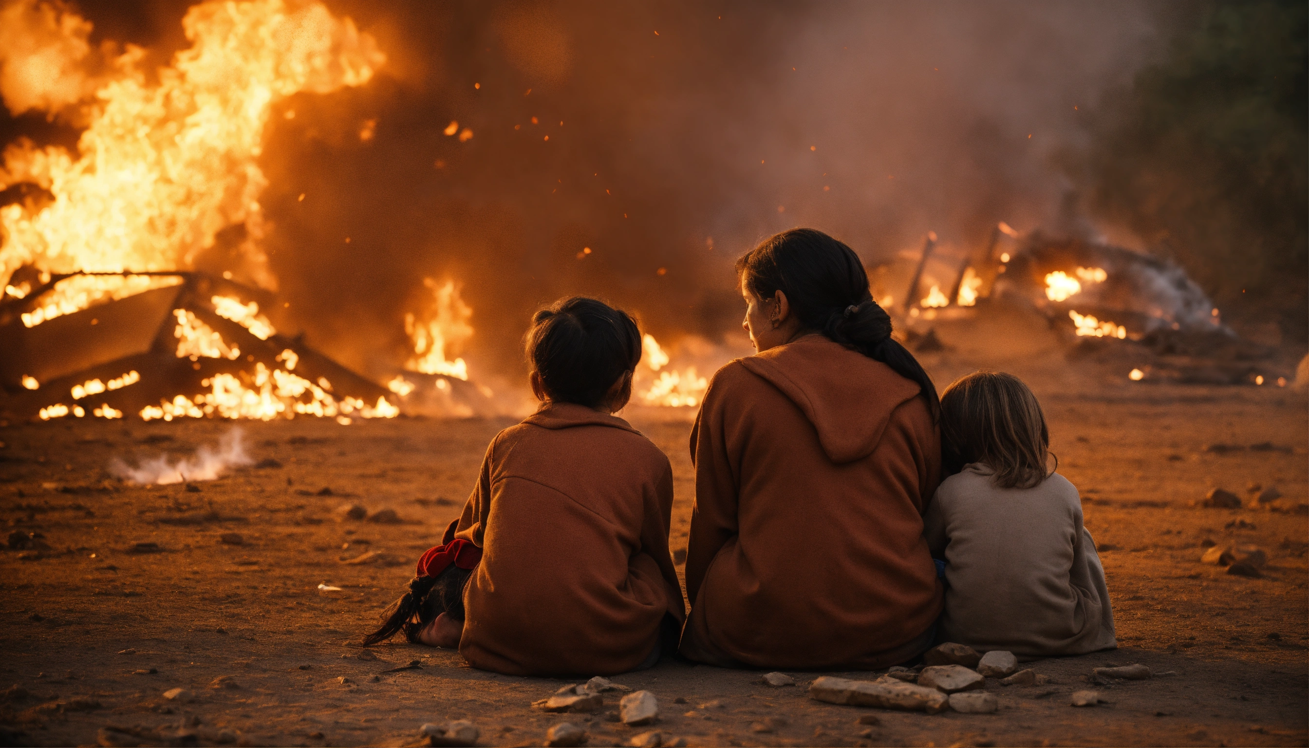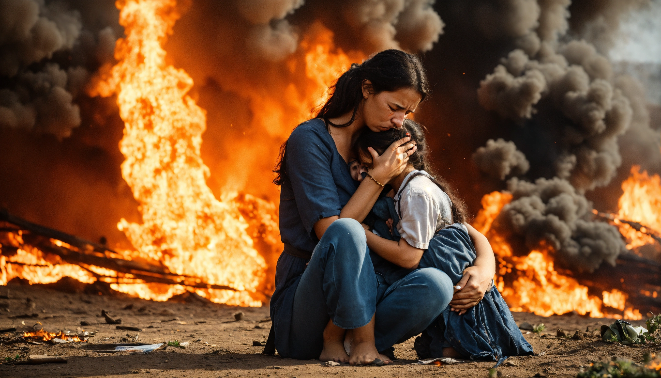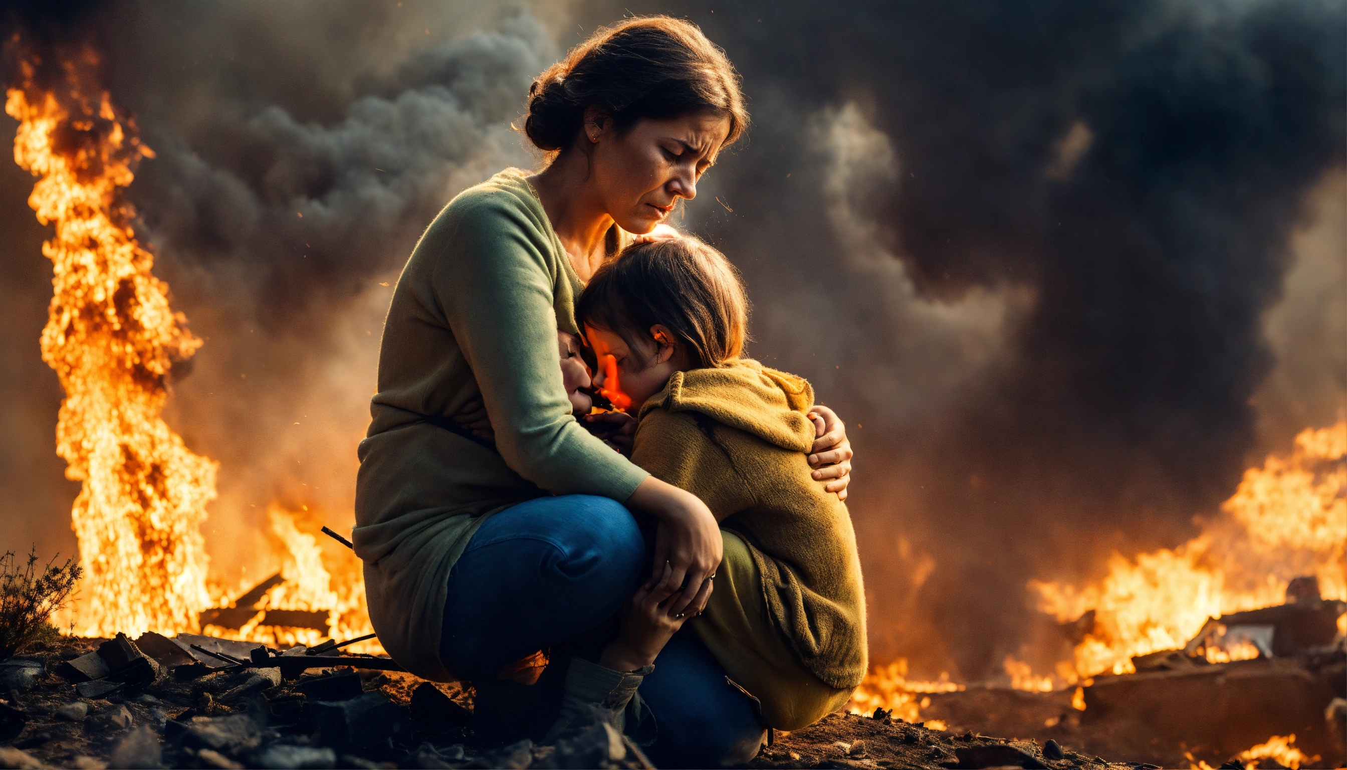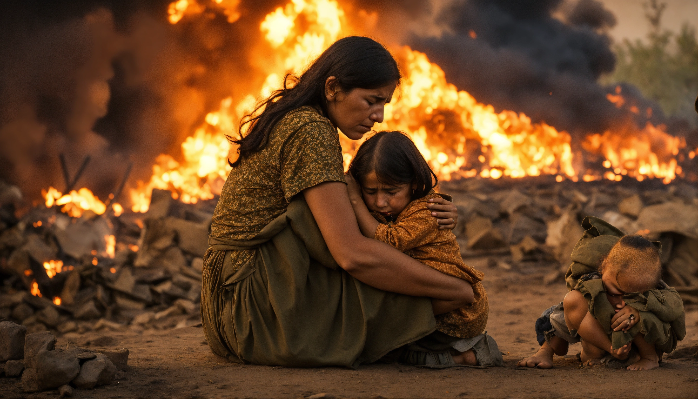 Sad mother with her kids crying in war