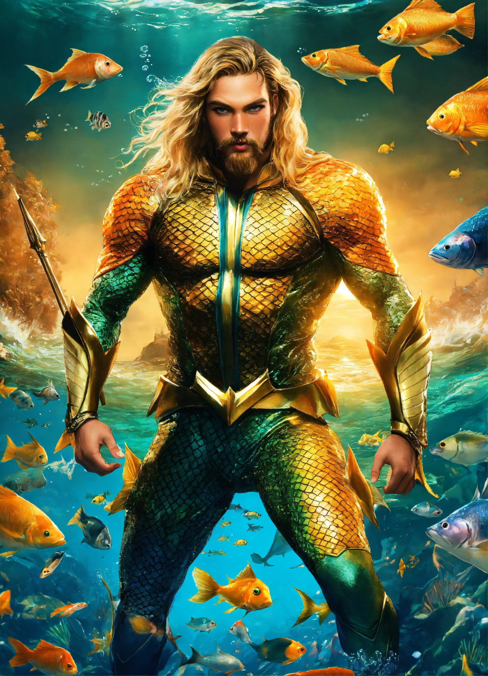 Handsome blond aquaman dc super hero, under ocean water, surrounded by different fishes, aquaman clothes from the justice league cartoon, realistic photo 8k, cover magazine photo
