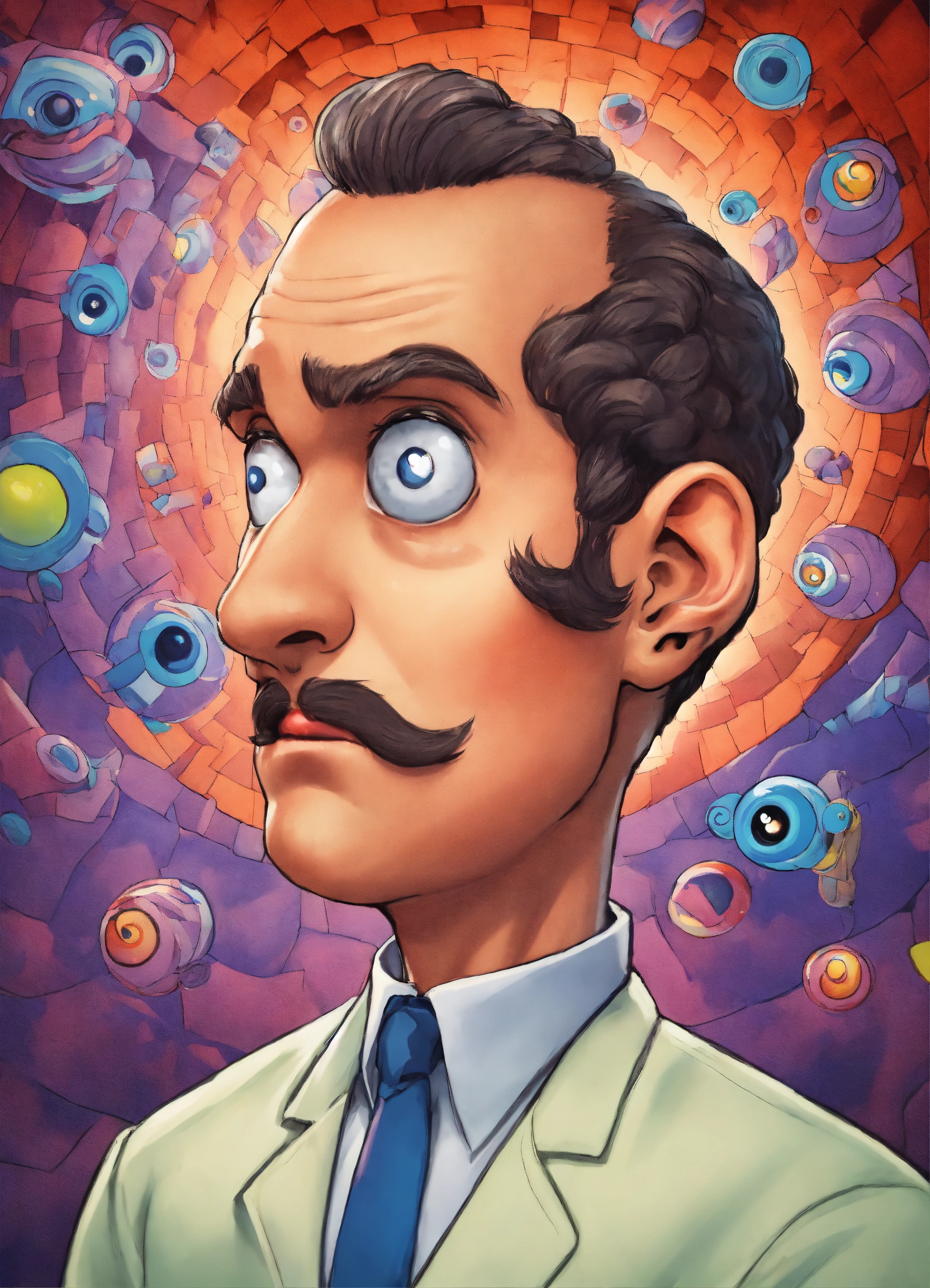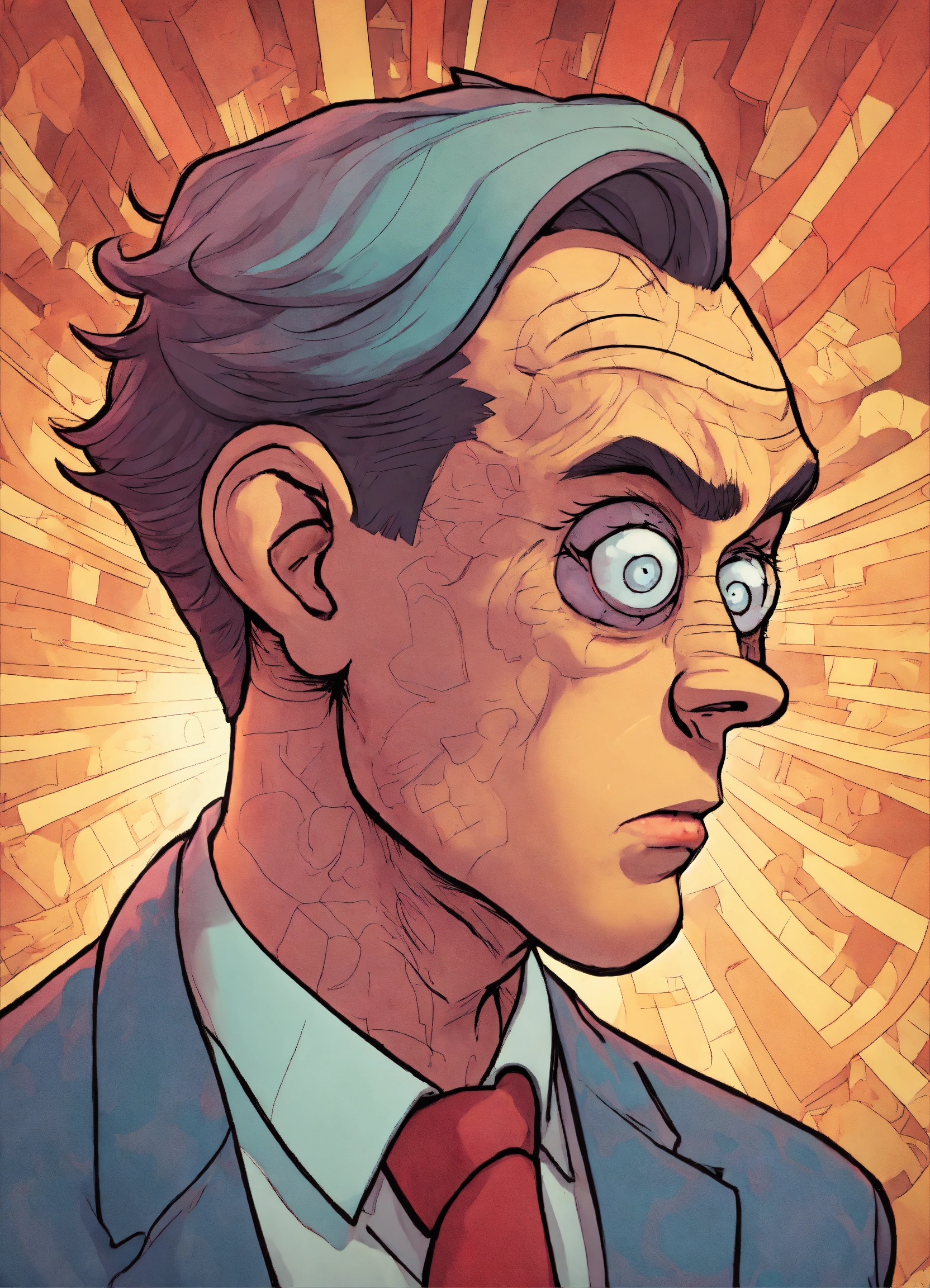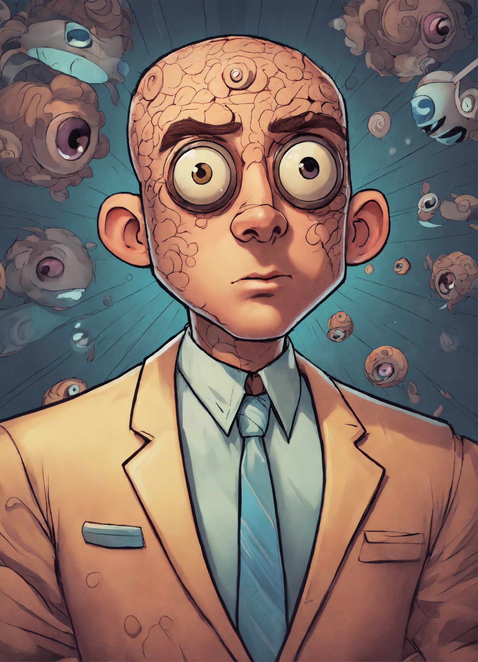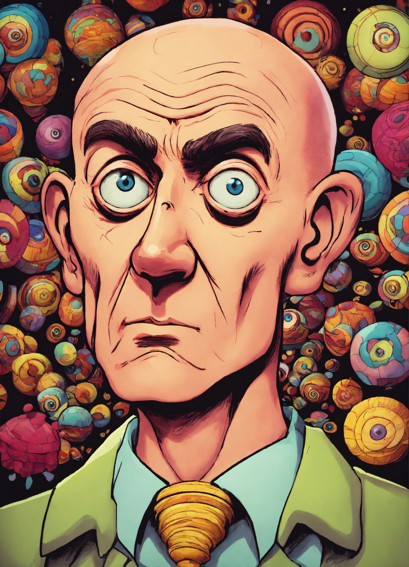 Hypnotized man starring, brainwashed, mind controlled, with over-the-top large cartoon spiral eyes, bite-sized chunk missing from the right side of his head, photo from the neck up, cartoon-styled