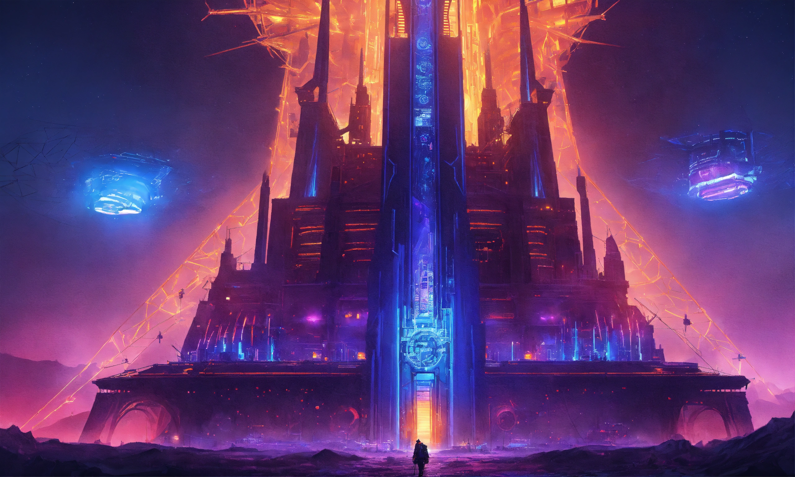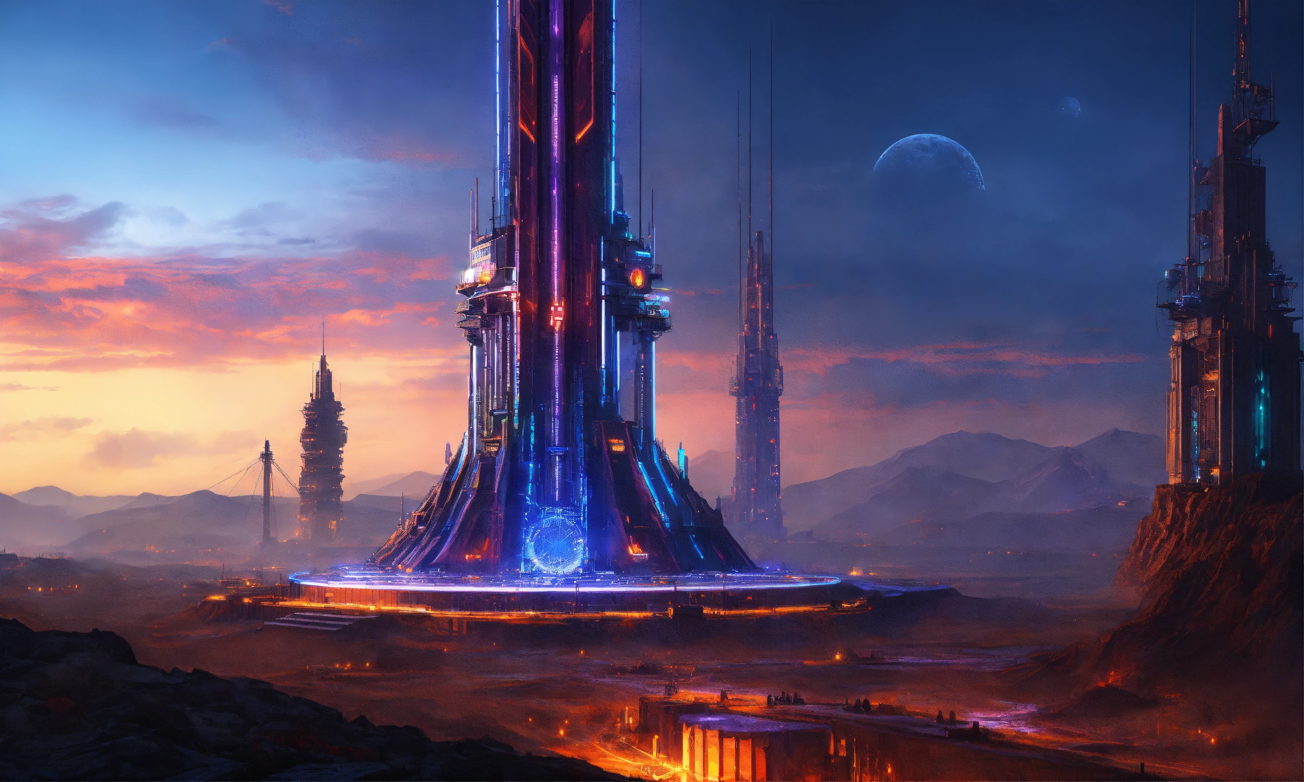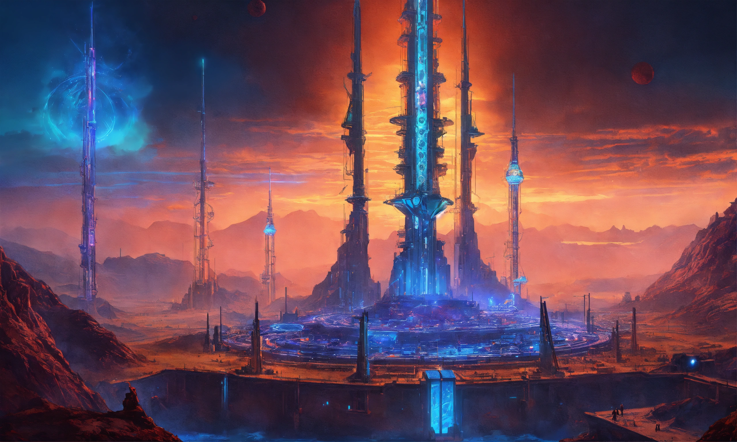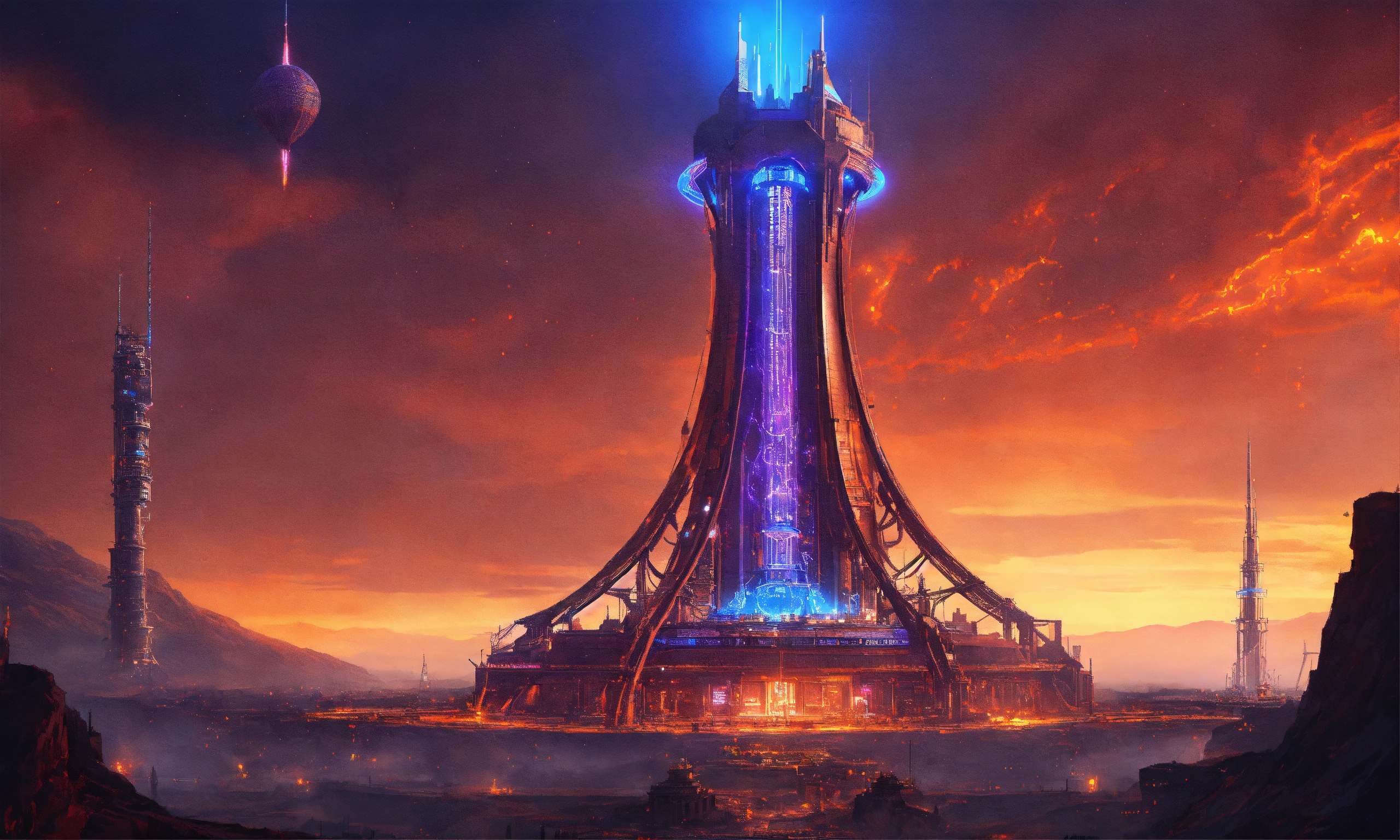 Tall futuristic tower of sauron, temple with coils and circuits going up the structure, powerful blue electricity is striking from sub towers to the top of the evil tower, energy surges, colorful lights, tron style, spider robot are on patrol, secure compound, crystal circuitry, giant speakers on elaborate stands around the tower, in the middle of a wasteland, unreal engine, 8k, vibrant neon illumination up the tower, quantum processors