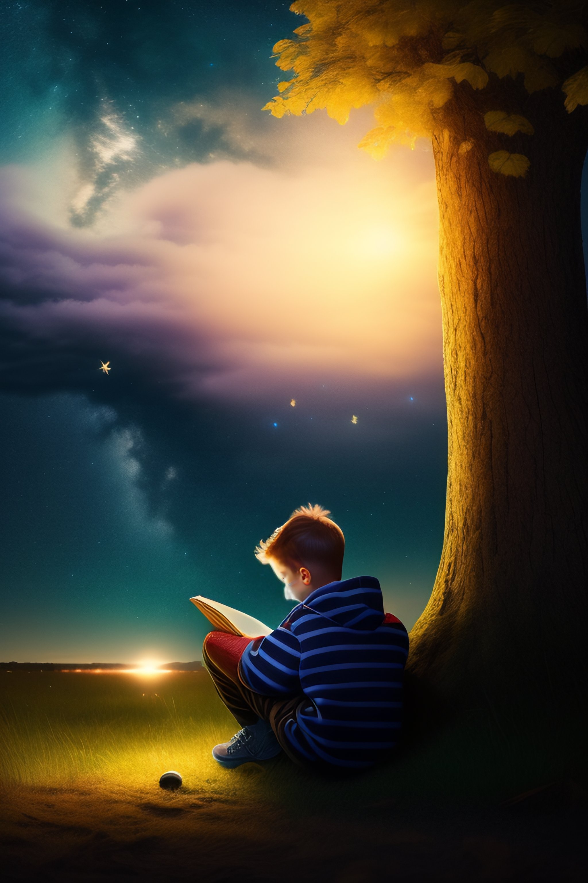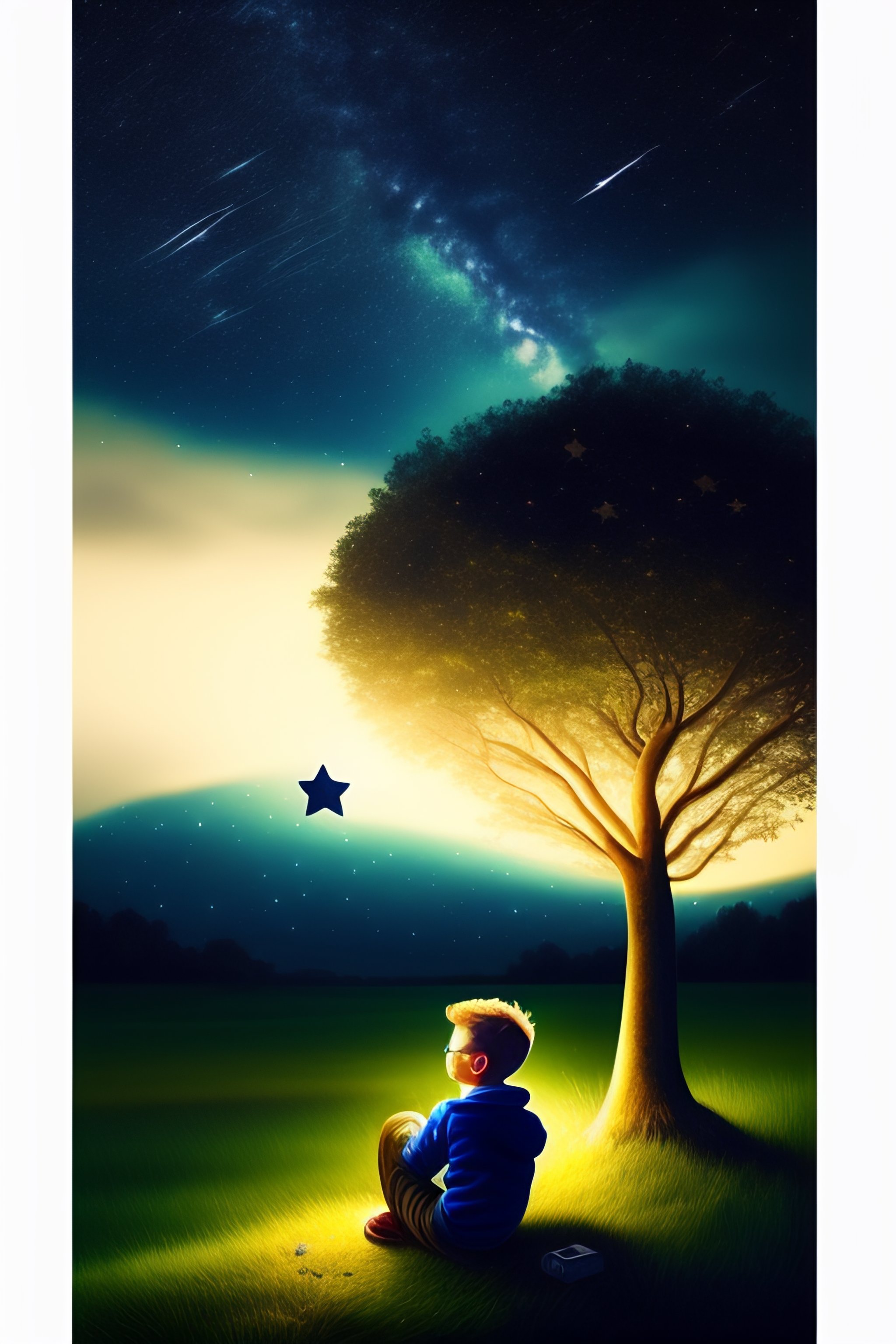 A boy sitting under a tree looking at the sky, with a book in his hand, watching a shooting star go by. it is night