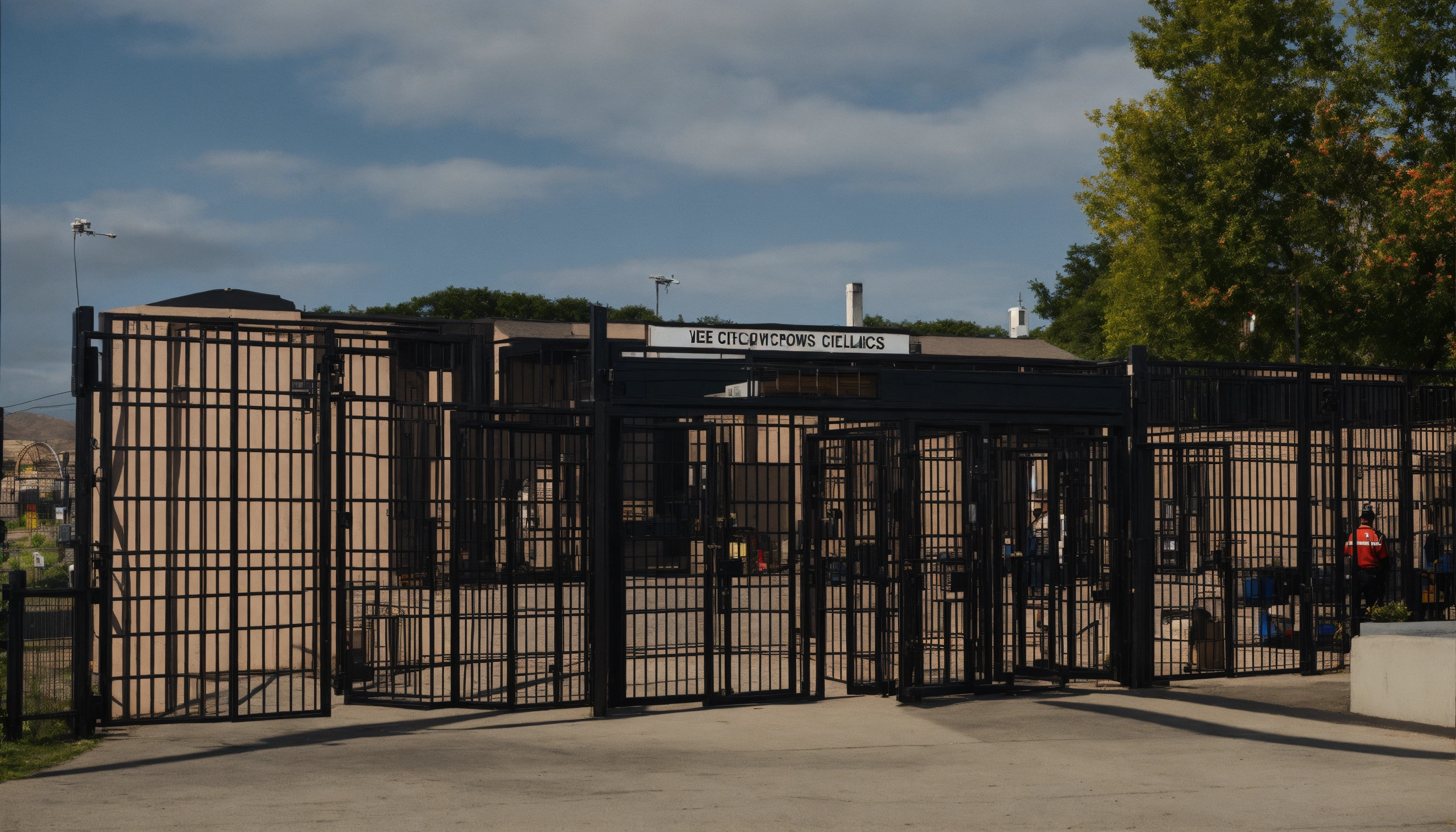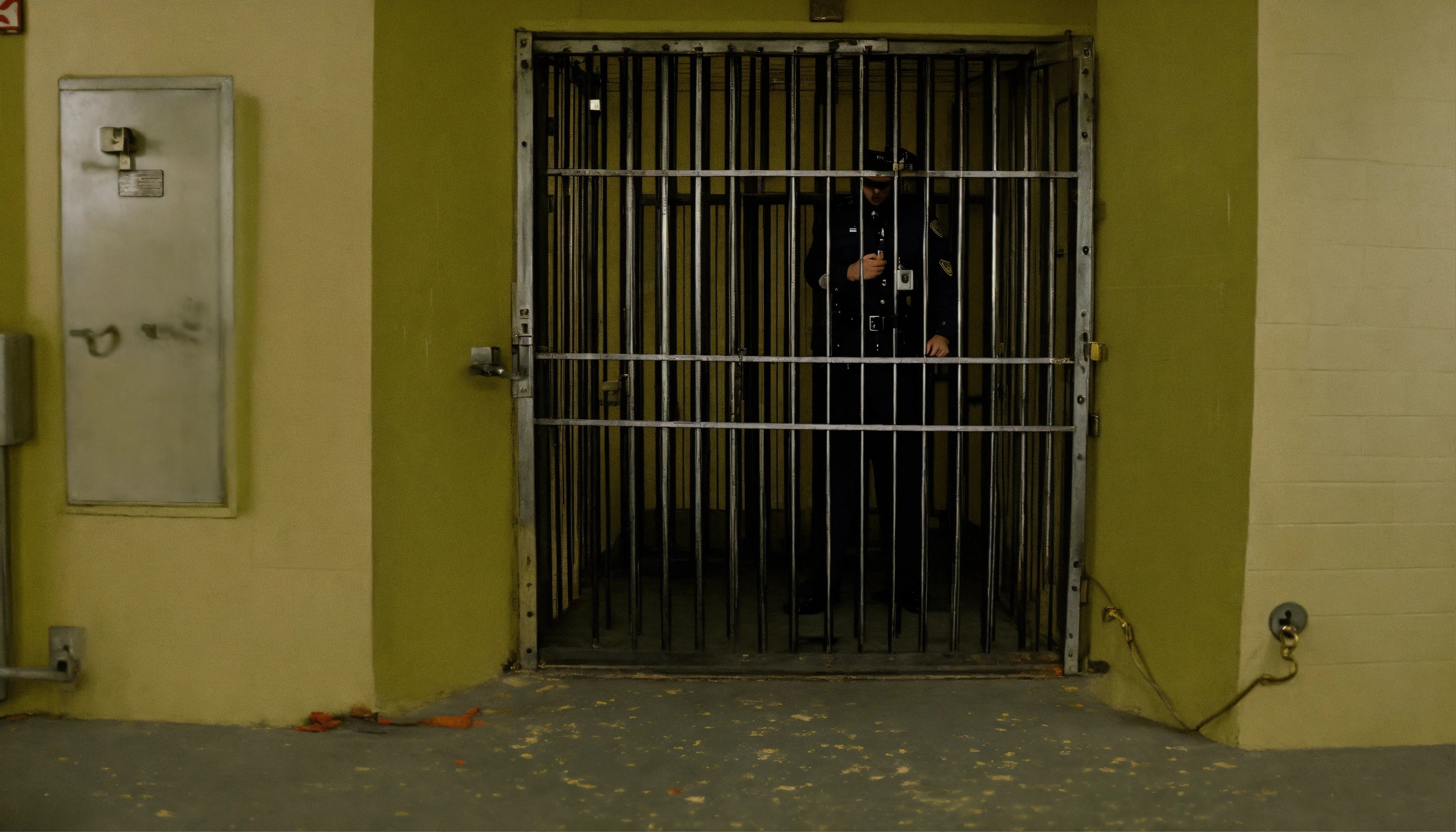 Cage, bars on doors and windows, huge padlocks, male correctional officers, age 25, black leather uniforms