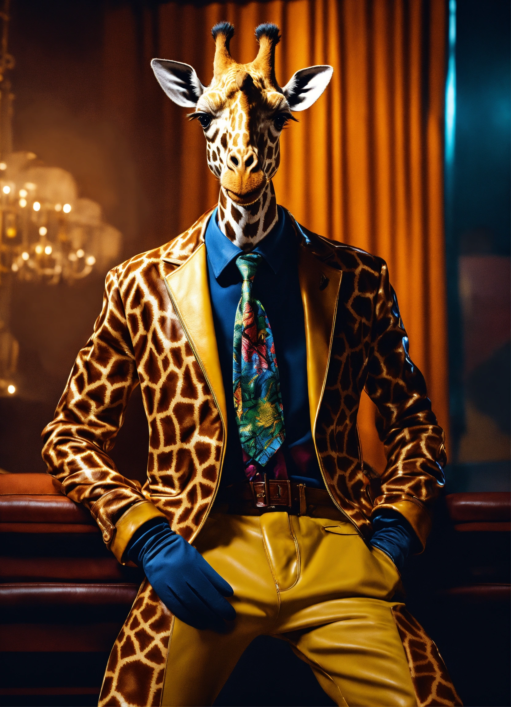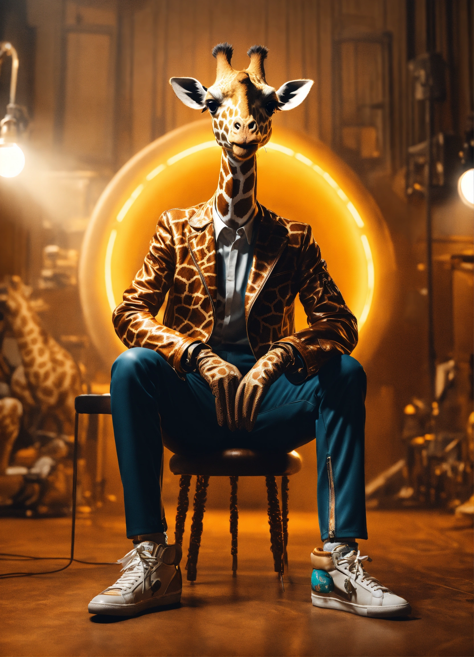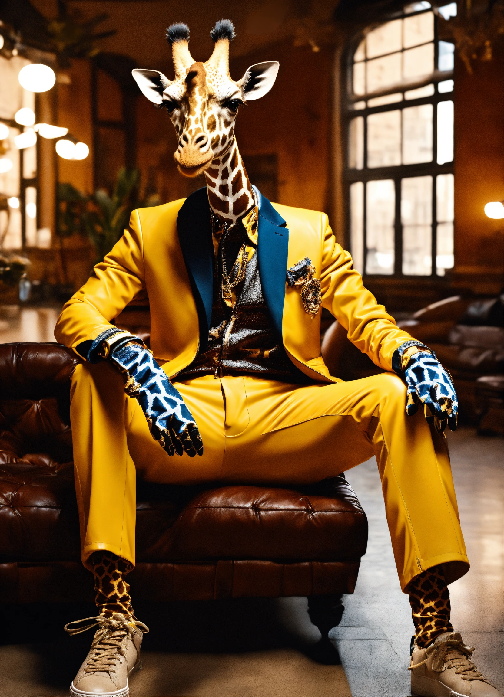An extremely ultra-realistic photo-realistic giraffe rapper sits in a jacket and pants made from his own skin. in sneakers and leather gloves. volumetric lighting, maximalist photo illustration, 8k concept art, intricately detailed, complex, elegant, expansive, fantastical.