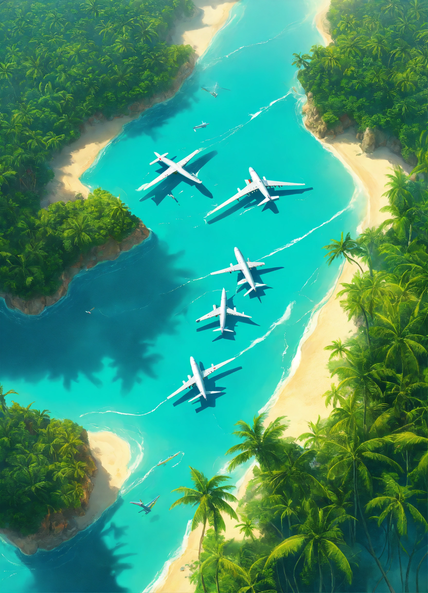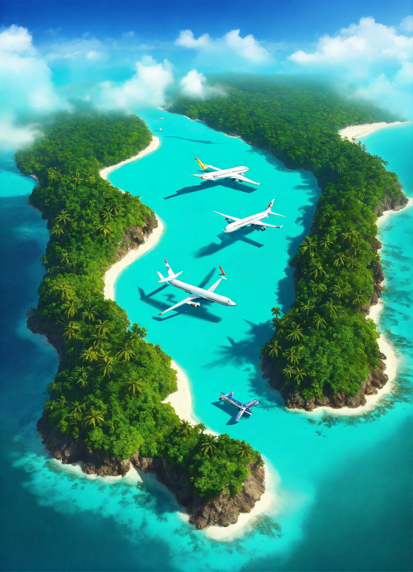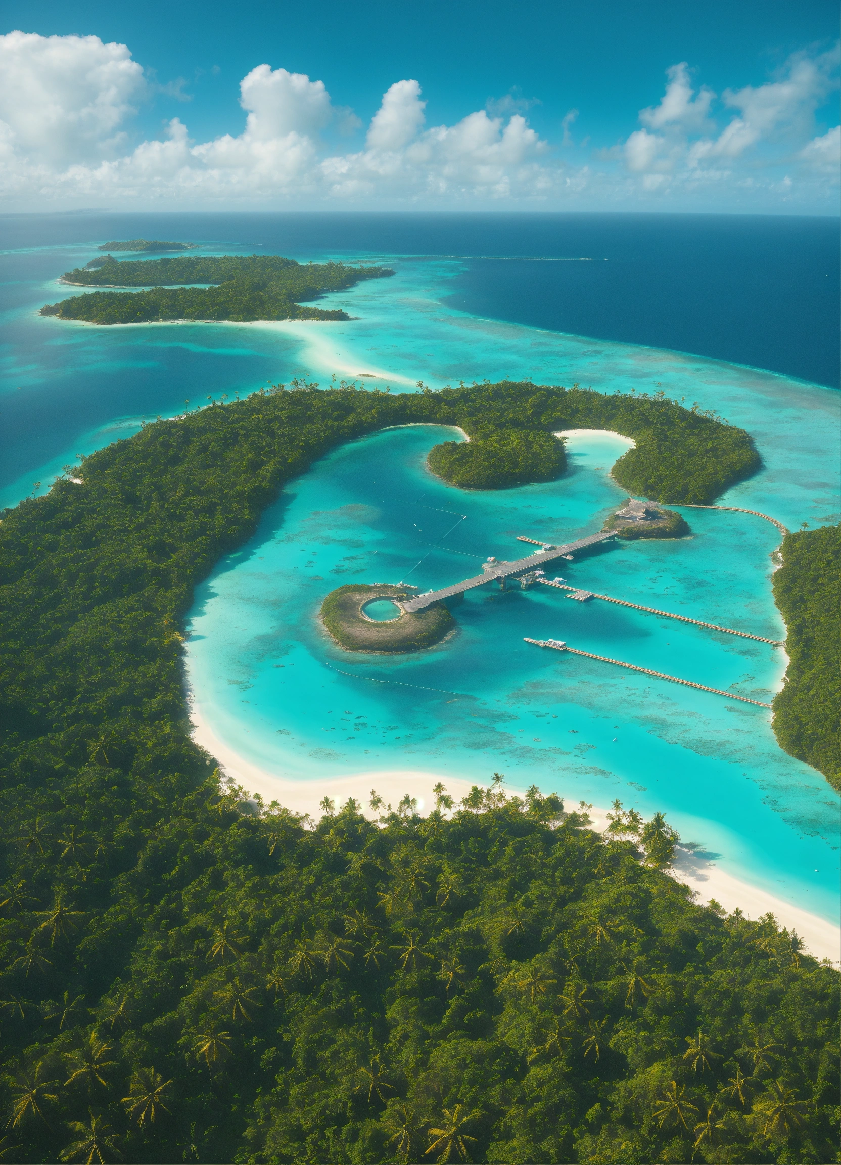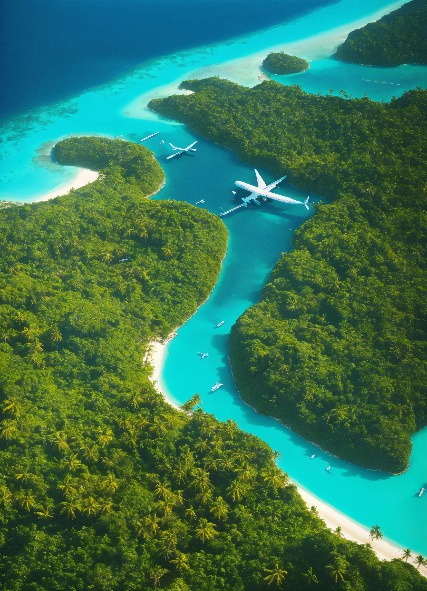 Cybernetic tropical islands that are separated from each other, turquoise sea separating them, airplane view