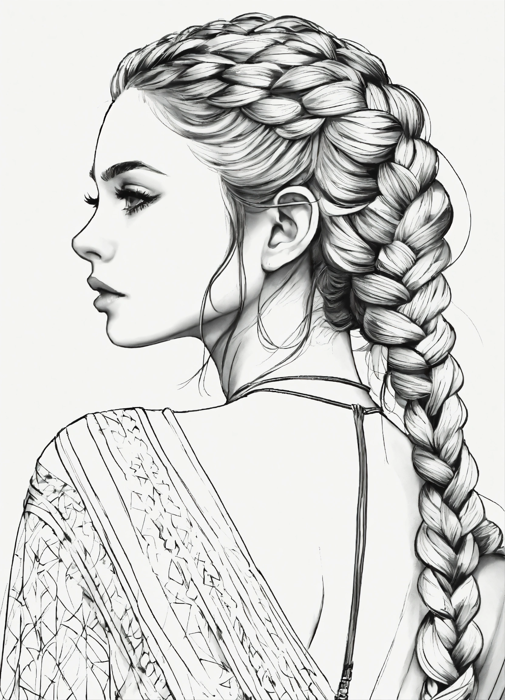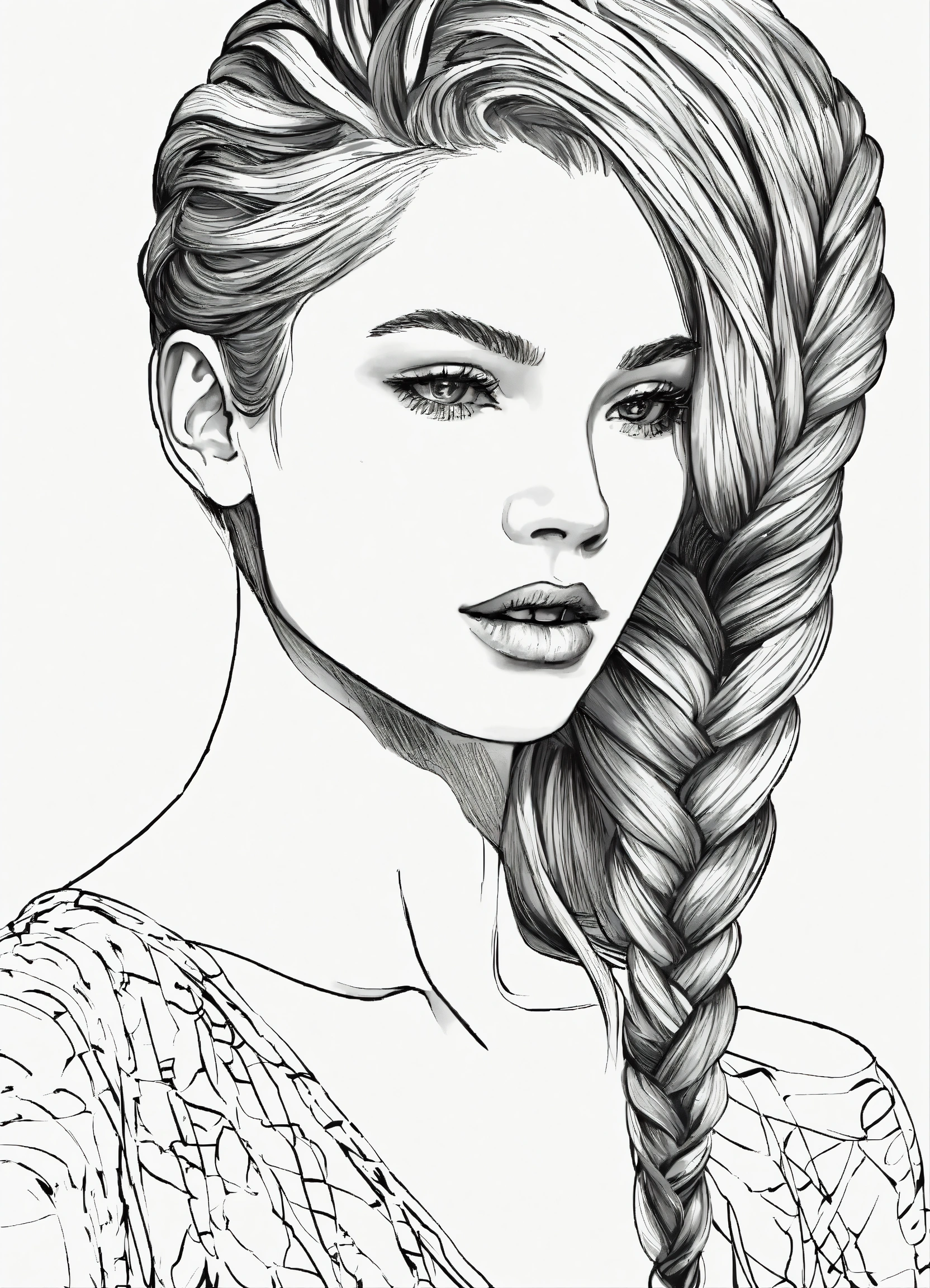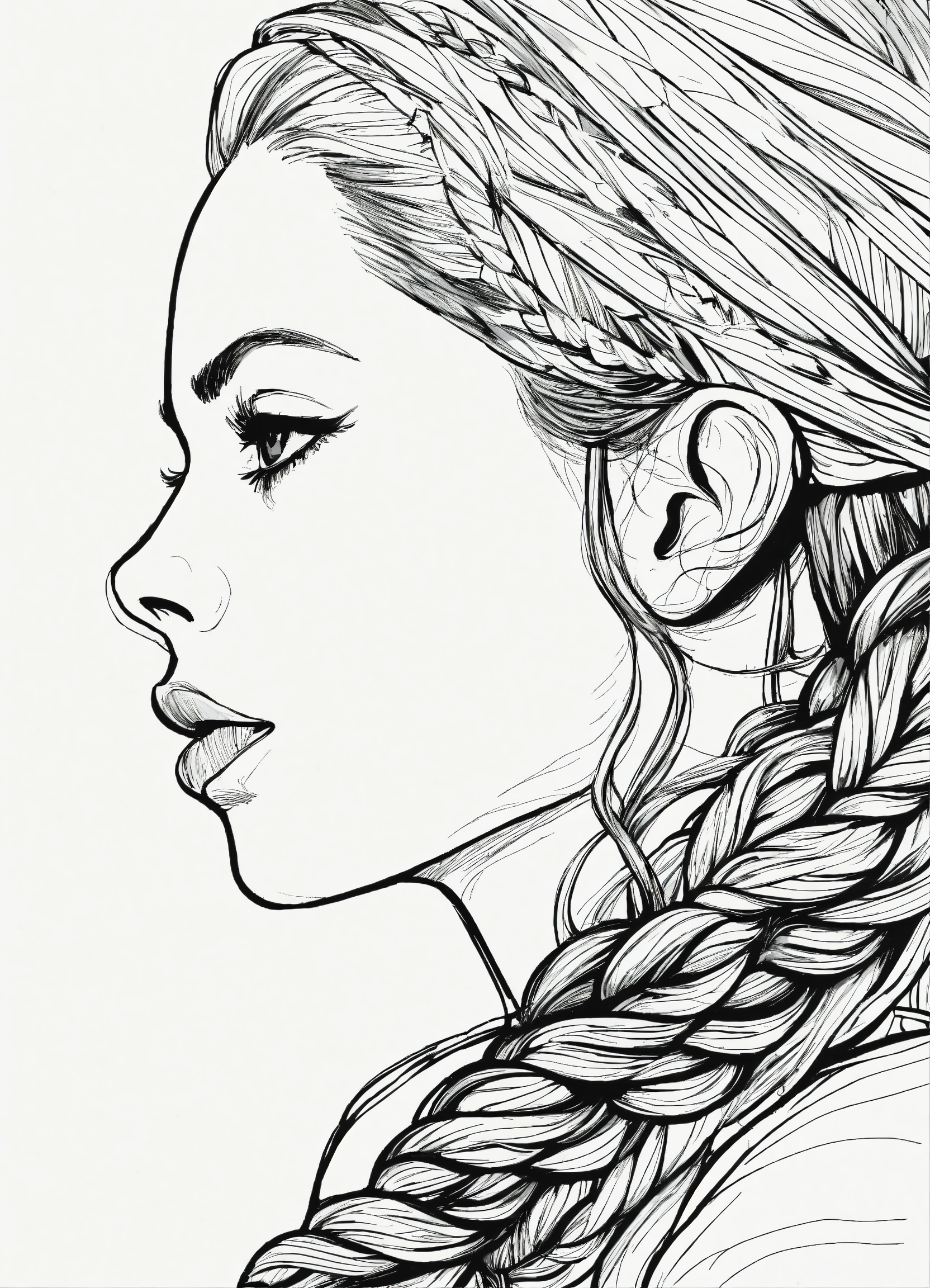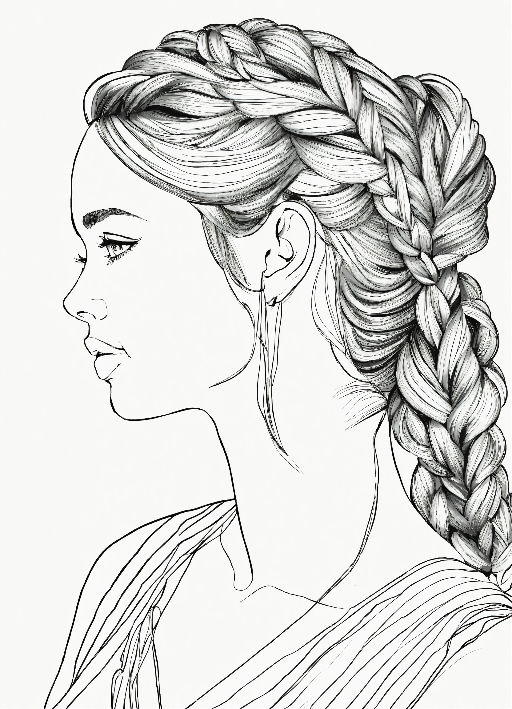 Black and white line drawing, woman, braided hair, upper body, lines, shoulders, white background, clip art
