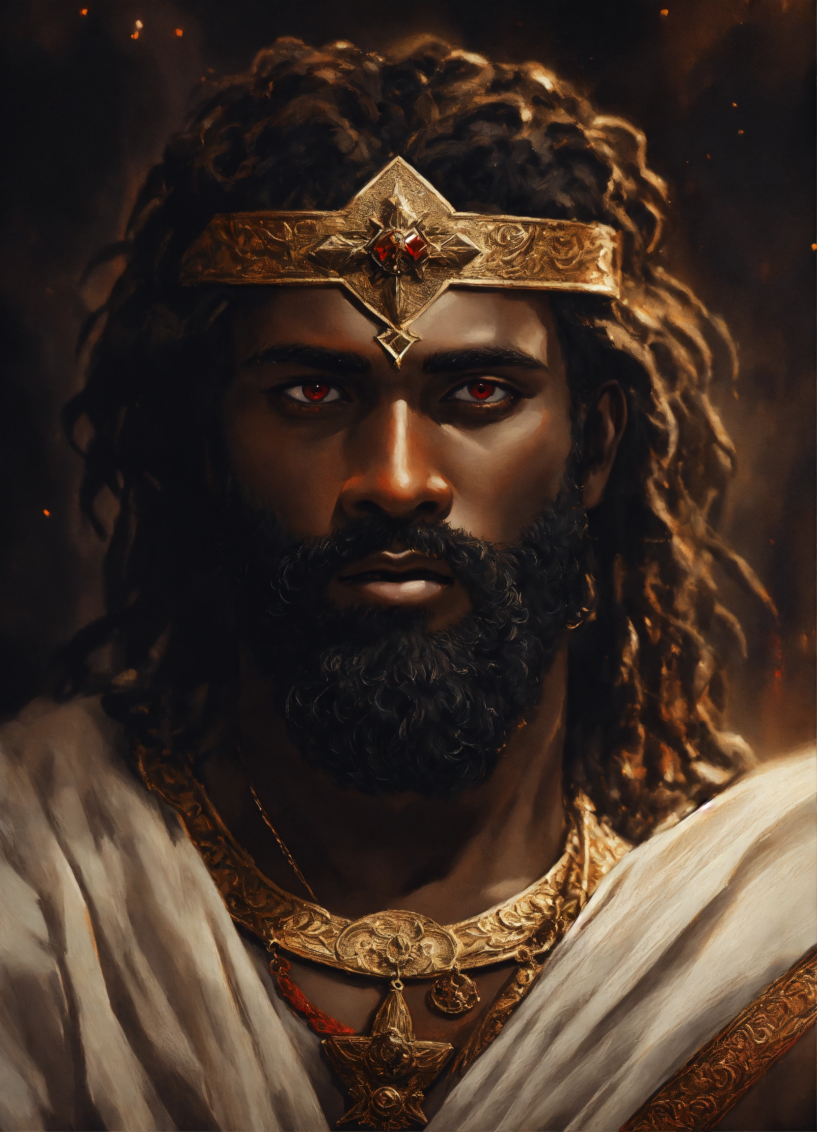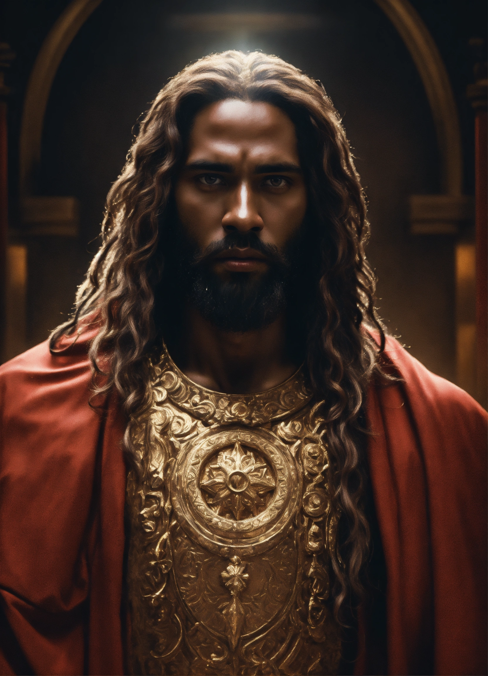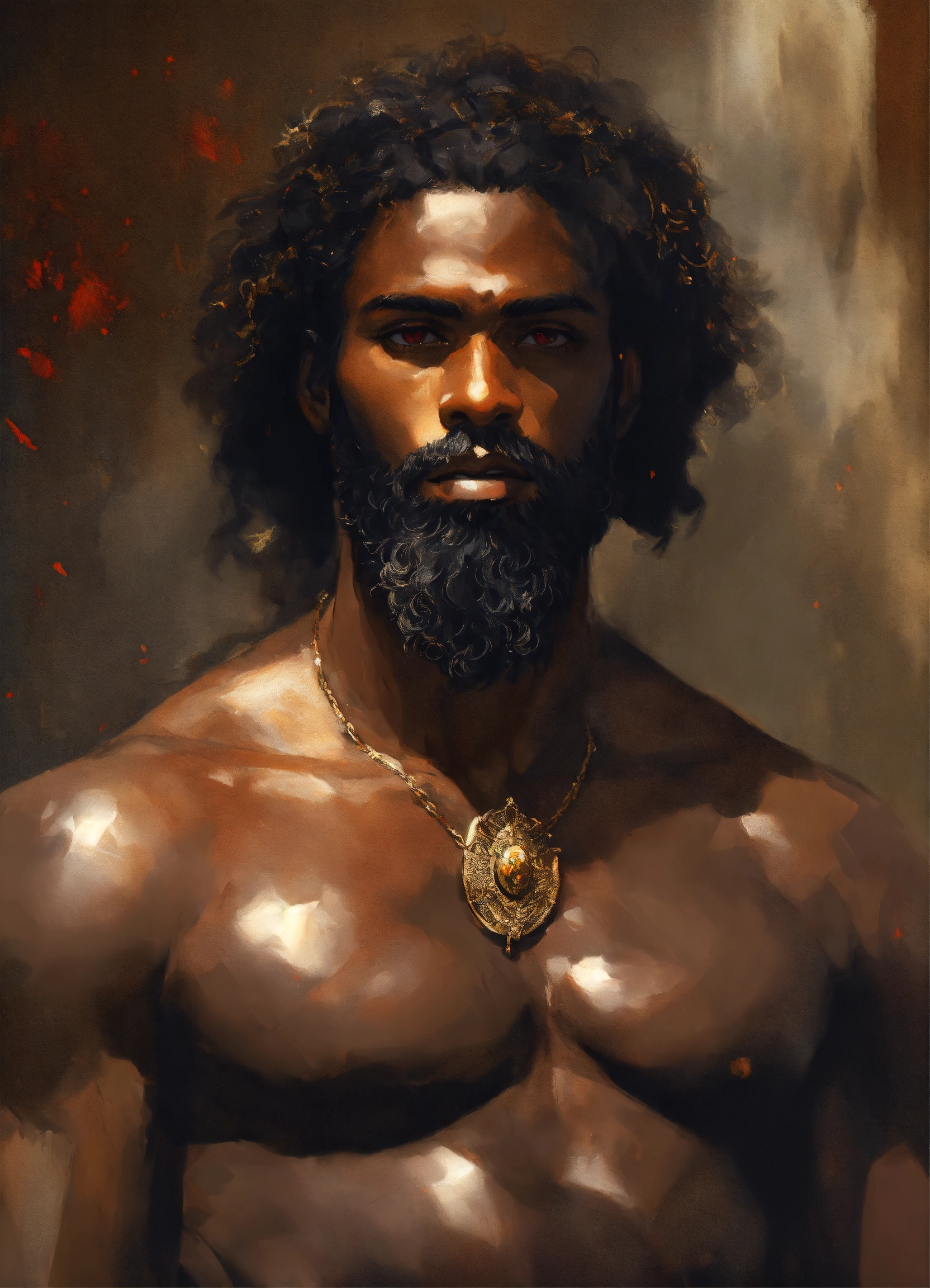 Black christ like neno brown red eyes dark skin white whooly hair and beard cinematic portrait of a god, only head and chest, exotic god features, desaturated, oil on canvas, gouache painting, masterpiece, trending on artstation, cinematic composition, dramatic pose, beautiful lighting, sharp, details, hyper-detailed, hd, 4k, 8k
