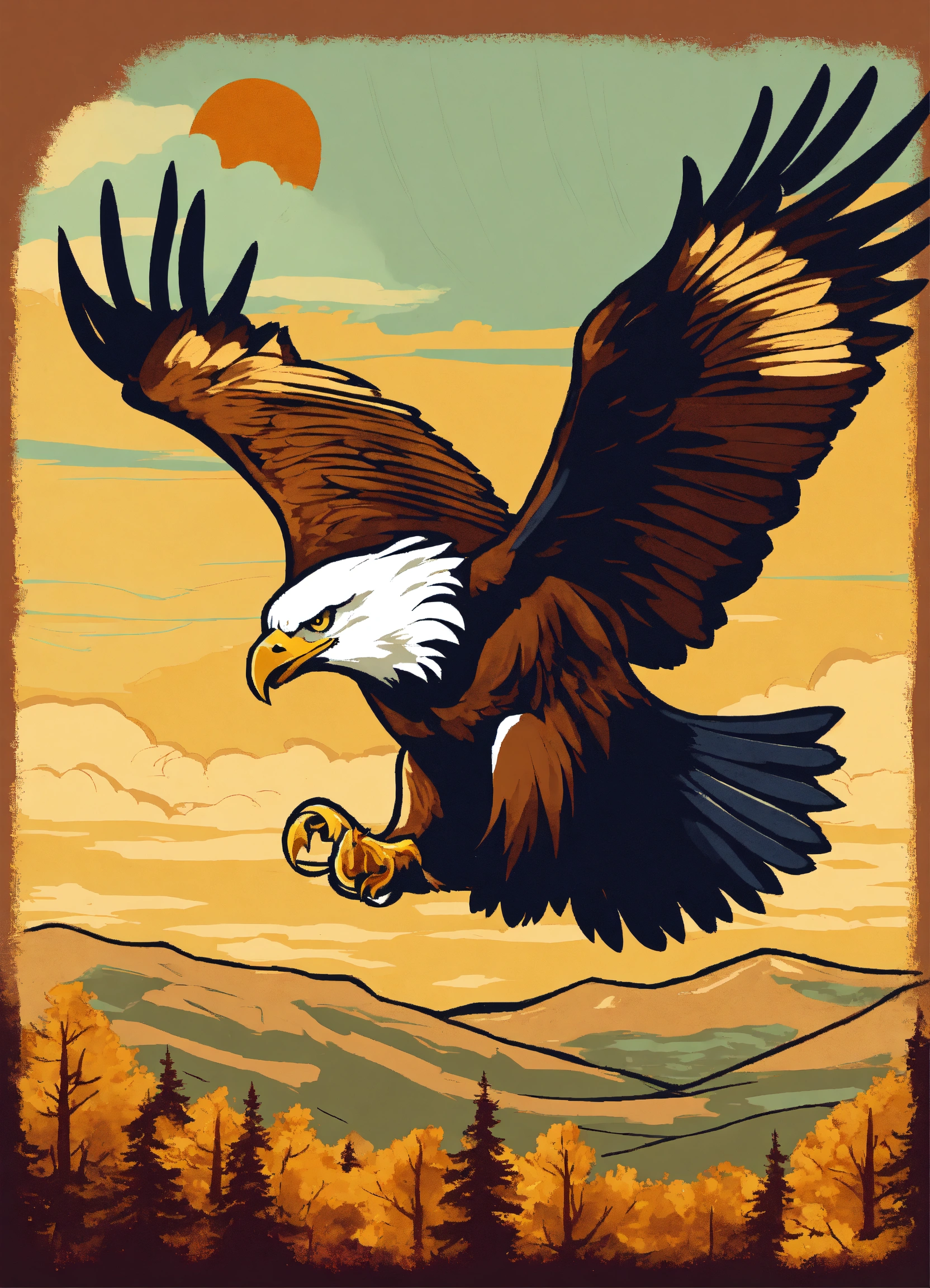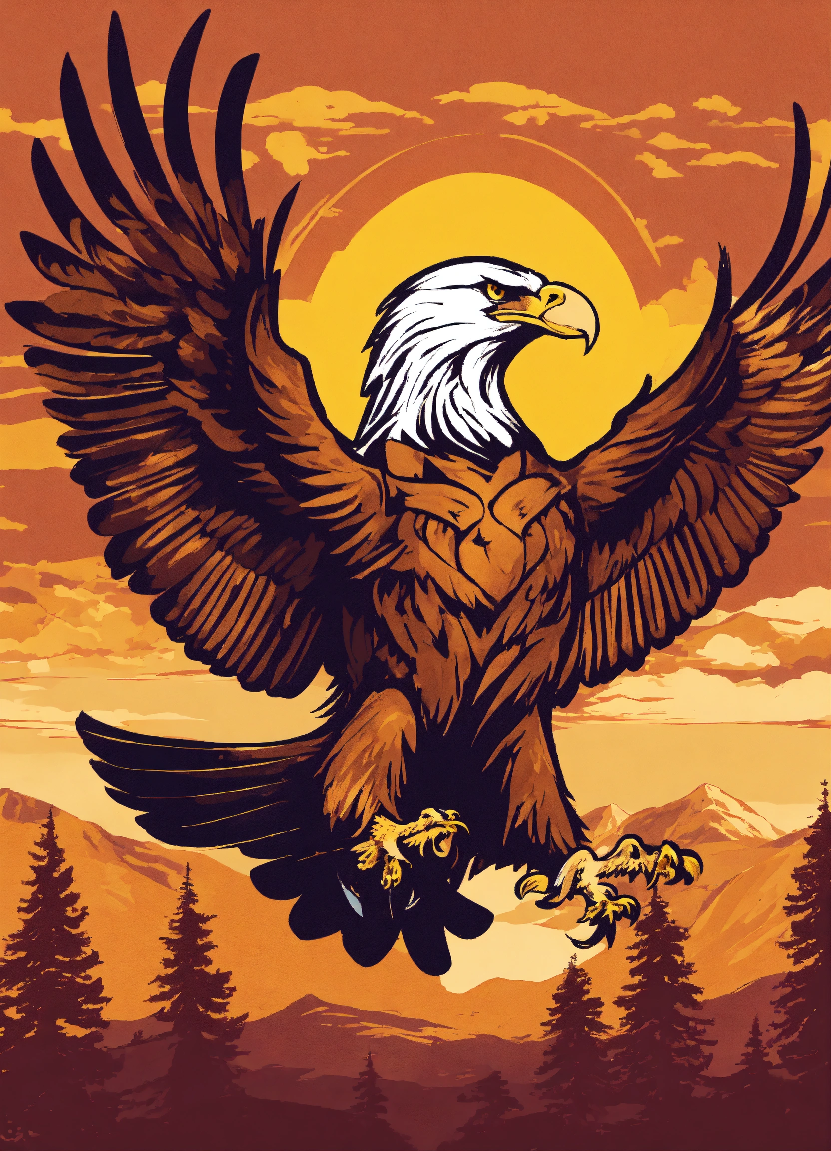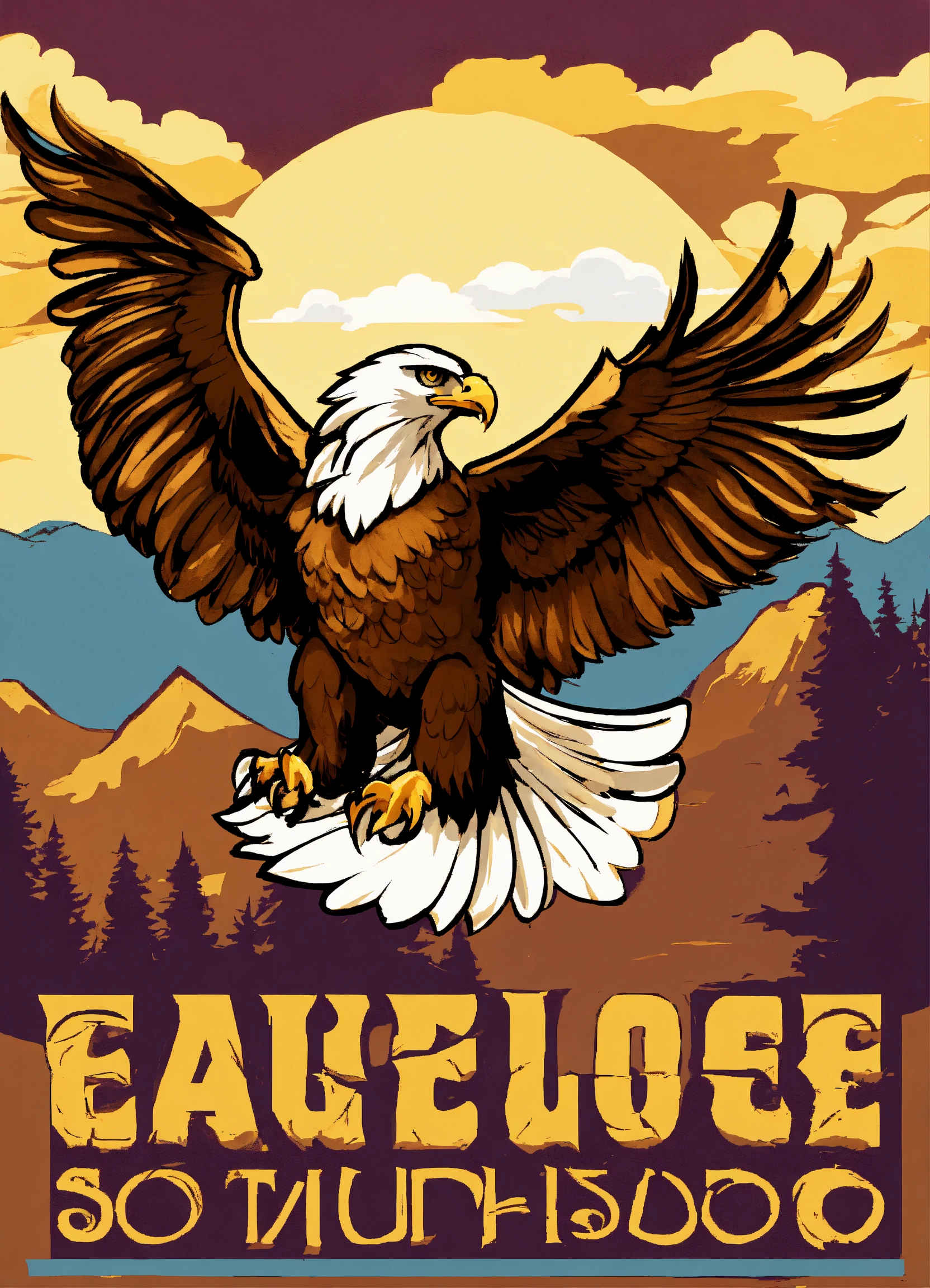 A college of southern idaho eagle, keeping with original theme colors, flying distinctively showing the wind beneath its wings. the background should be a fictional college campus. in the eagles claws is a scroll
