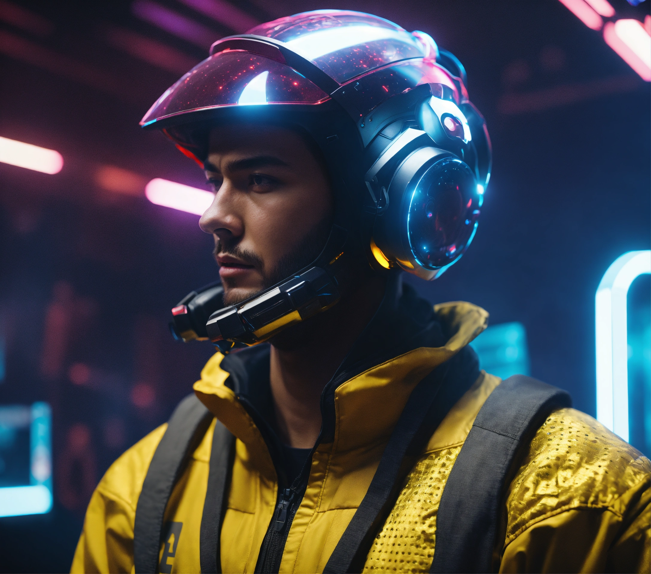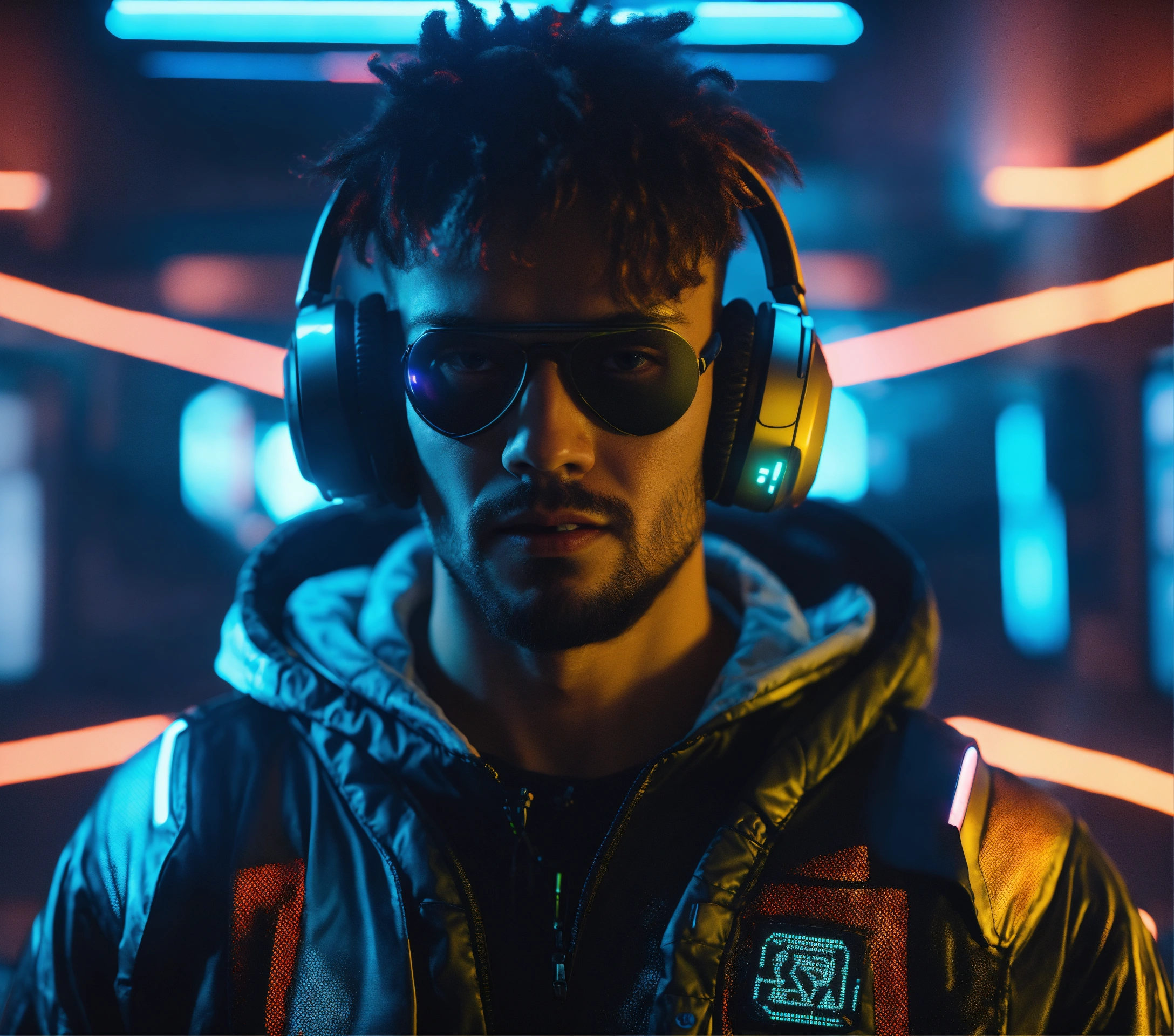 Zoom out of a futuristic mixed martial arts master and hacker, wearing a hi tech clothing and ear antenna at a rave on a space yacht, realistic, futuristic, sci fi, 8k, unreal engine